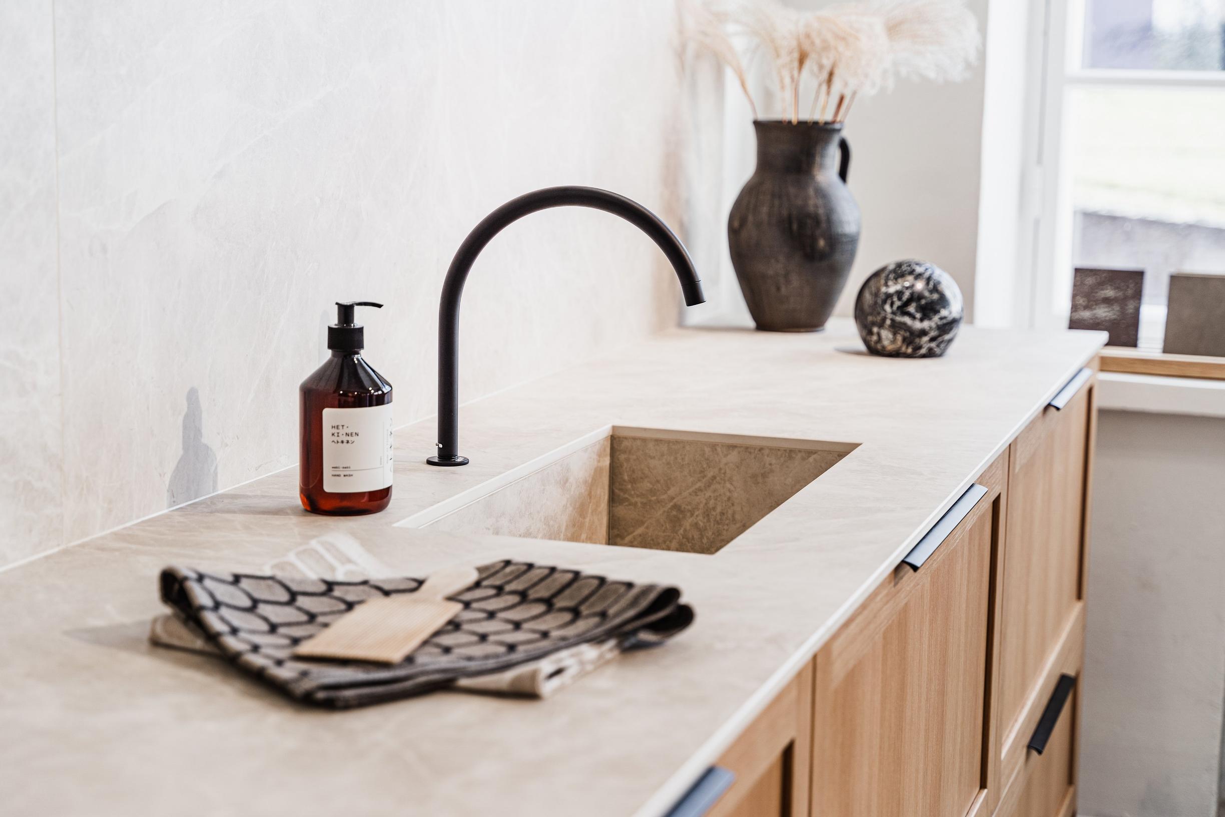 Oikeilla välineillä keraamista tasoa on helppoa työstää ja siihen voi leikata aukot esimerkiksi pesualtaalle ja hanalle sekä keittotasolle.