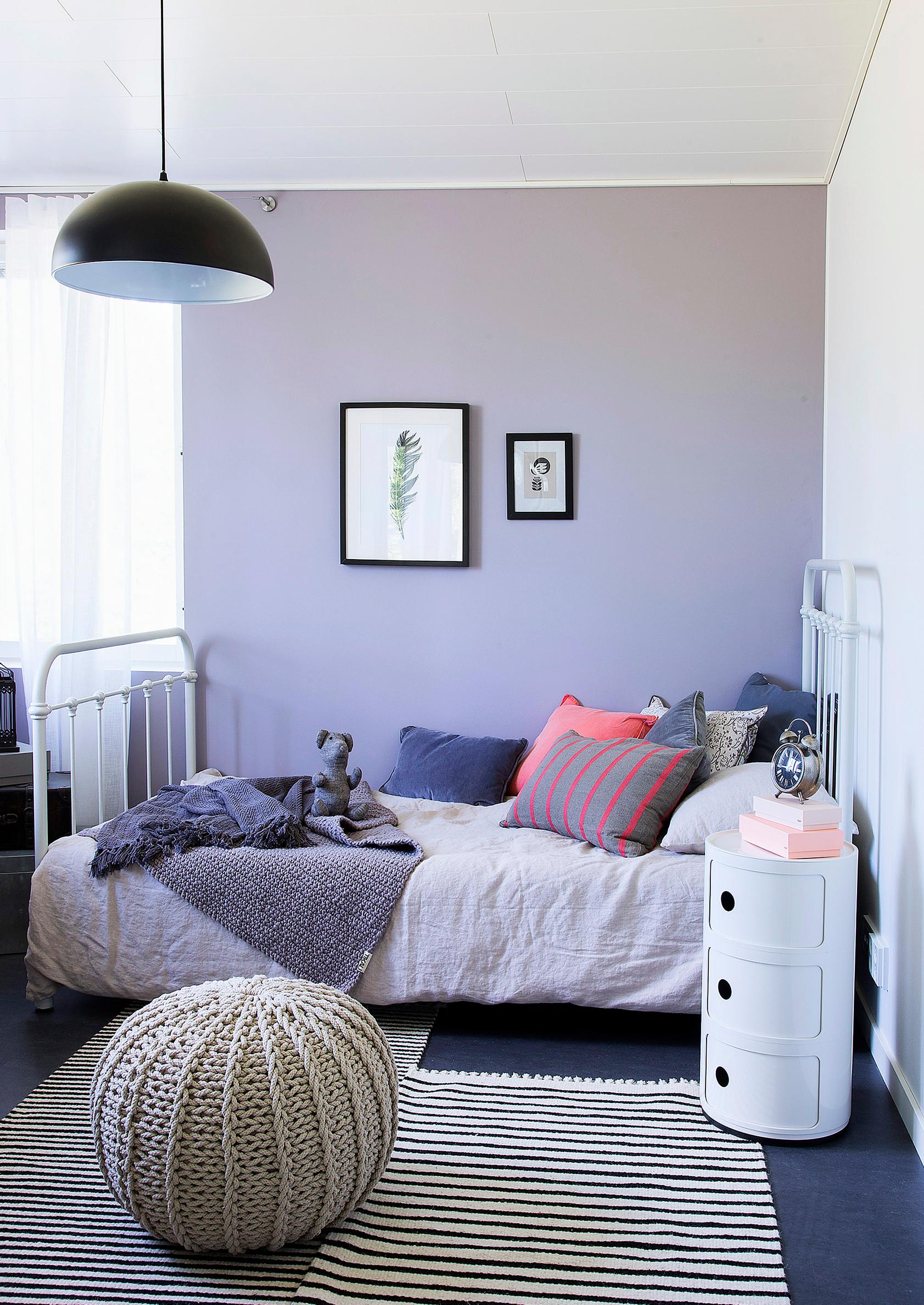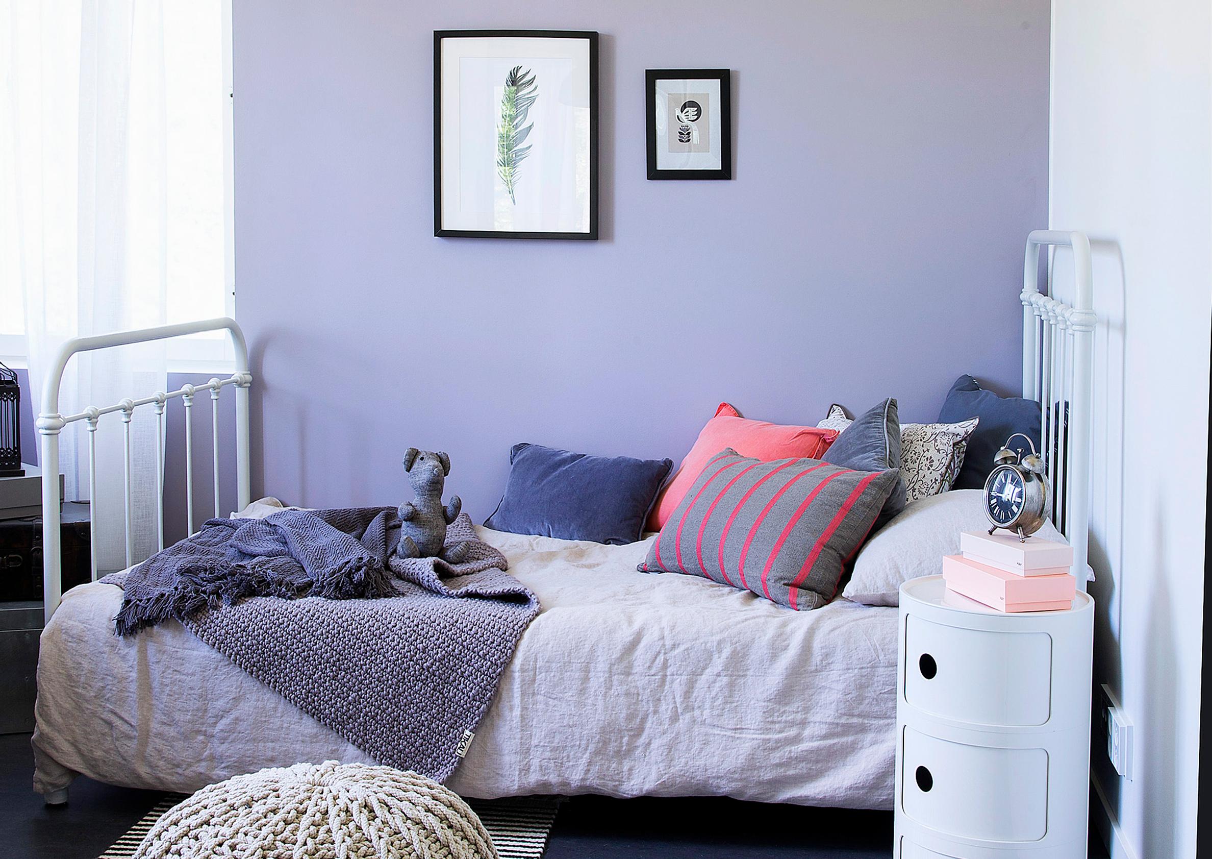 5. Seinän pehmeä sävy jatkuu tekstiileissä. Kokonaisuus sopii minkä ikäiselle tahansa ja toimii tarvittaessa myös vierashuoneena.