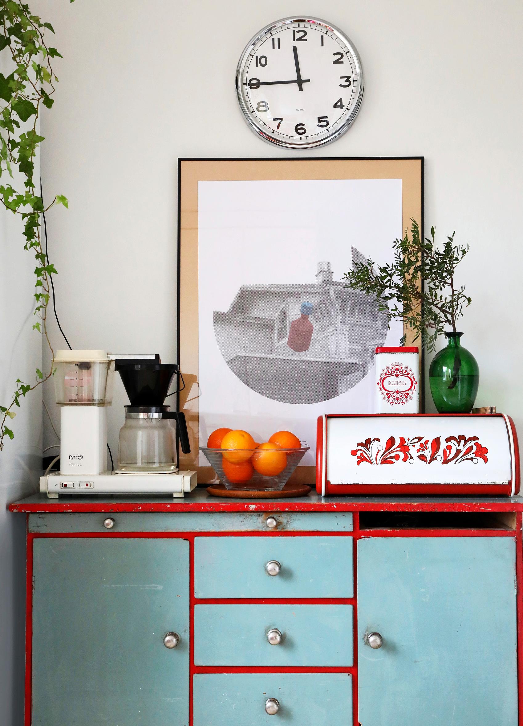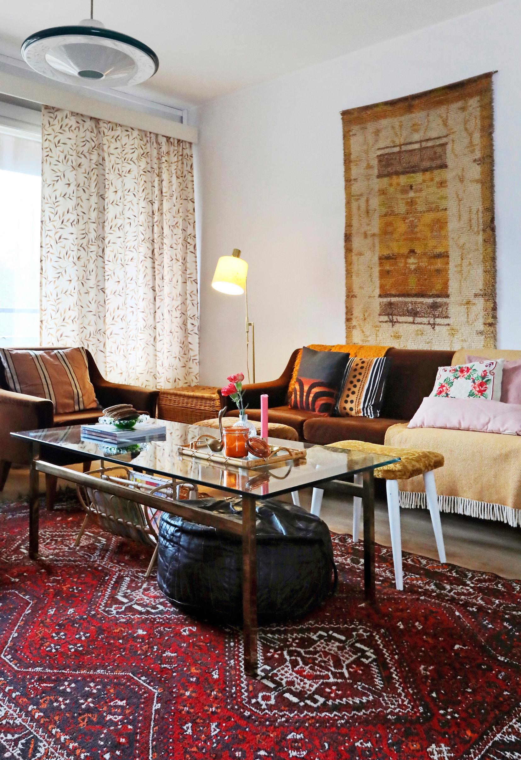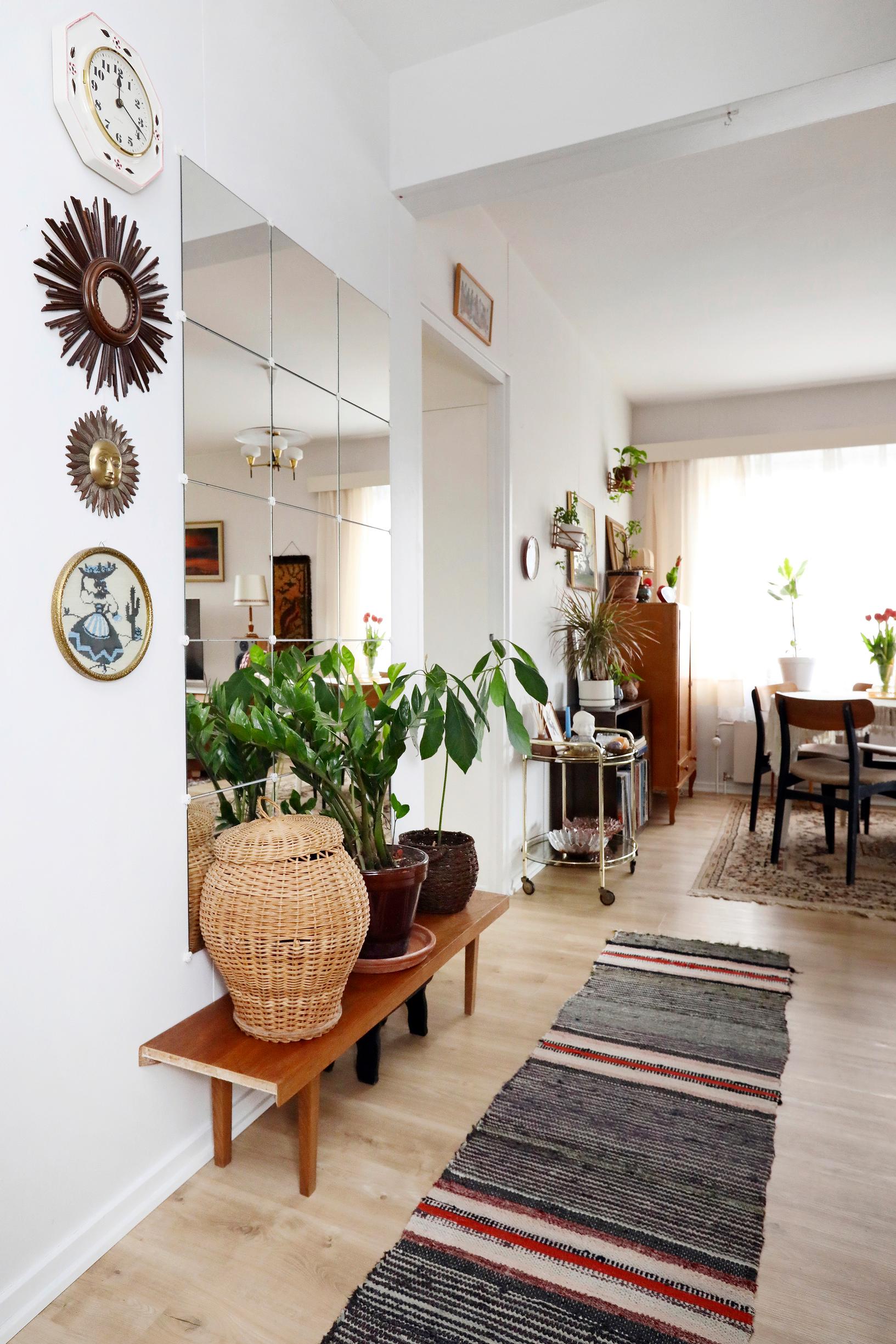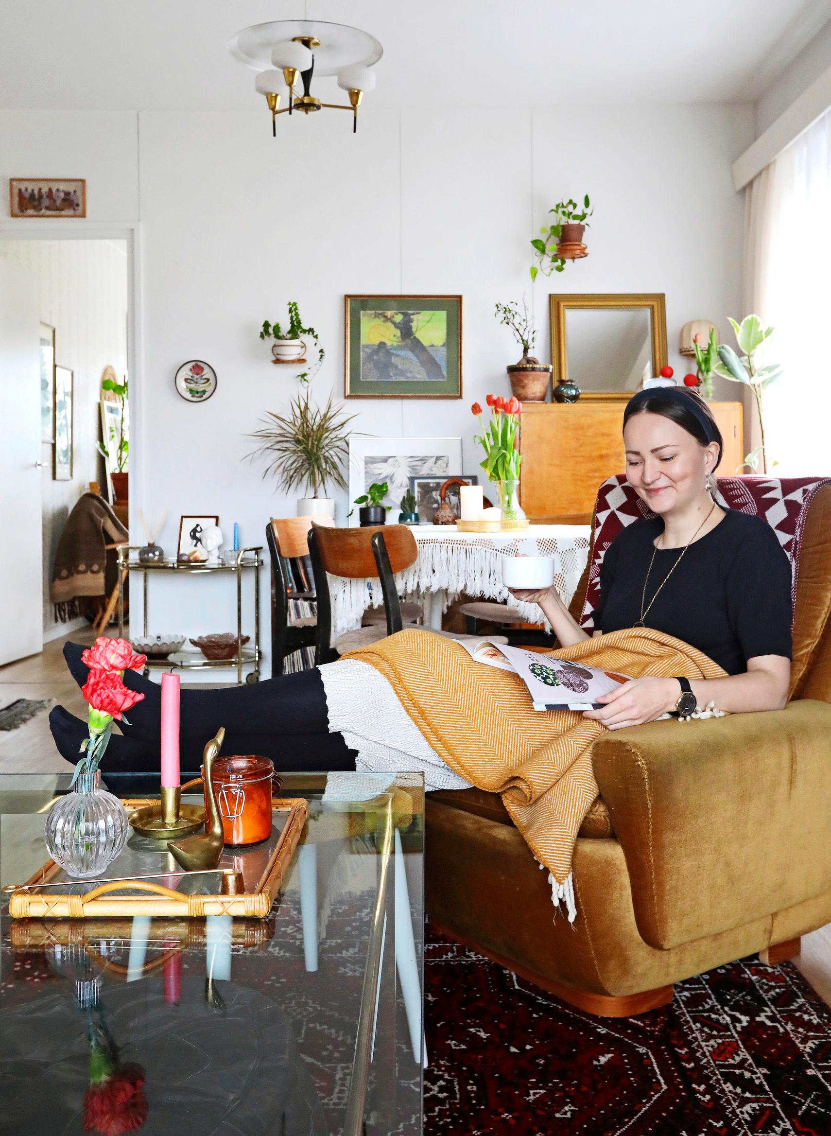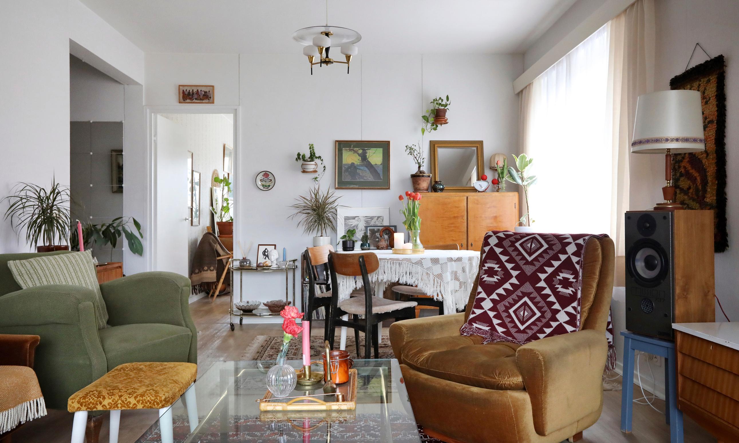 Sanni ihastui 1960-luvun kerrostalokolmion valoisaan tunnelmaan ja isoihin ikkunoihin. Ajan henkeen sopivat huonekalut ja nostalgiset esineet jatkavat huoneiston tyyliä. Lähes kaikki helsinkiläiskodin hankinnat tehdään kirppareilta, kierrätyskeskuksista ja huutokaupoista.