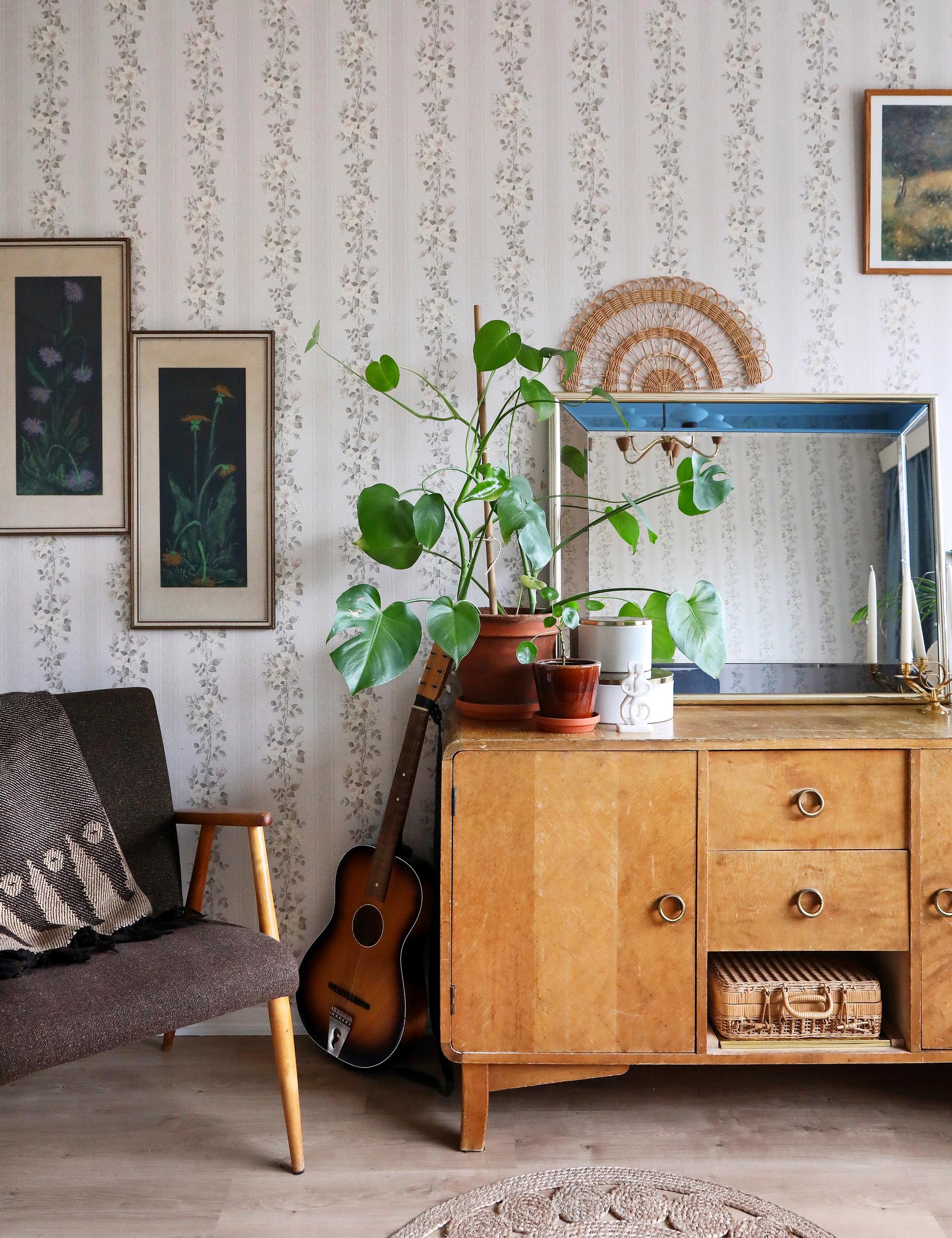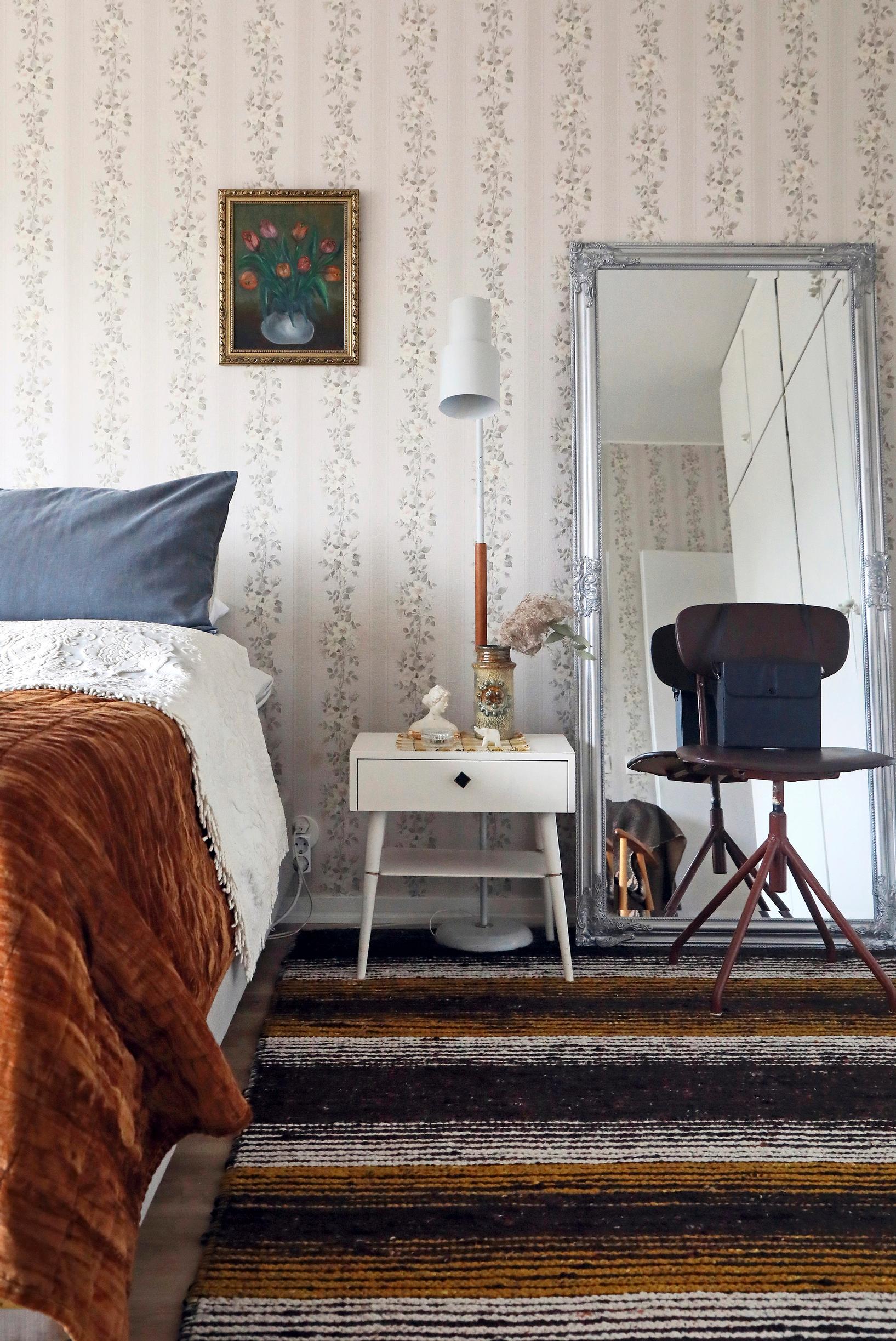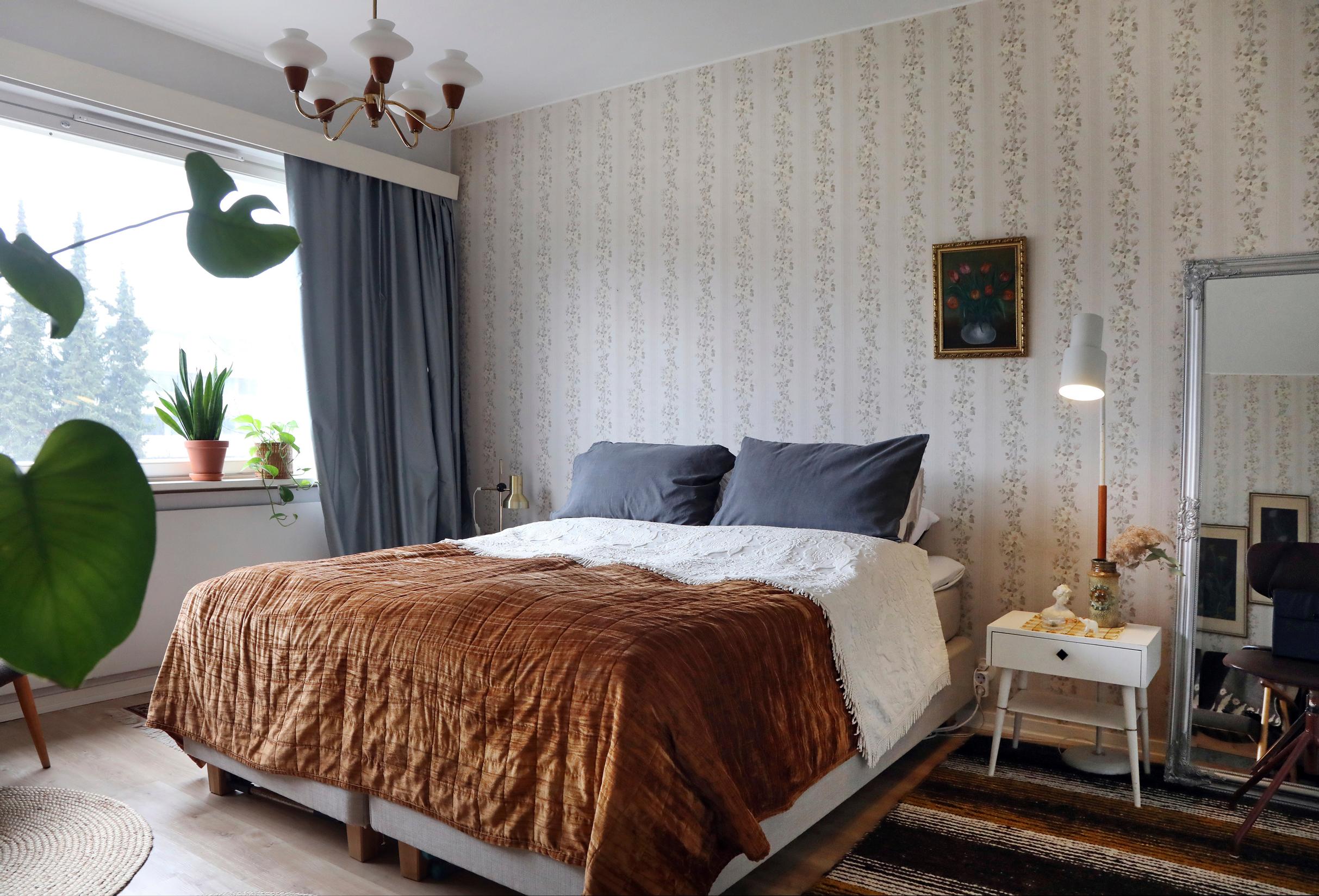 ”Tarvittiin vain lattiaremppa, sitten pääsimme jo muuttamaan. Poistimme vanhan, kärsineen muovimaton ja vaihdoimme sen vinyylilankkuun. Haluamme tehdä muutoksia harkiten ja vanhaa kunnioittaen. Keittiössä ovat esimerkiksi alkuperäiset 1960-luvun kaapistot, jotka ovat hieman epäergonomiset mutta täysin toimivat. Erityisen ihastuneita olemme makuuhuoneen vanhaan kukkatapettiin. Se sopii tyyliimme täydellisesti.