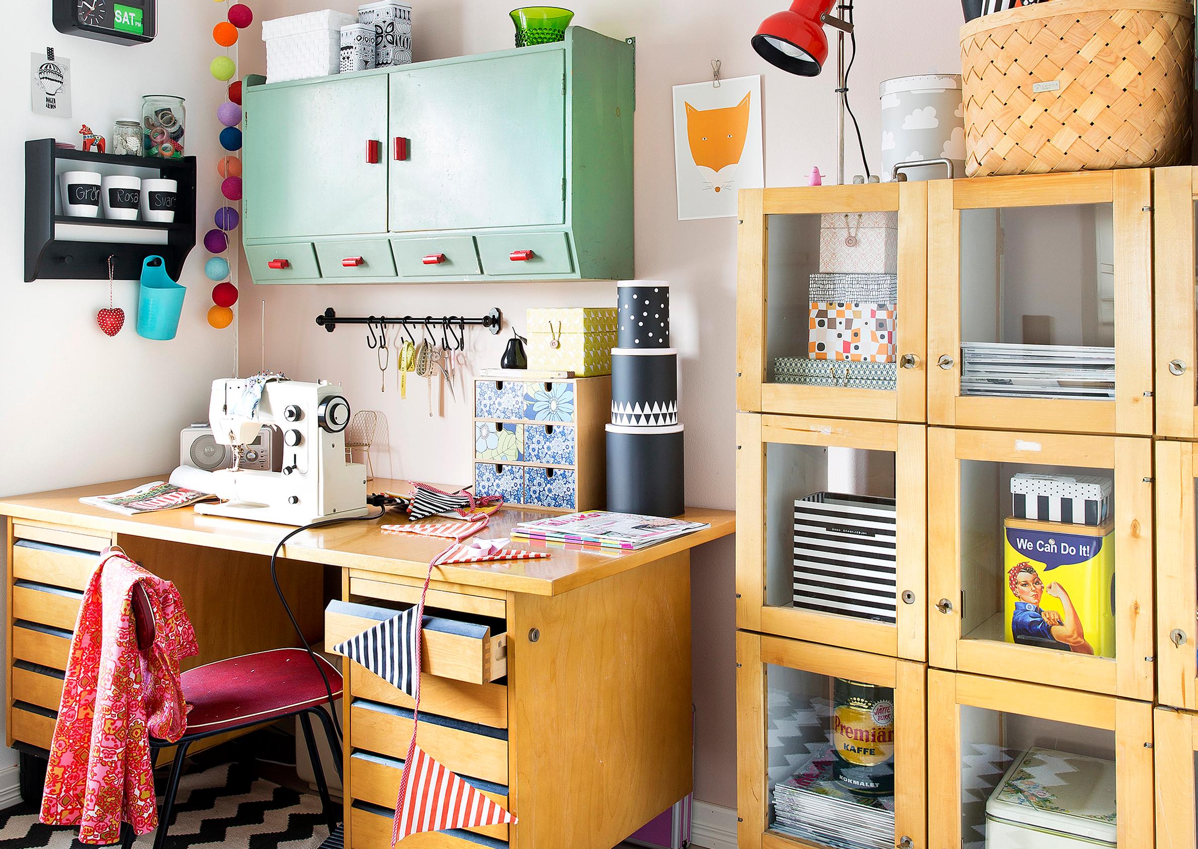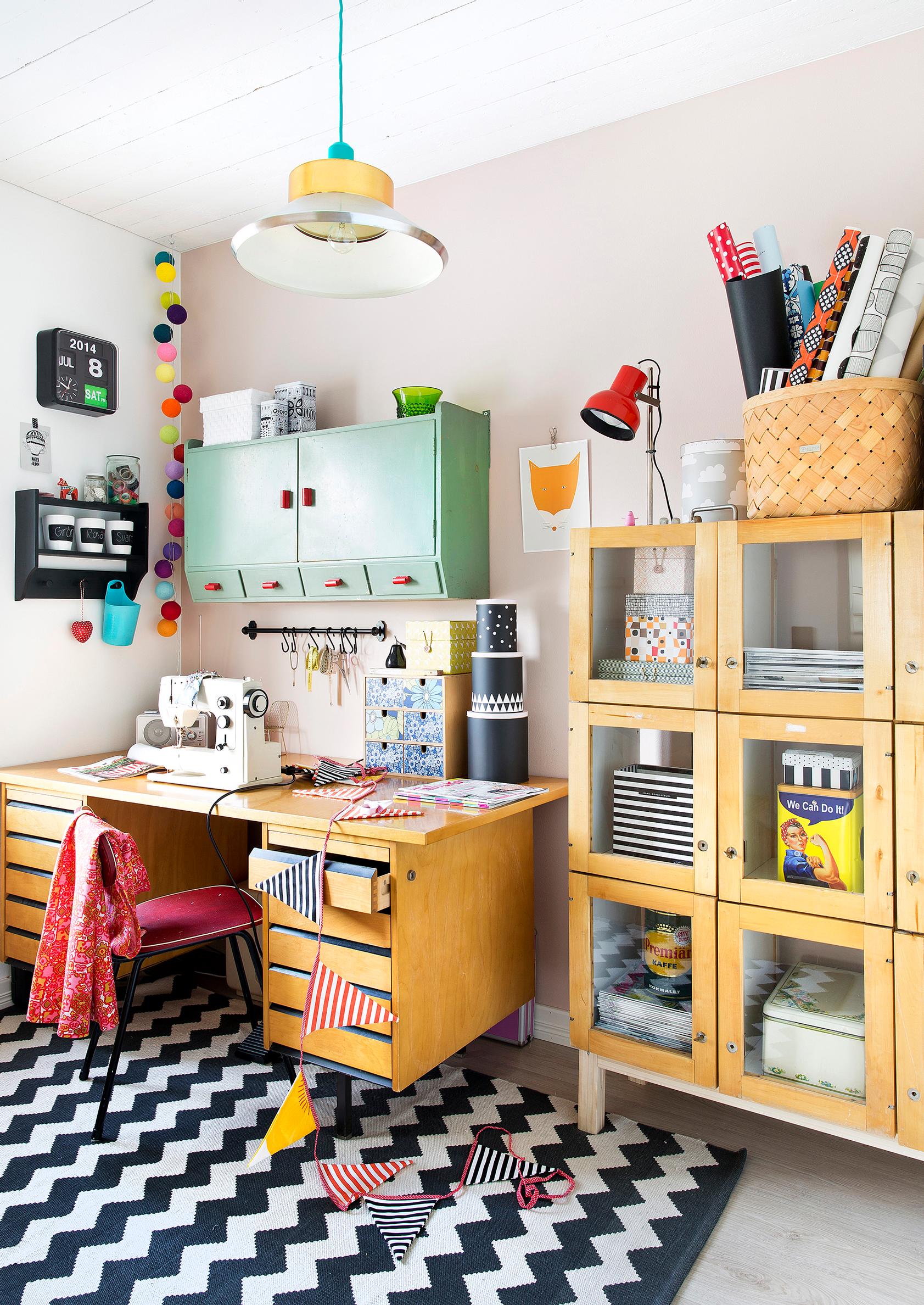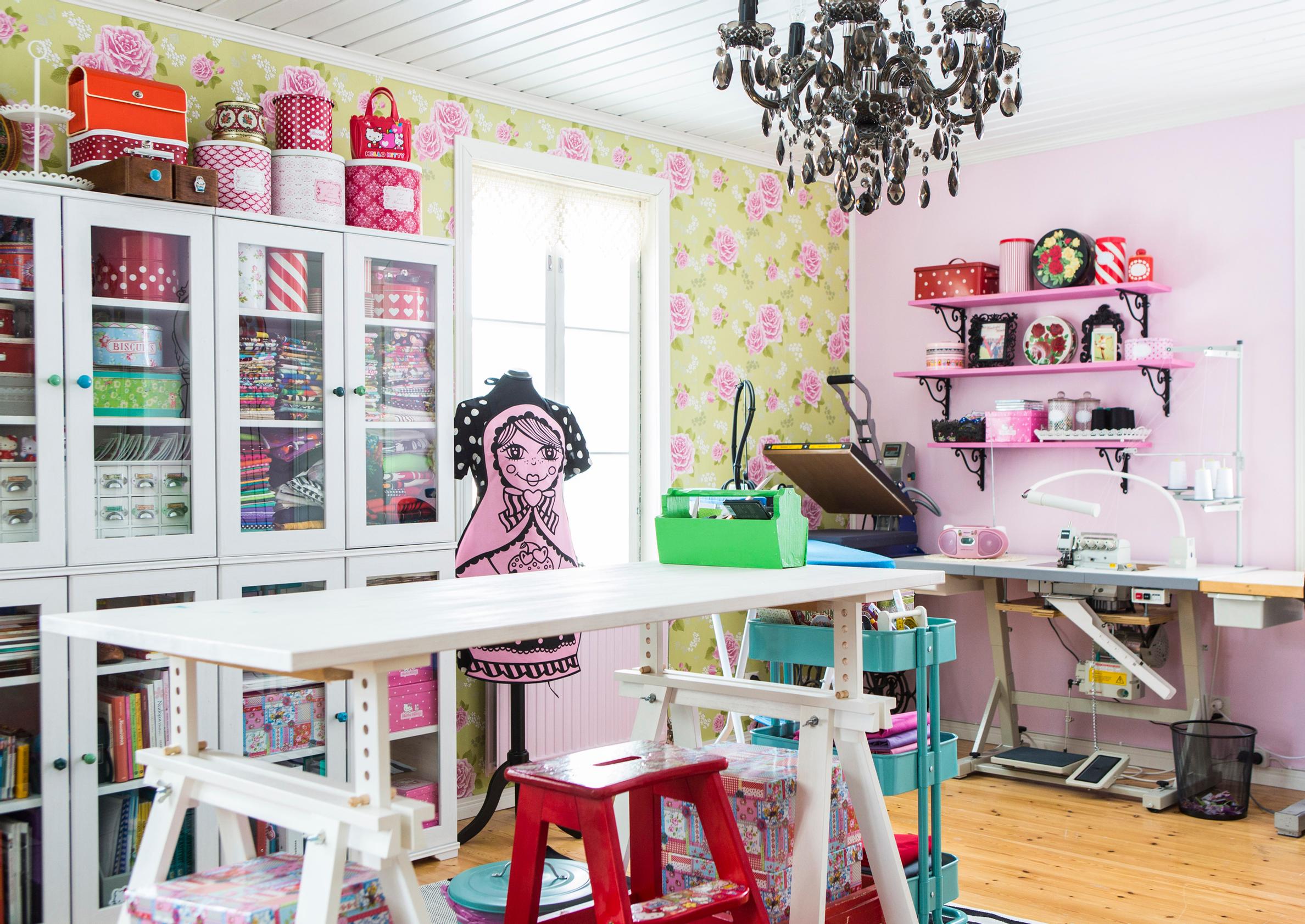 3. Käsityöläisen kodissa pitää olla oma tilansa ompelulle ja tarvikkeille. Säädettävillä pukkijaloilla lepäävää työtasoa on helppo nostaa ja laskea. Kankaat, kirjat ja tarvikkeet ovat käden ulottuvilla lasiovien takana. Iloiseksi maalatussa työkalupakissa tarvikkeet kulkevat mukana vaikka ompelukoneen ääreen.