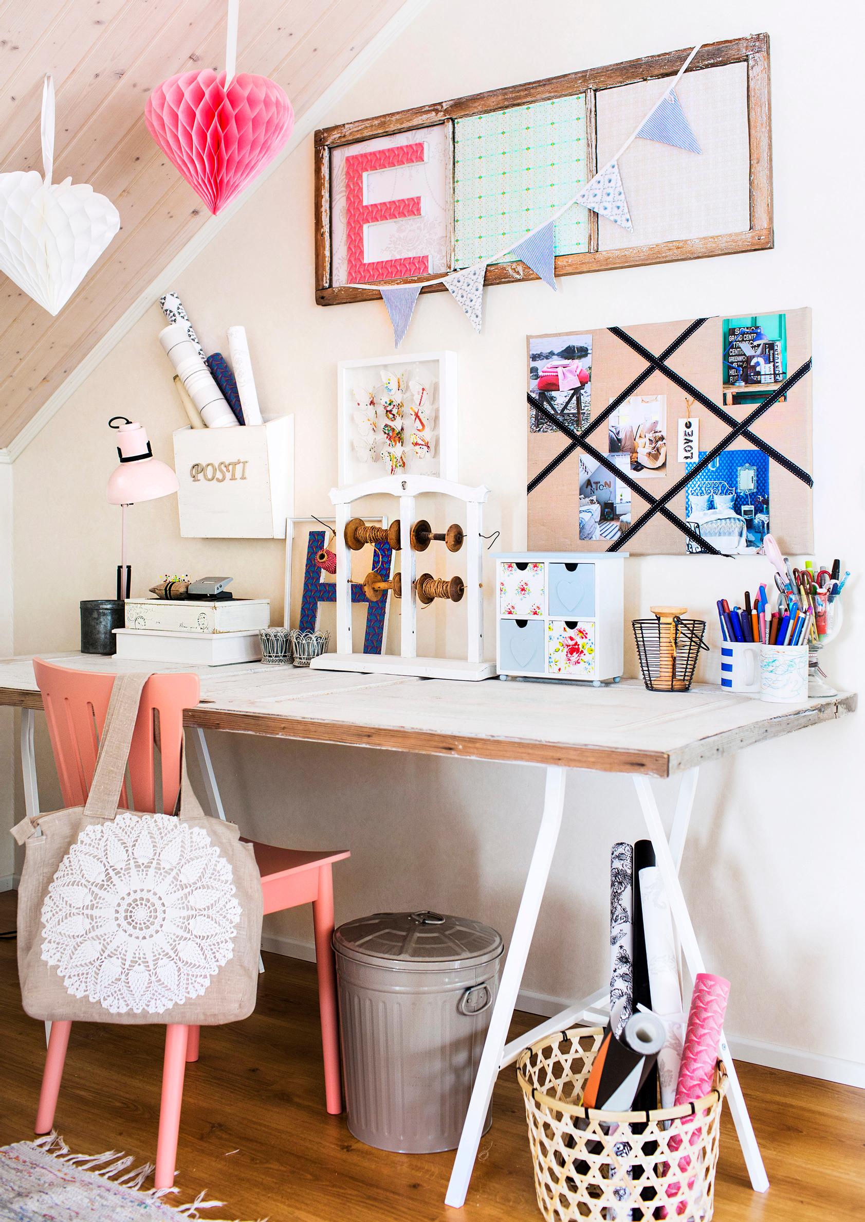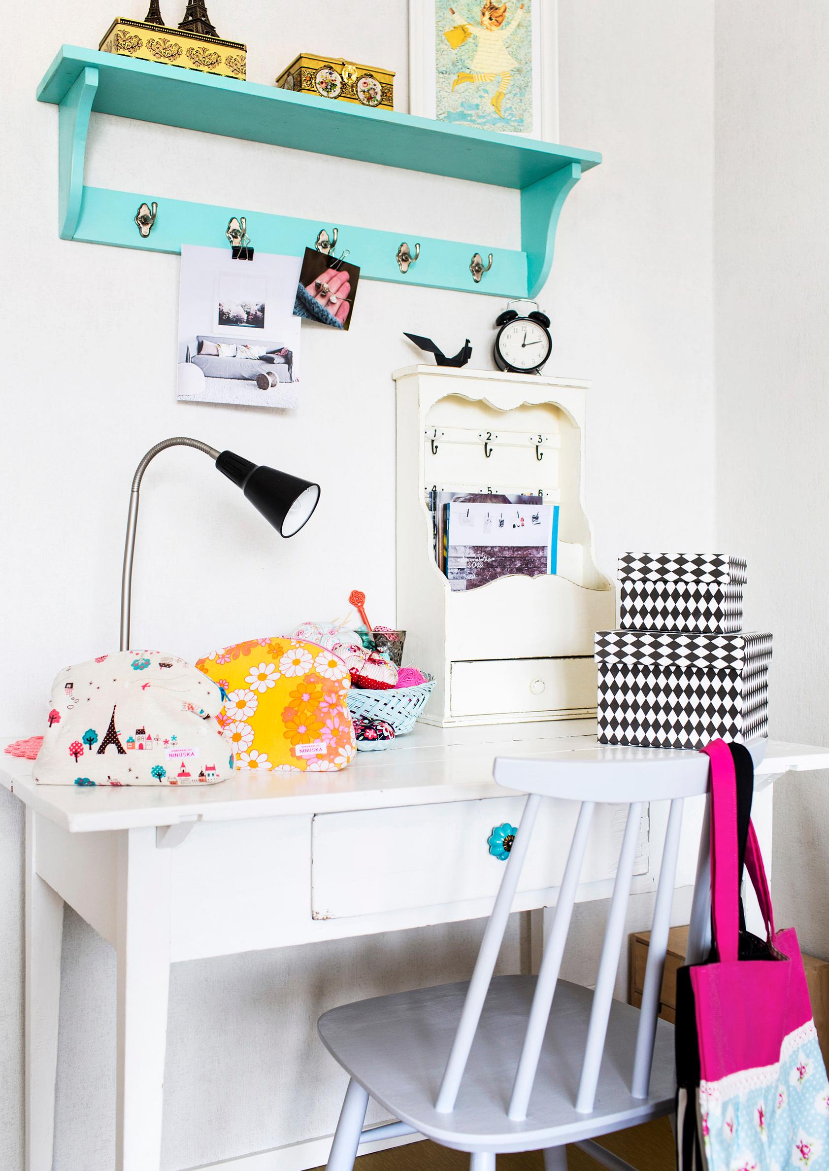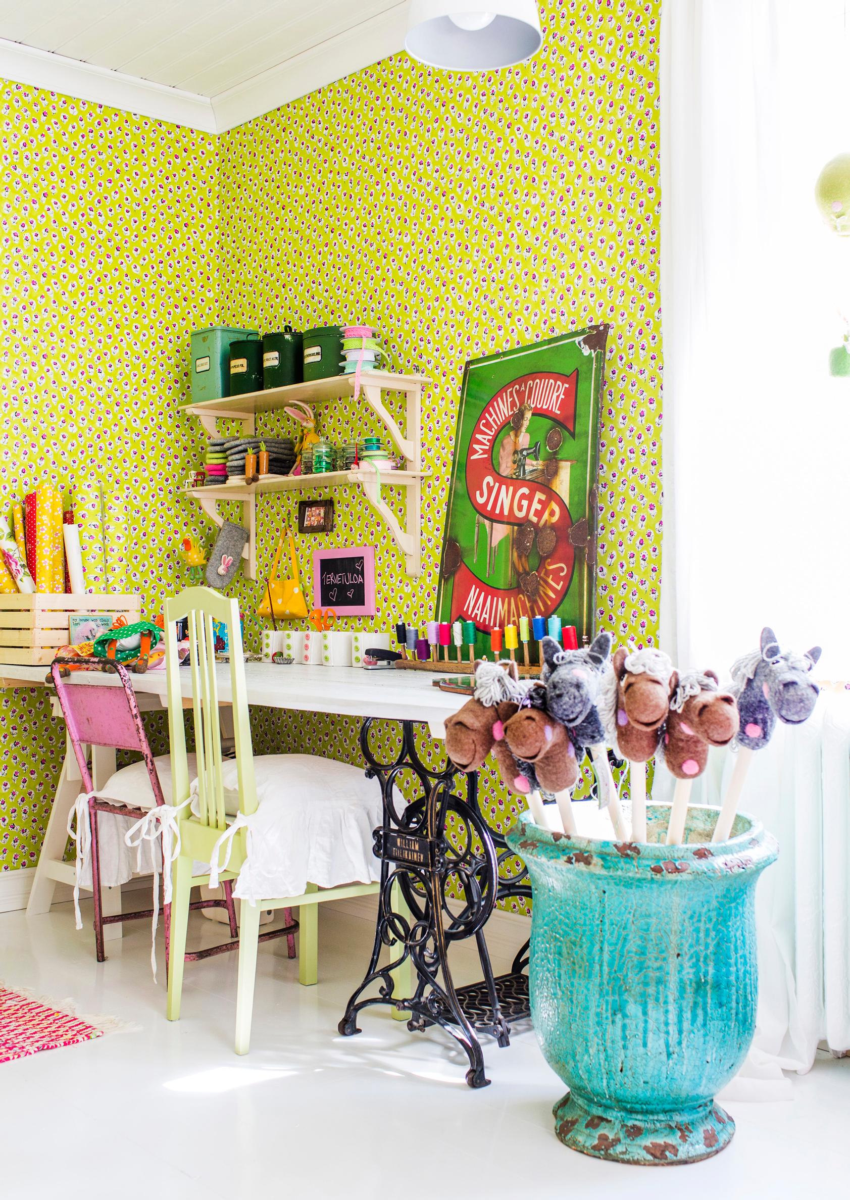 2. Iloiset värit tekevät työhuoneen tunnelmasta lystikkään. Pöytätaso lepää Ikean pukkijalan ja vanhan ompelukoneenjalan varassa. Näppärä lankateline on nikkaroitu puupalasta ja tapeista.