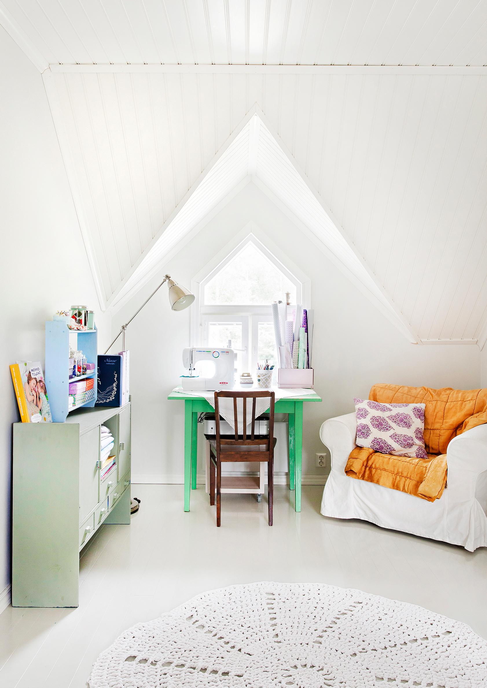 4. Yläkerran aulassa taitekaton alla on juuri sopiva kolo pienelle työpisteelle. Ompelukone on aina käyttövalmiina pöydällä, ja inspiraatiota odottelevat kankaat on viikattu kauniisti kaappiin. Nojatuolissa on leppoisaa hautoa uusia suunnitelmia.