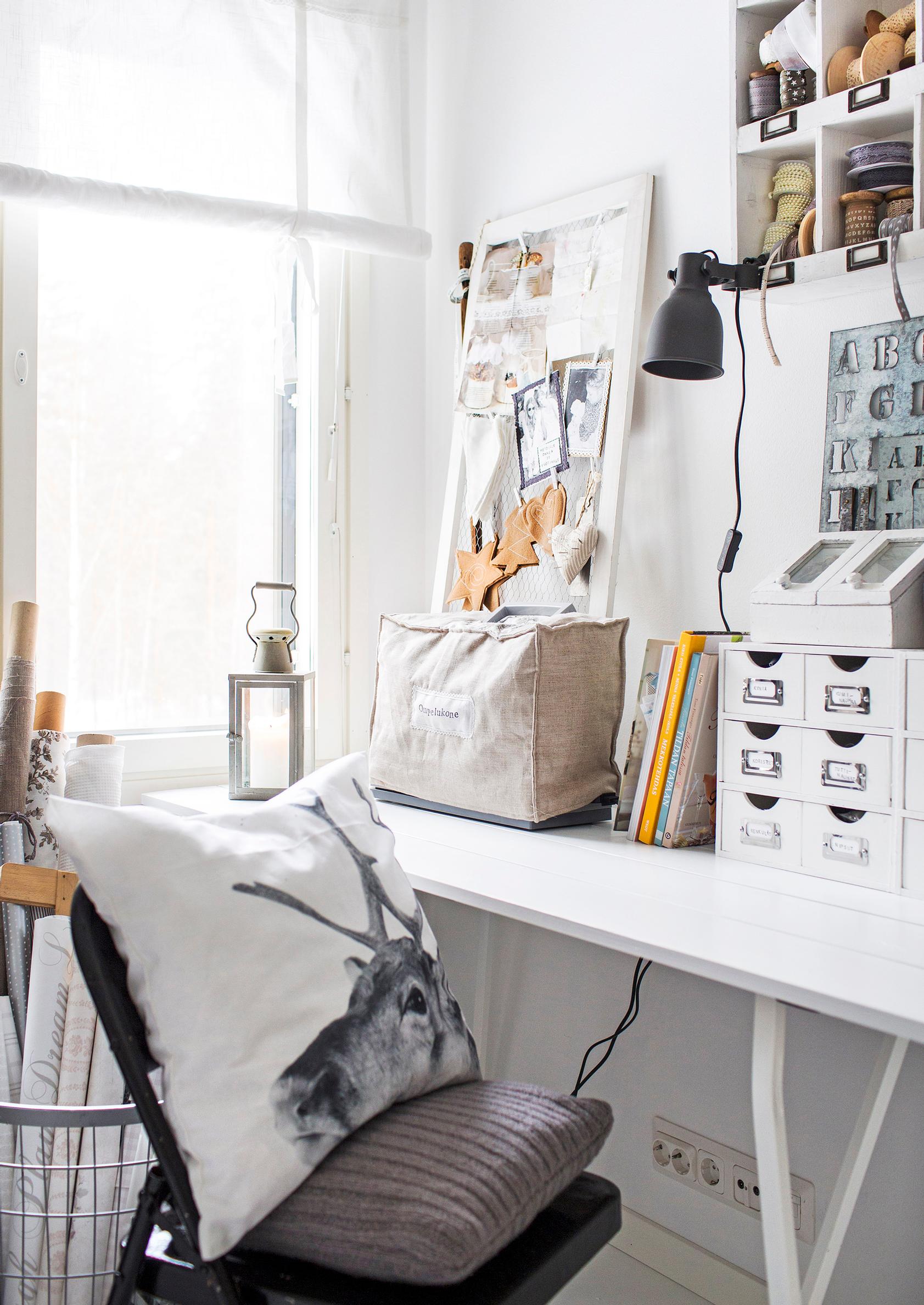 7. Siisti ompelupiste mahtuu pieneen tilaan. Ompelukone piiloutuu itse tehdyn pellavahupun alle. Hauska inspiraatiotaulu on tehty vanhaan ikkunankehykseen pingottamalla siihen kanaverkko.