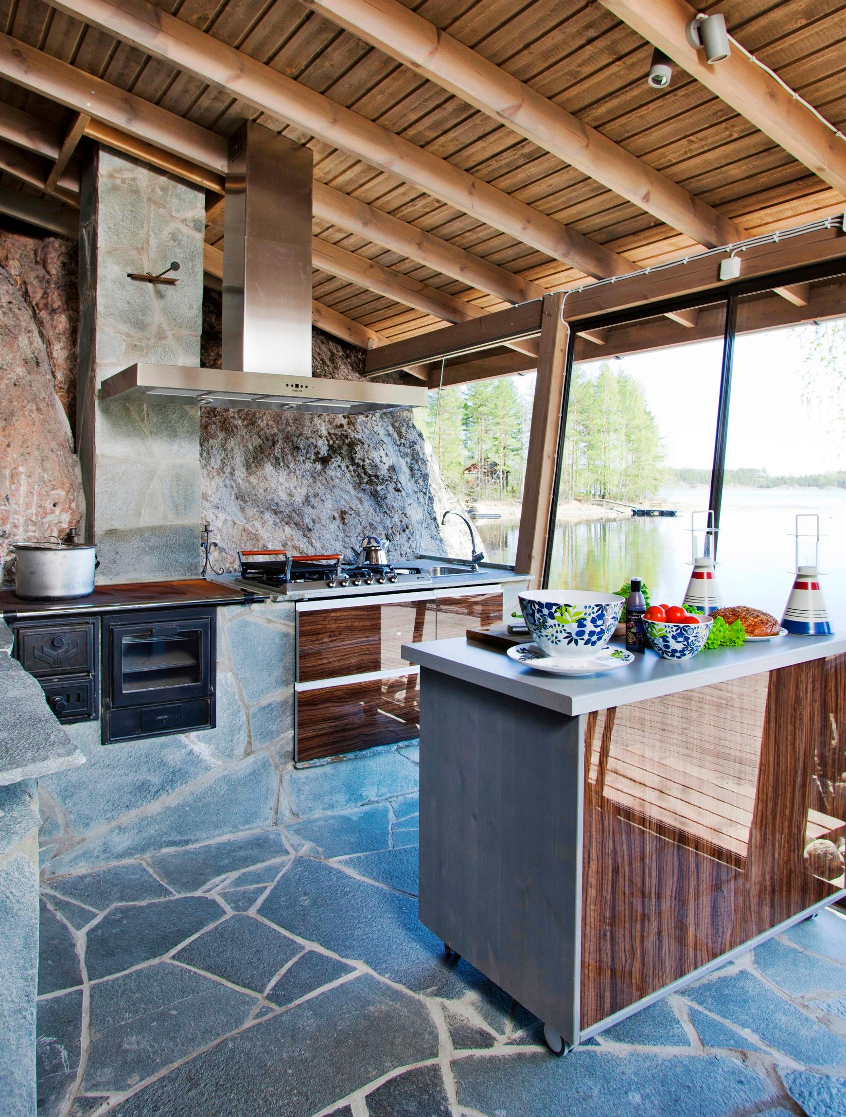 Ulkotiloissa voi käyttää reilusti rouheita materiaaleja. Kaapit ja hyllyt syntyvät karheista laudoista, ja paksun työtason voi valaa betonista. Tai miten olisi käytännöllinen ruostumaton teräs? Olennaista on sään- ja pakkasenkestävyys. Irtonaiset osat voi tarvittaessa siirtää talveksi suojaan.