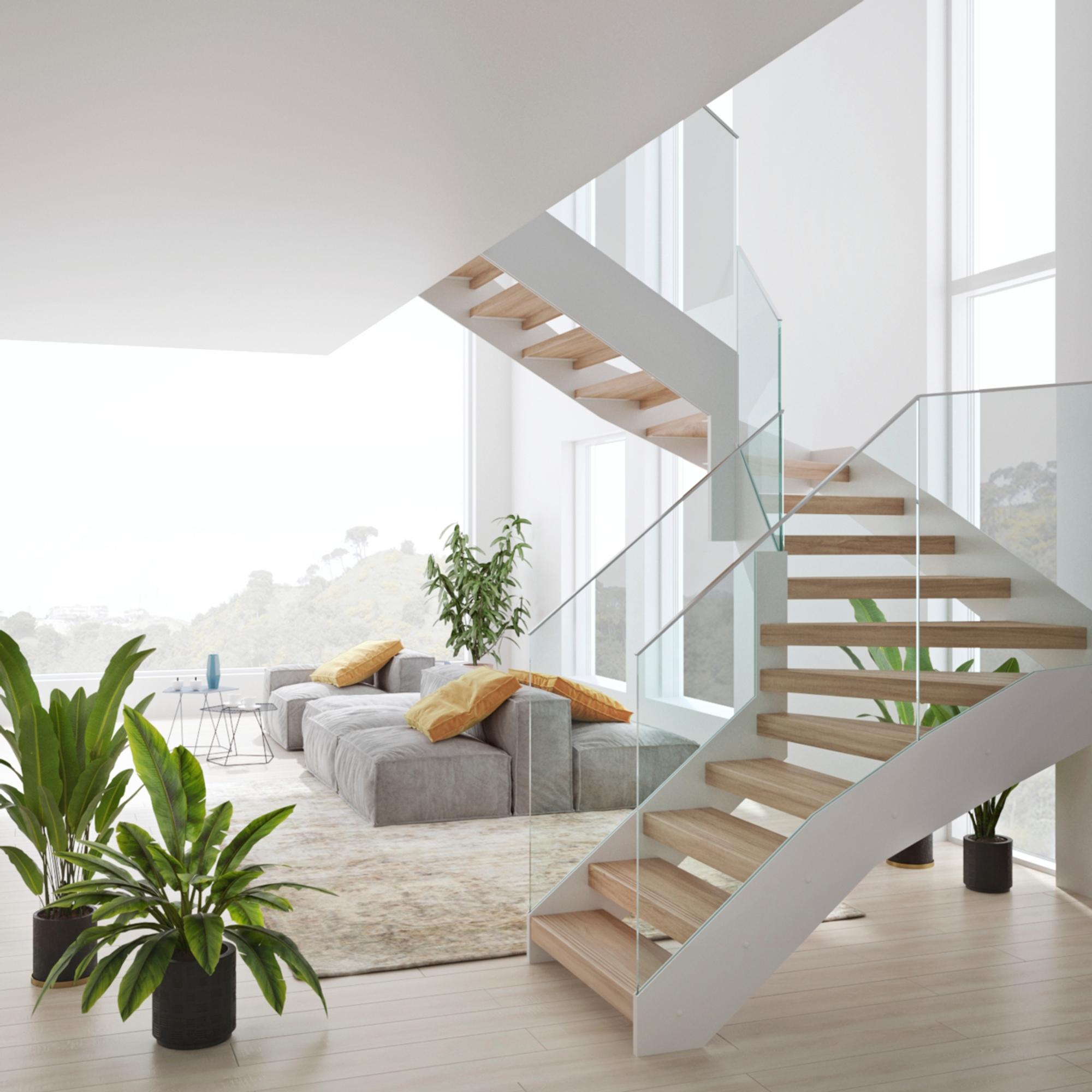 Kun haluat turvallisen, mutta mahdollisimman ilmavan ratkaisun, lasikaiteet voivat olla juttusi. Lasiseinät jättävät tilaa itse portaille, jolloin rungon ja askelmien väri ja muoto korostuvat. Lasi sopii hyvin niin tummien kuin vaaleidenkin portaiden pariksi. Hosetin Itza-portaat voivat olla suorat tai kiertävät, lepotasolla tai ilman.