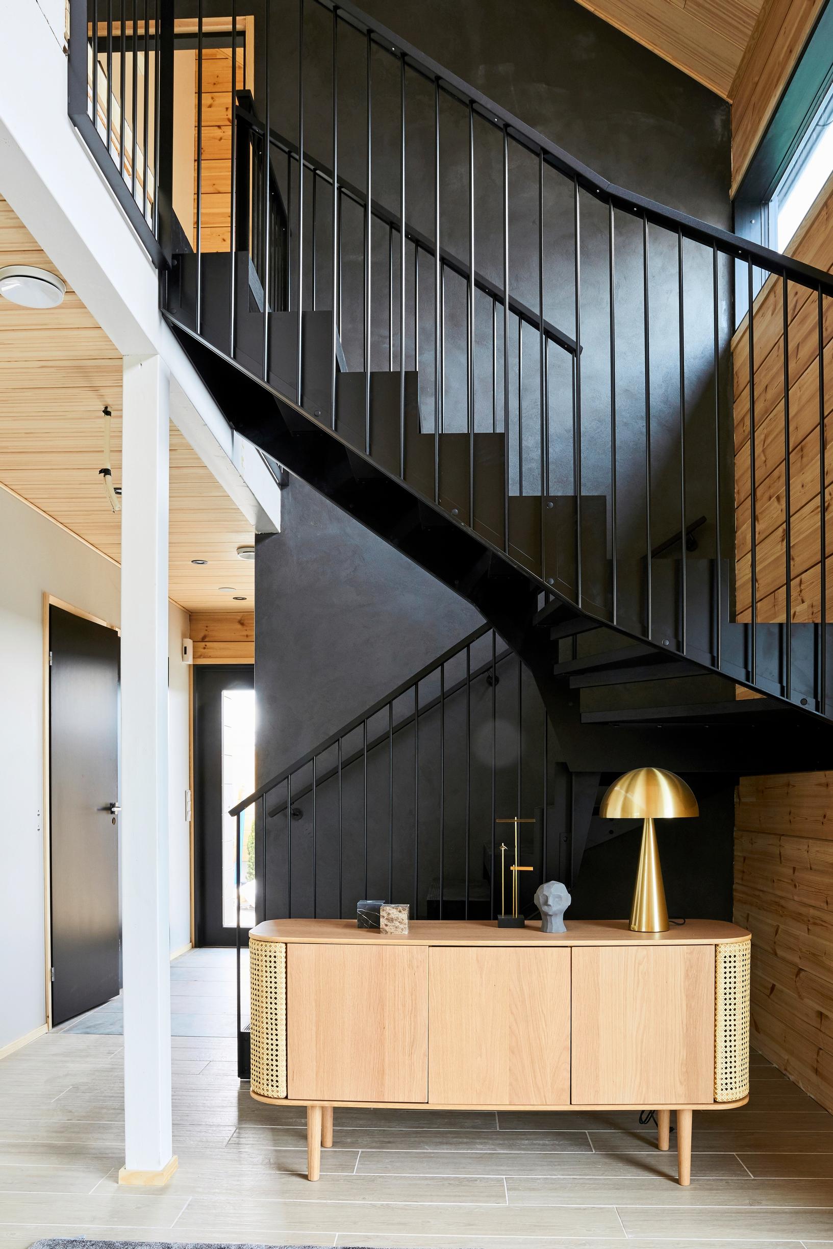 Vaikka portaat ovatkin kauniit, niiden ei tarvitse olla huutomerkkinä aulassa tai olohuoneessa. Upea tumma seinä ja tyylikkäät teräsportaat sulautuvat täydellisesti toisiinsa. Modernit pinnakaiteiset portaat ovat Gradon ja efektiseinä Suomen Betonileimasimen valikoimasta.