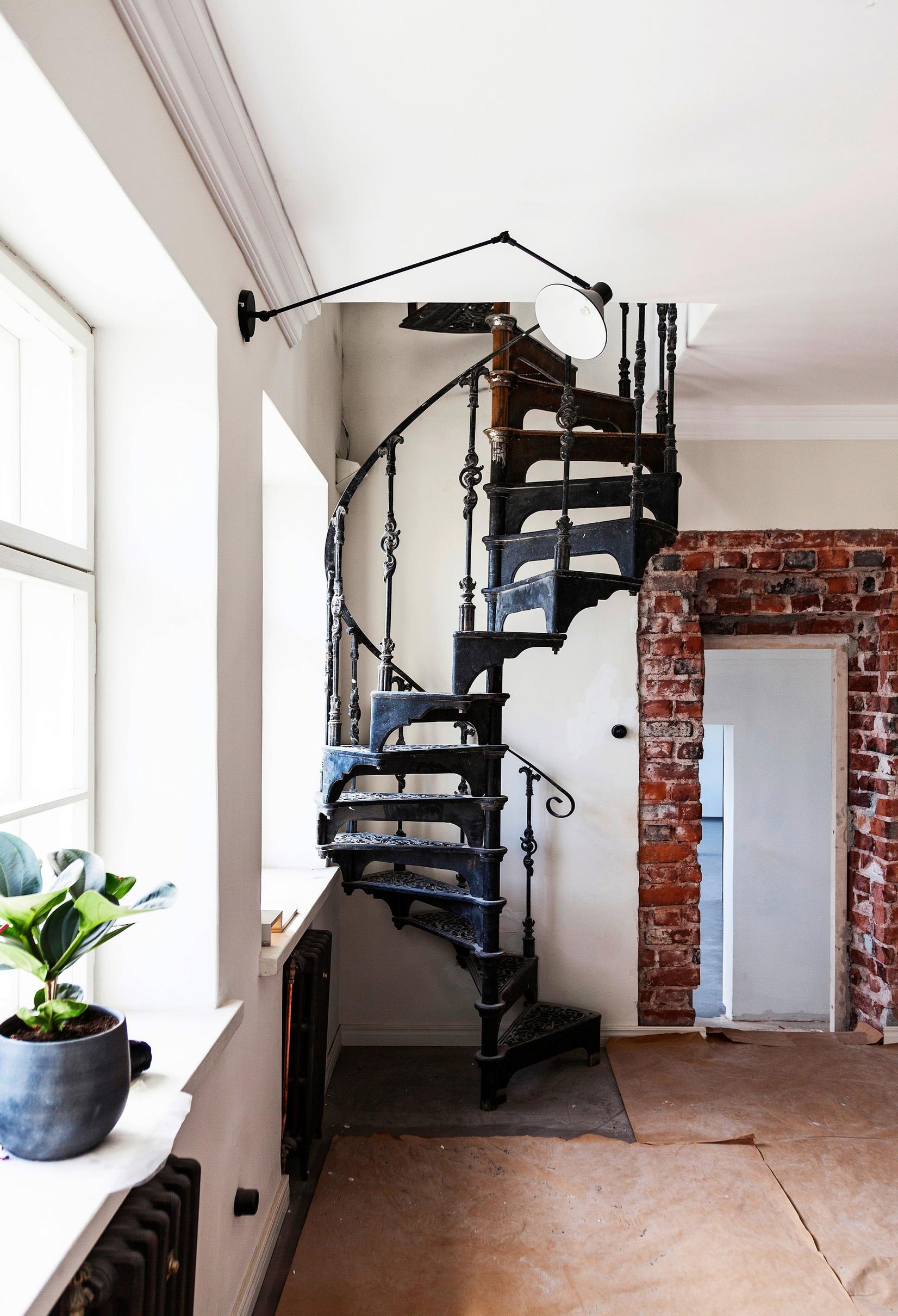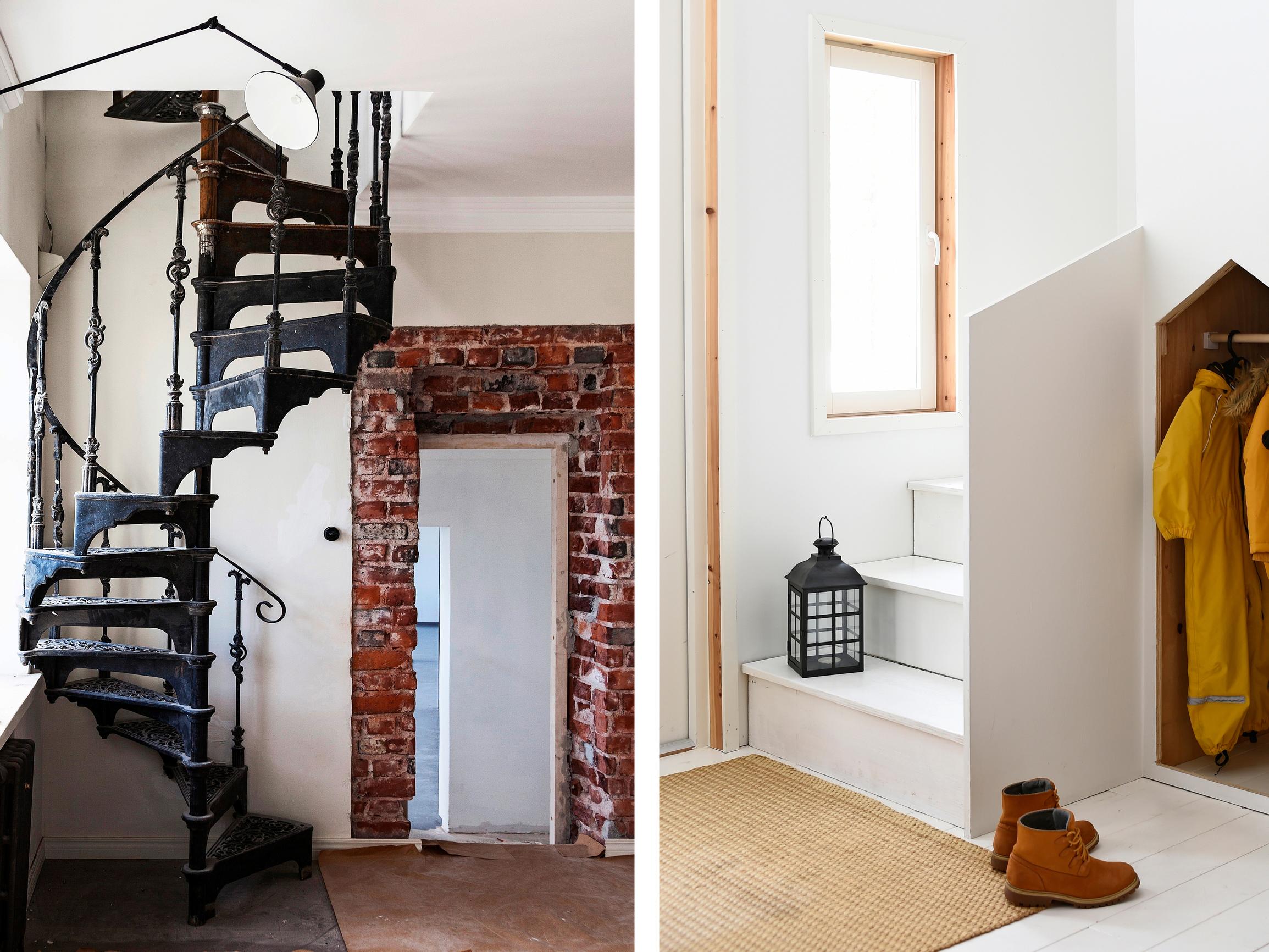 Vanhaa taloa remontoidessa kannattaa tutkia myös alkuperäisestä poikkeavia vaihtoehtoja. Tässä kodissa portaiden kulkusuunta käännettiin peilikuvaksi. Nyt portaikkoon tulvii kaunis päivänvalo ja portaiden alaosa saatiin hyödynnettyä vaatteiden säilytykseen.