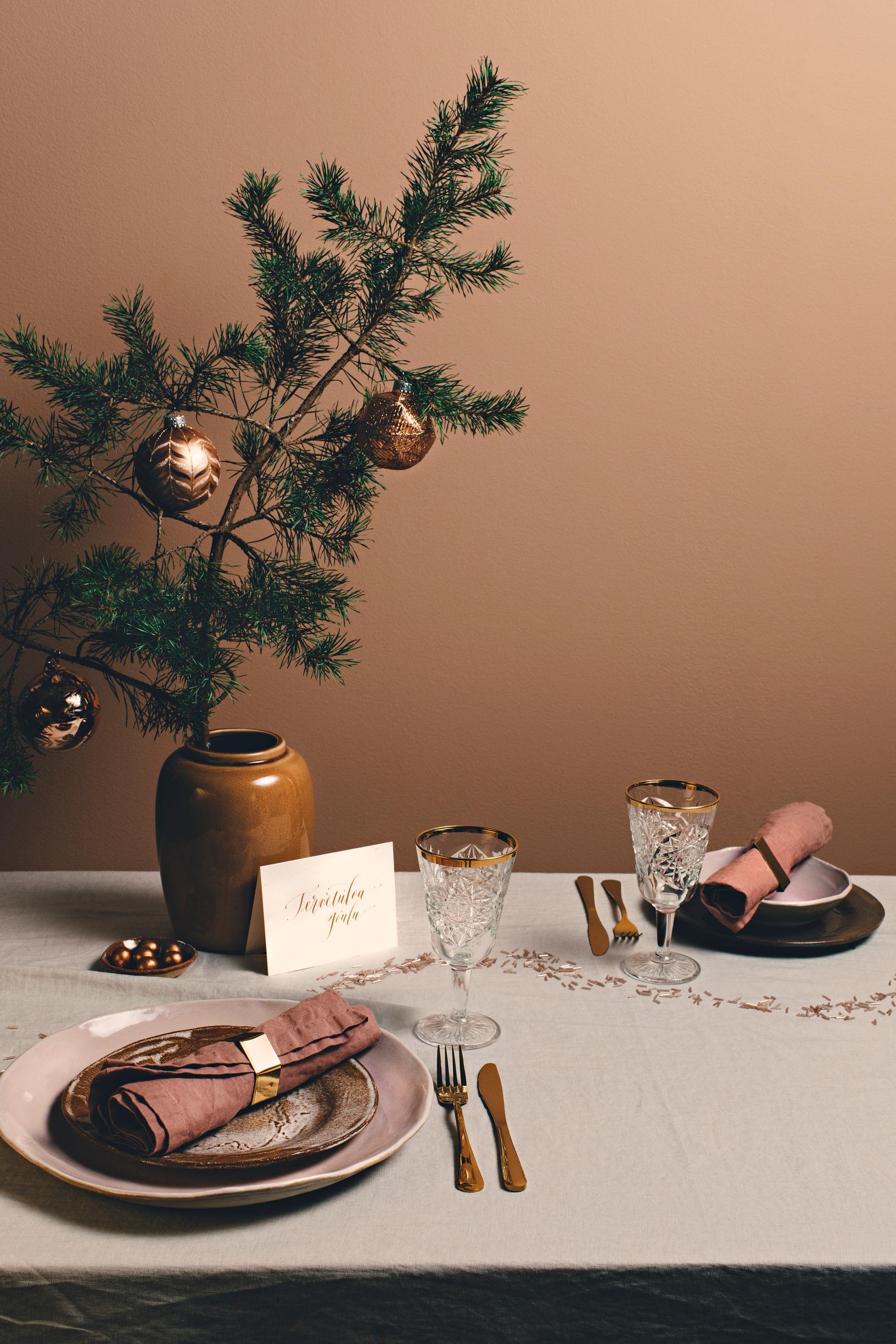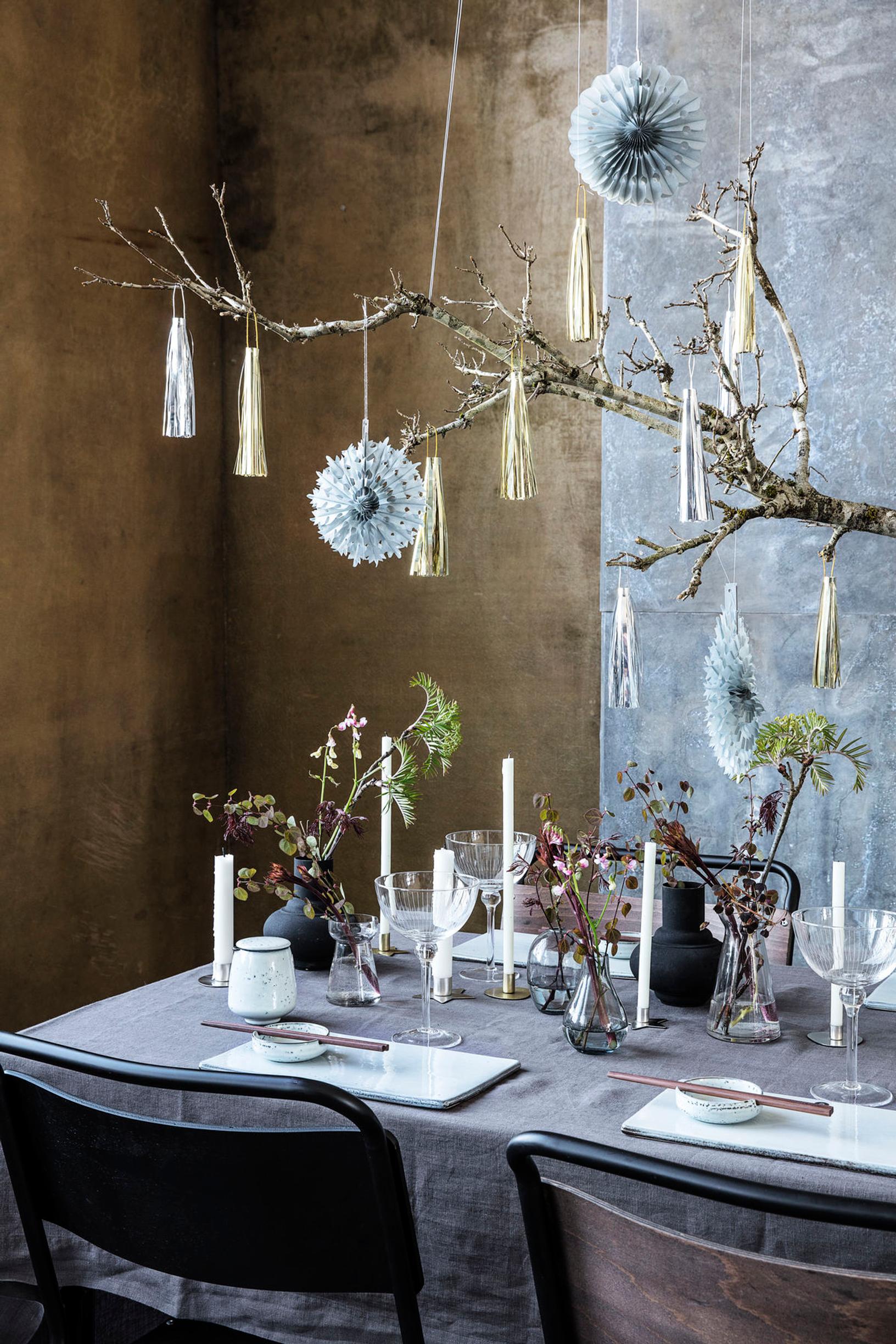 Aseta pöytäkoristeeksi suuri oksa, jota somistamaan riittää muutama kuusenpallo. Ripottele lopuksi astioiden lomaan pieniä helmiä kauniiksi vanaksi. Piparkakkumuoteista saat helposti hienot lautasliinarenkaat.