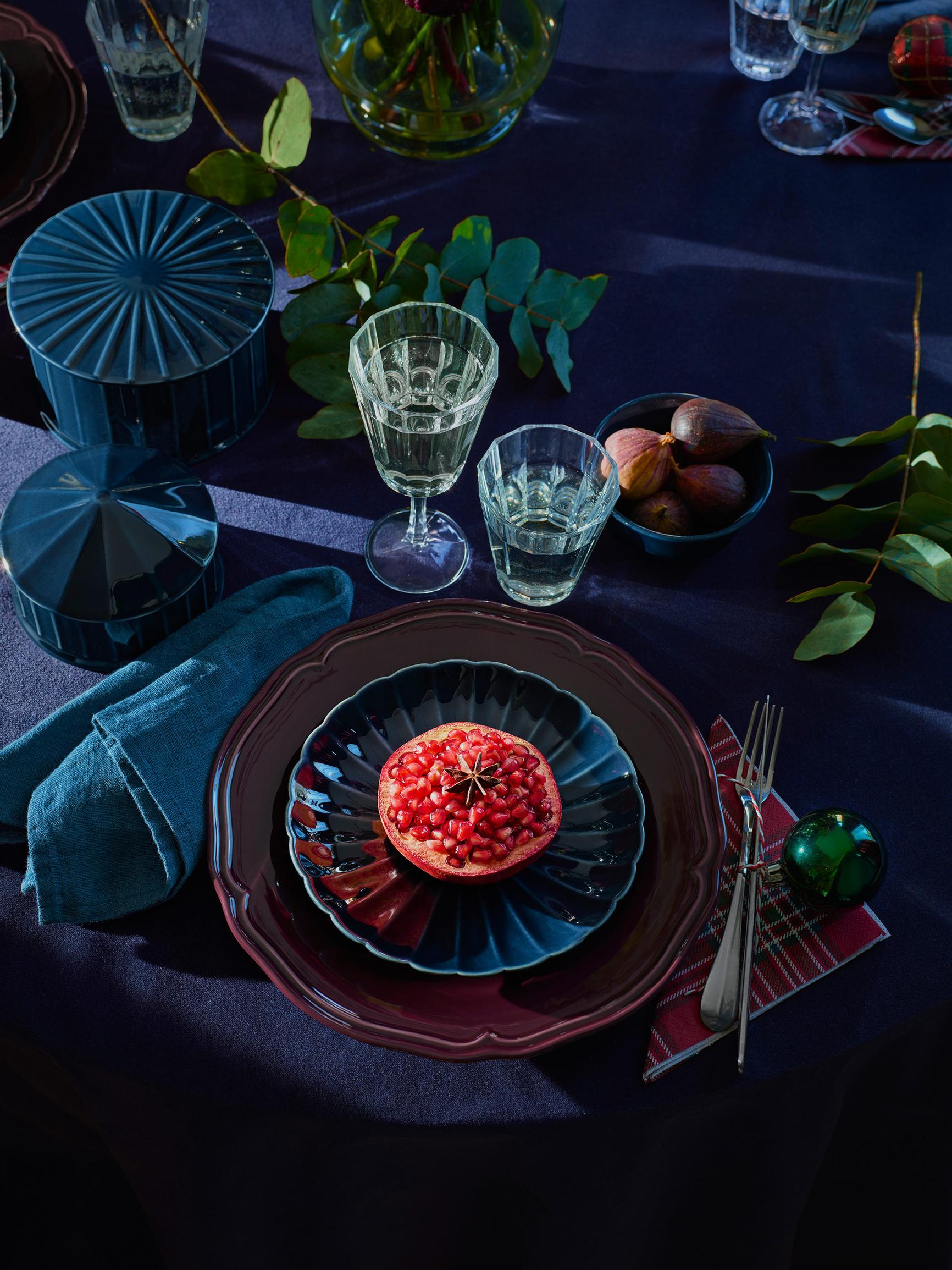 Joulukattauksen juhlavuus syntyy näyttävistä asetelmista ja yksityiskohdista. Inspiroidu perinteisen tontunpunaisen sijaan hillityistä ja syvistä väreistä, jotka korostavat joulukattauksen juhlavuutta.