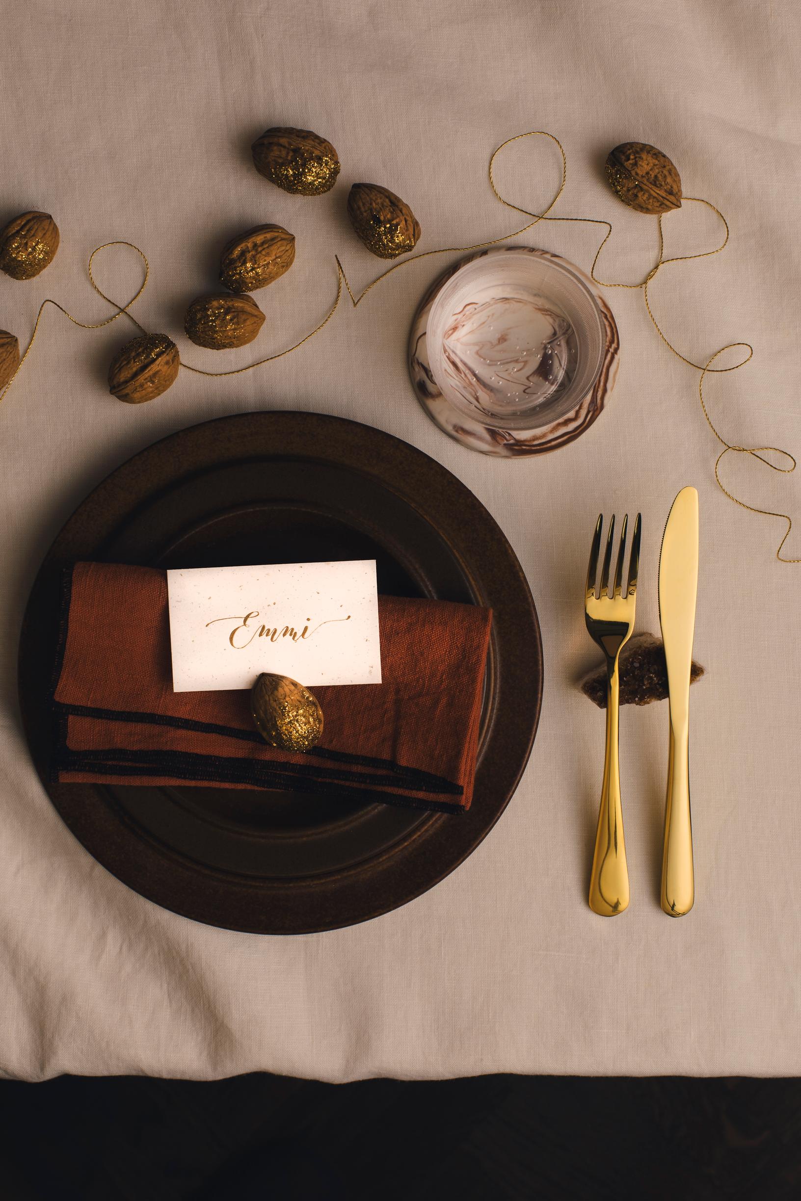 Paikkakortille voi tehdä pidikkeen myös saksanpähkinästä. Raota pähkinänkuorten väliä varovasti mattoveitsellä, tuputtele toiseen päähän askarteluliimaa, anna kuivahtaa hetki ja ripottele päälle kimalletta. Anna kuivua ja puhalla irtohiukkaset pois. Sijoita aterimet vuorikiteen tai lasinpalasen päälle. Lopuksi jaa kimaltelevat pähkinät pöydälle ja pujota väleihin ohutta kultalankaa.