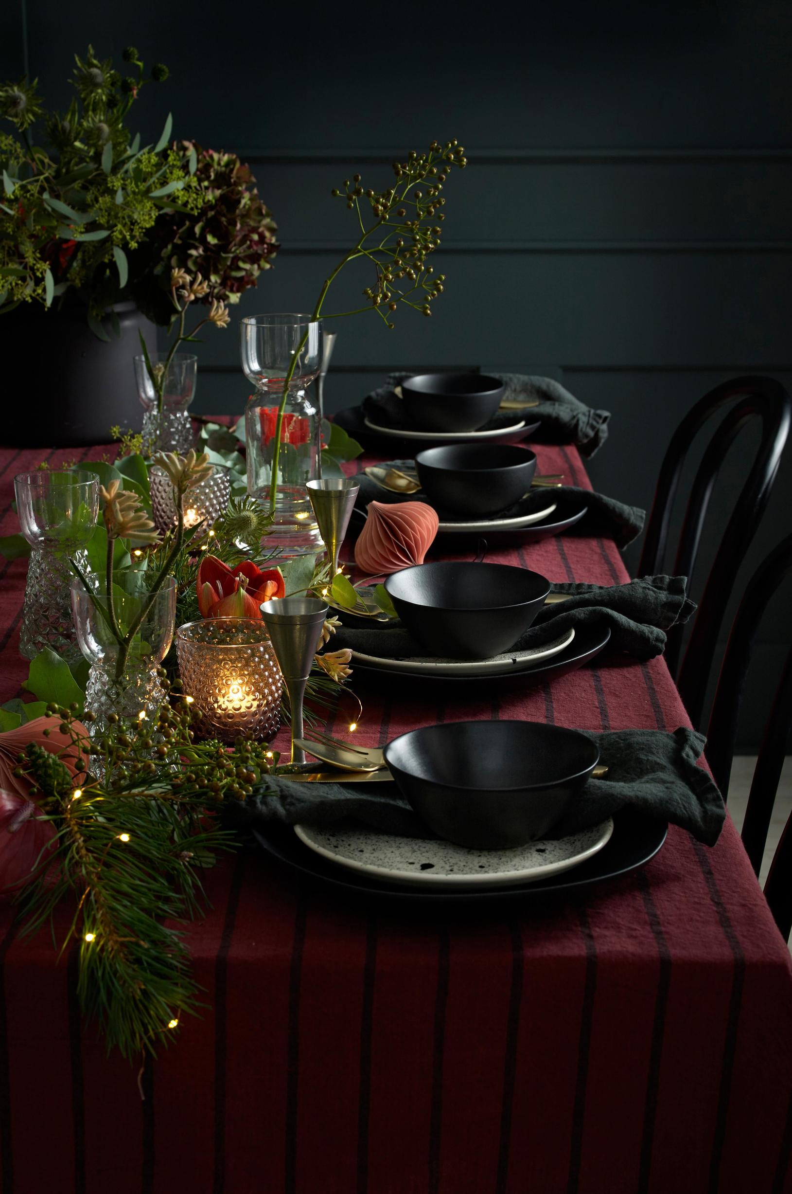 Valitse joulupöytään tumma ja täyteläinen sävy, kuten syvä violetti, viininpunainen tai ruskea. Jos muu koti on vaalea, tumma joulukattaus luo dramaattisen juhlatunnelman.