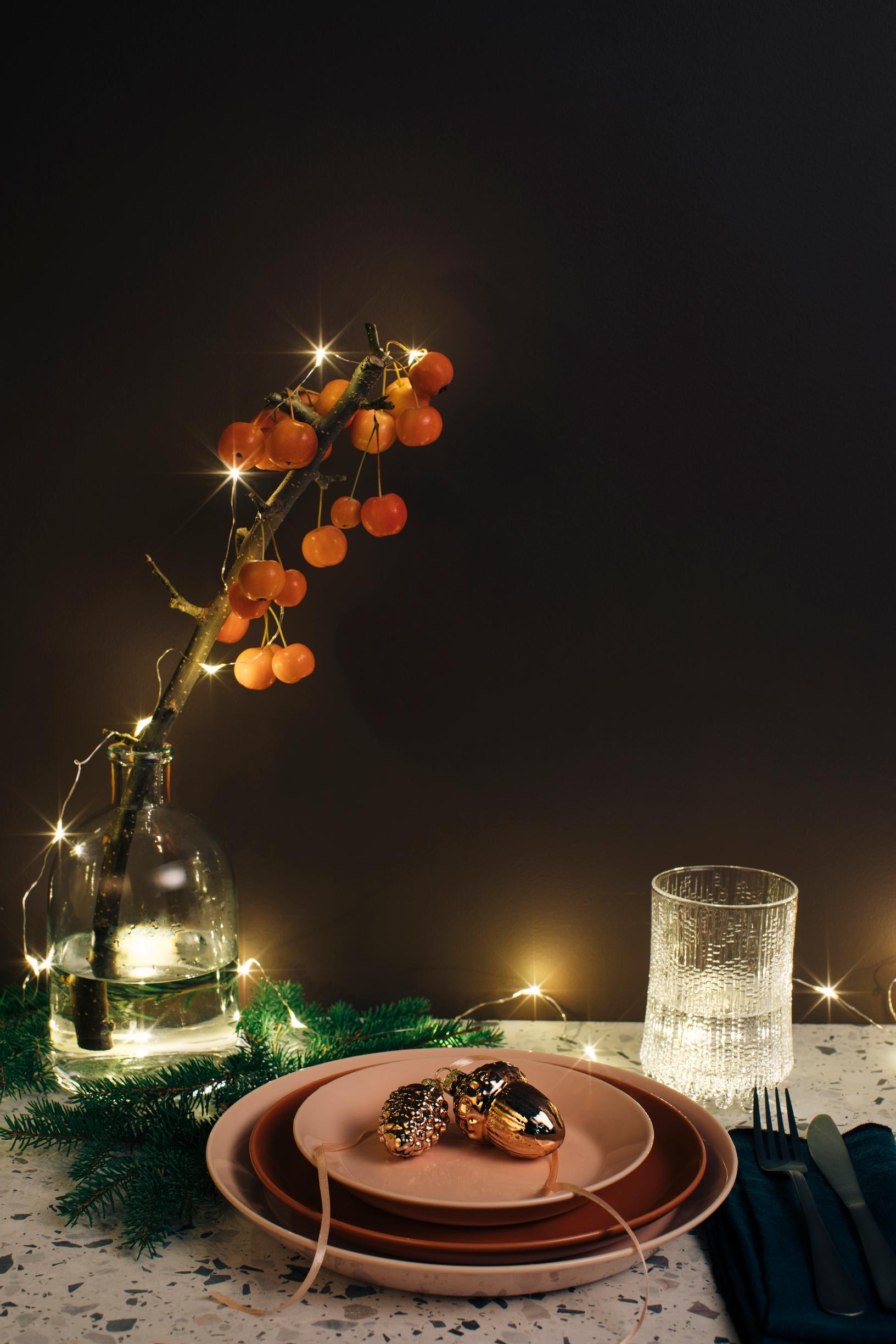 Koristele jokaisen ruokailijan lautanen muutamalla satiininauhalla toisiinsa sidotulla joulukoristeella. Kävyn ja tammenterhon muotoiset koristeet ovat tänä vuonna erityisen trendikkäitä. Somista pöytäkoristeeksi maljakkoon marjaomenan oksa ja asettele ympärille kuusenhavuja. Viimeistele asetelma valosarjalla.