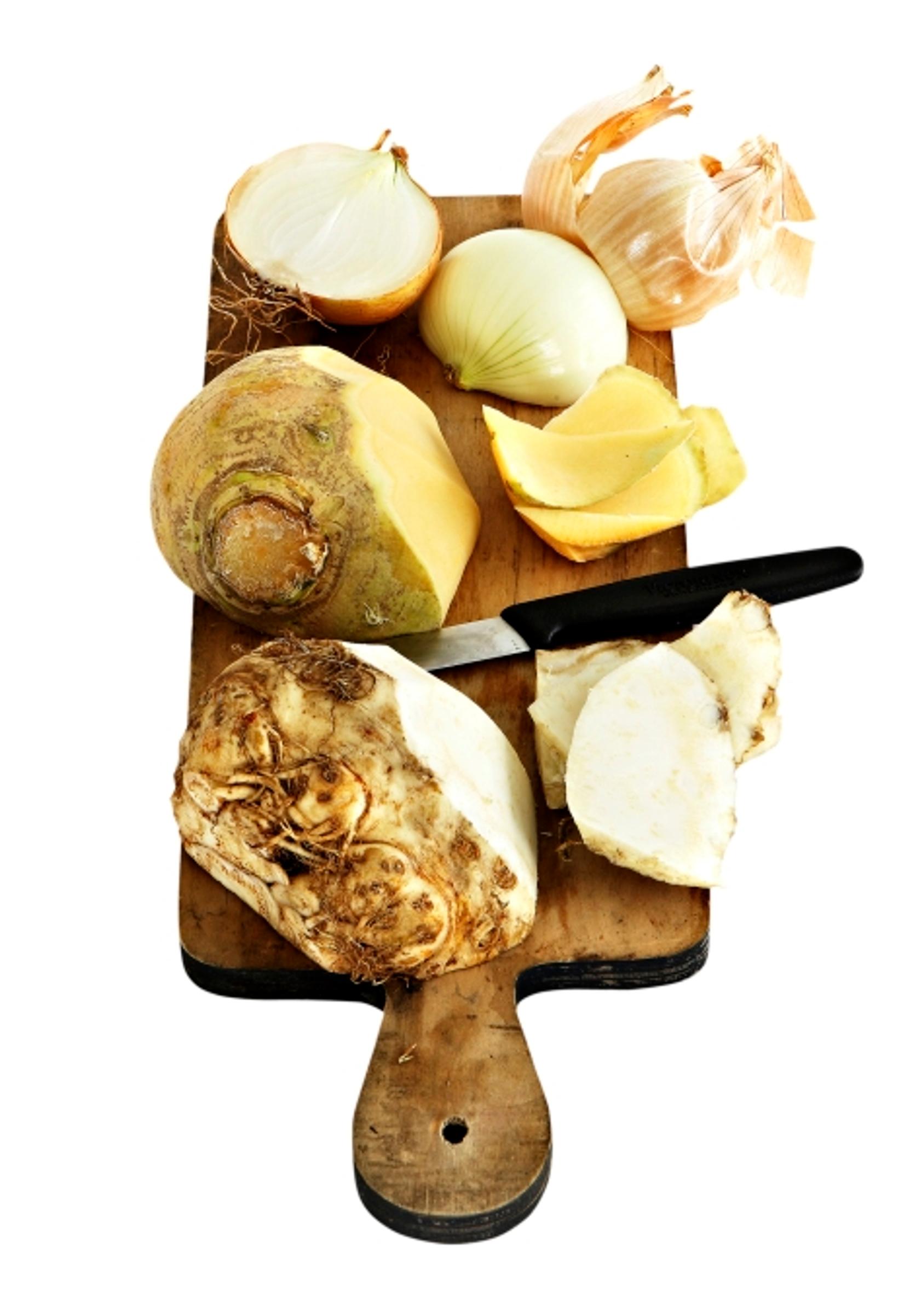 Suuren paksukuorisen lantun ja muhkuraisen juurisellerin kuoriminen on kätevintä halkaistuna, pienellä vihannesveitsellä ja leikkuulautaa vasten. Sipulikin kannattaa ensin halkaista ja irrottaa sitten koko kuori yhtenä kerroksena.