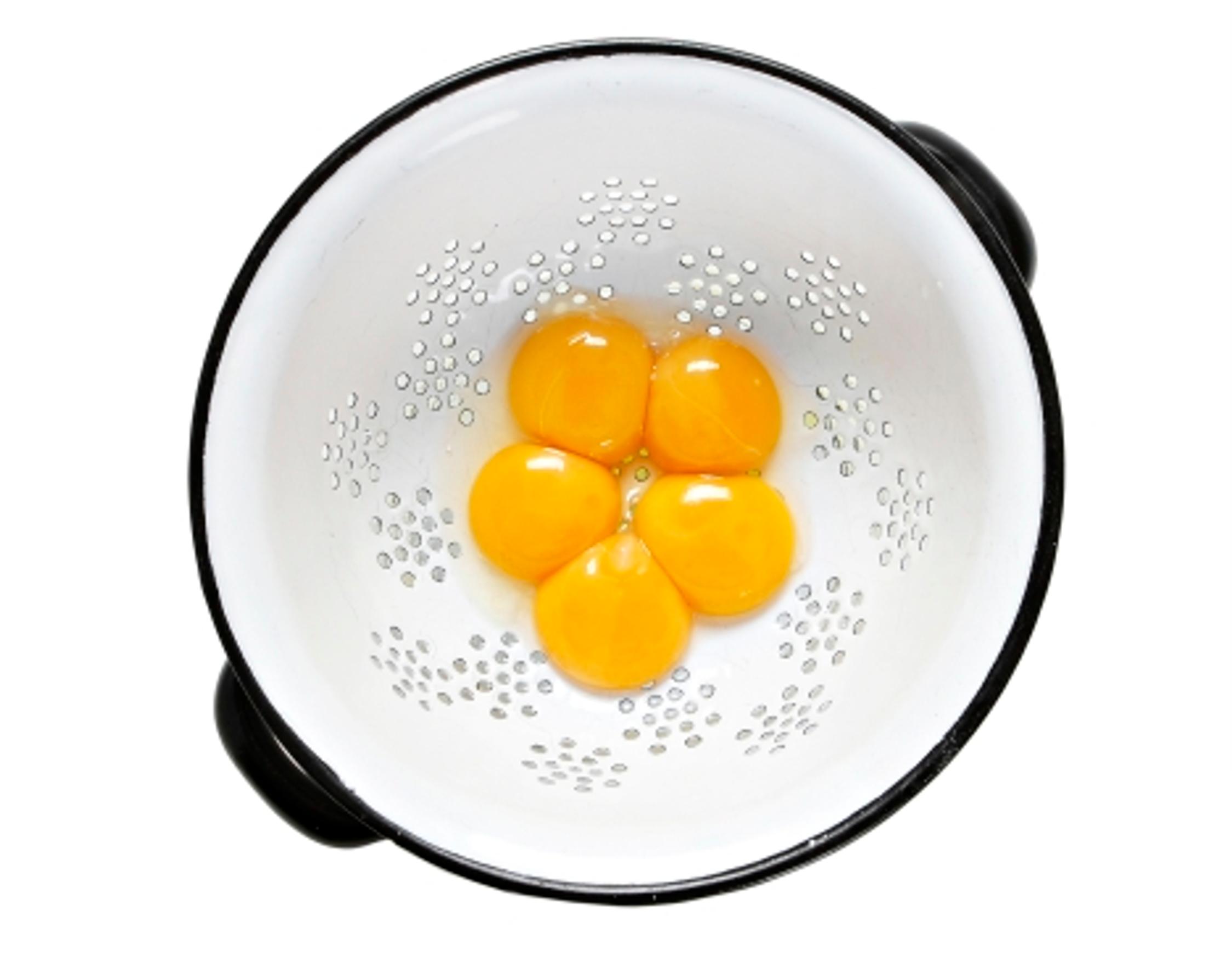 Erottele kananmunan keltuaiset ja valkuaiset pastalävikössä. Riko munat varovasti lävikköön ja anna valkuaisten valua alla olevaan puhtaaseen ja kuivaan kulhoon. Kuljeta lusikan kärkeä tai sormenpäätä varovasti keltuaisten lomassa, niin valkuainen valuu nopeammin.