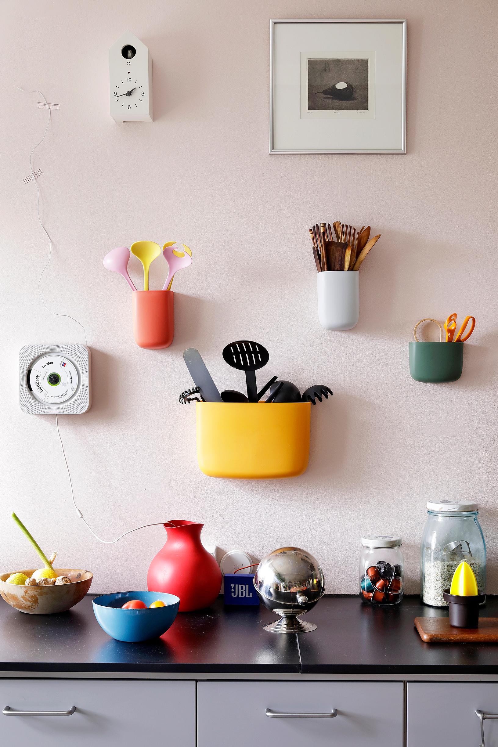 Pintaremontti teetettiin ulkopuolisella remonttiliikkeellä. Myös keittiö uusittiin. Yläkaapistot on osittain korvattu yksittäisillä, paidan taskua muistuttavilla säilyttimillä, jotta keittiön ilme pysyisi kevyenä. Seinä maalattiin lempeällä vaaleanpunaisella. Se on väri, jota rakastan ja jota ripottelen mielelläni vähän joka paikkaan. Kun tarkasti katsoo, kodin jokainen ”valkoinen” seinä on itse asiassa vaaleanpunainen. Sävy antaa vaikutelman lämpimän valkeasta olematta kuitenkaan kellertävä.