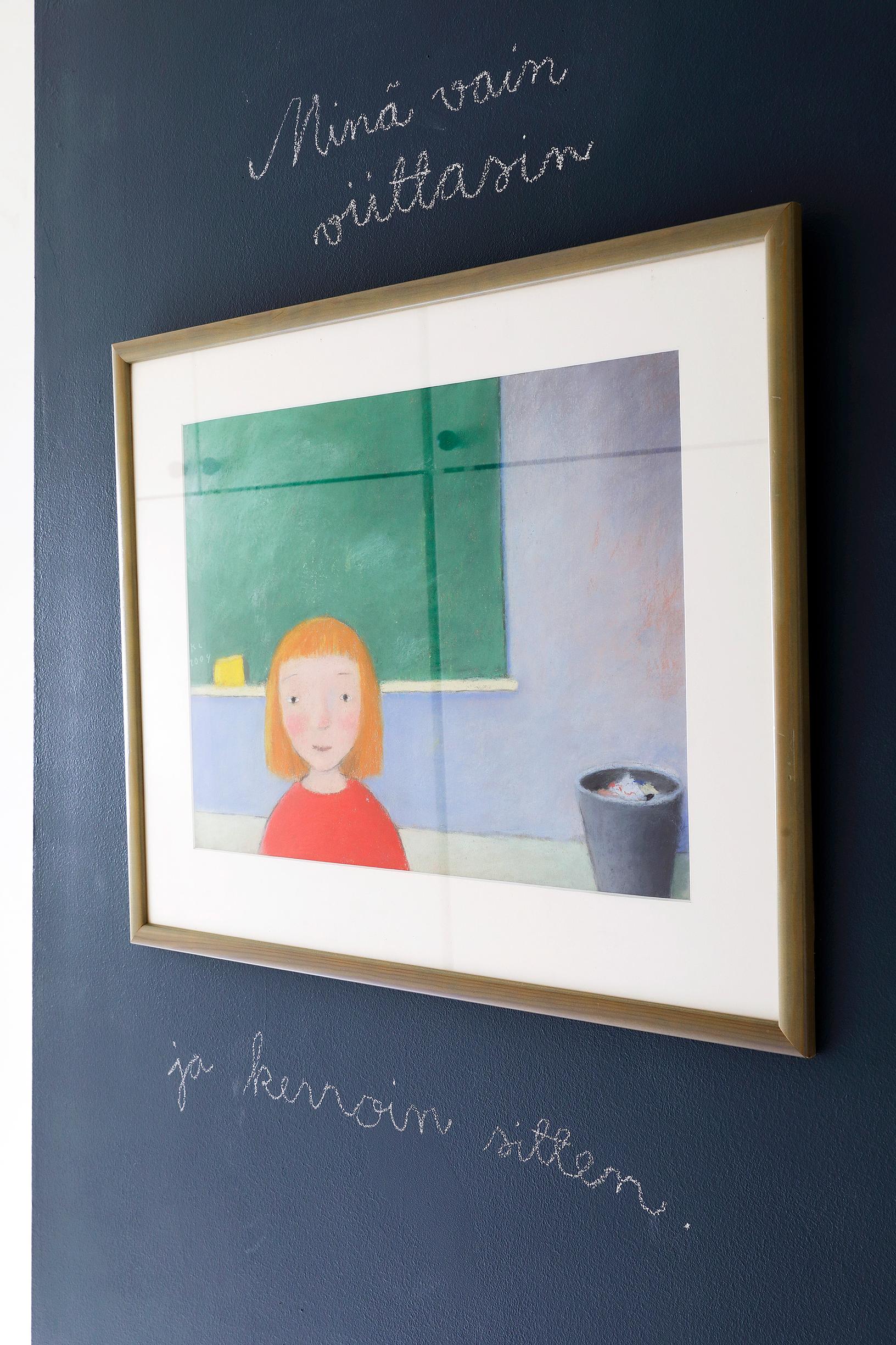 Kasvoin perheessä, jossa arvostettiin taidetta ja tehtiin paljon käsitöitä. Äitini ja tätini, joiden kanssa kasvoin, rakastivat taidetta ja myös hankkivat sitä kotiin, vaikka olivat pienituloisia virkanaisia. Taulukauppoja tehtiin osamaksulla. Muistan, kuinka teininä harmitti, kun piti päättää, ostetaanko kotiin jääkaappi vai Erik Granfeldtin omakuva, ja taide voitti. Nyt maalaus on olohuoneessa, Eva Cederströmin vuonna 1954 maalaaman maiseman vieressä. Tuo maisema Granadasta oli lapsuuteni lempitaulu, vieläkin hyvin rakas.