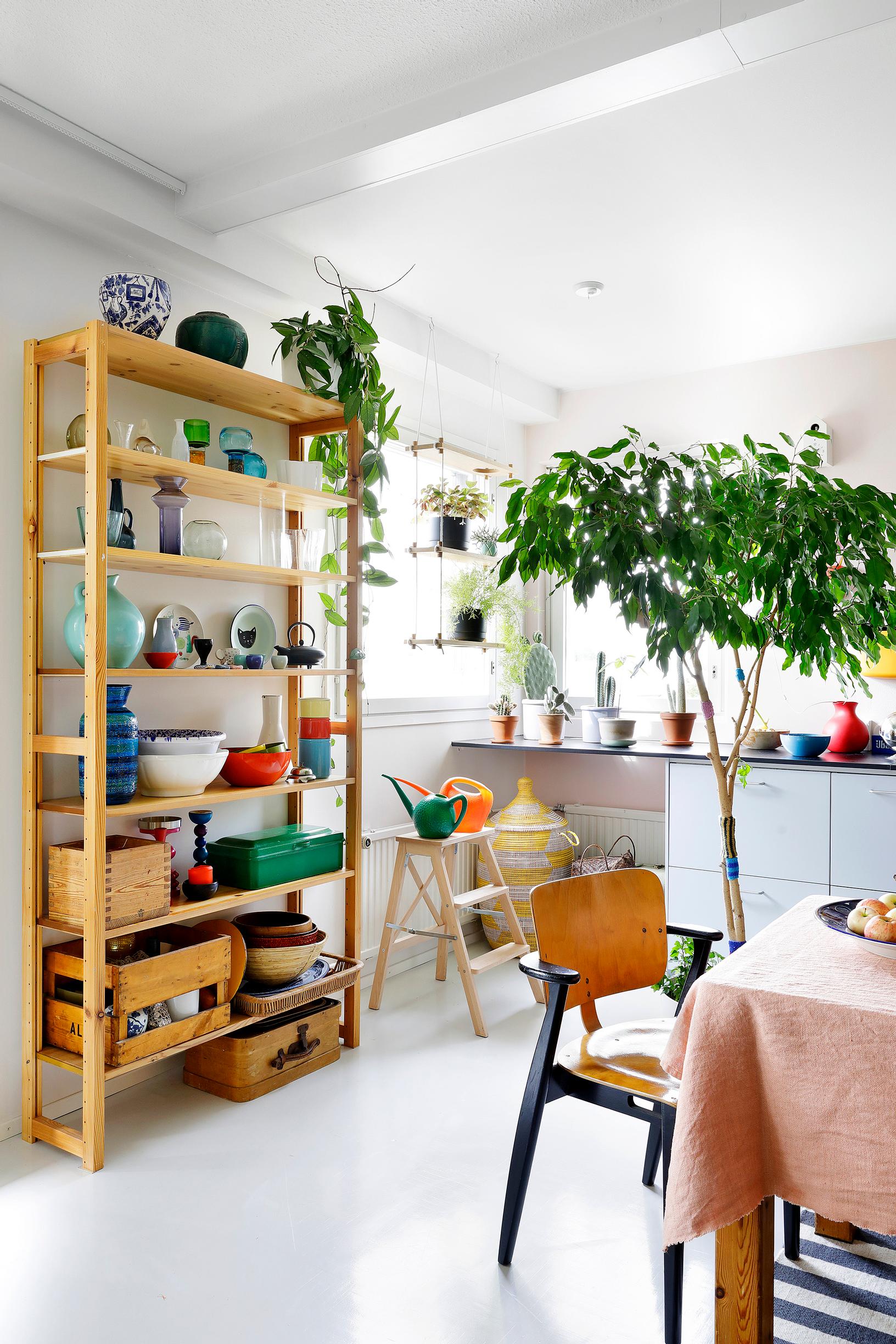 Lundian kirjahylly oli 1970-luvulla kodinperustajan tärkeimpiä hankintoja, Artekin ruokapöytä iso taloudellinen satsaus, vaikka se ostettiin käytettynä. Artekin jakkarat ja ritiläpenkit taas ovat lapsuudenkotini peruja. Tapiovaaran Domus-tuoleja sai vielä joitakin vuosia sitten kirpputoreilta muutamalla kympillä. Sieltä nämä omanikin ovat. Ne ovat vähän huojuvia mutta mukavia ja kauniita. Sohva on vuosikymmeniä vanha, mutta kymmenen vuotta sitten uusitun päällisen ansiosta täysin kunnossa.