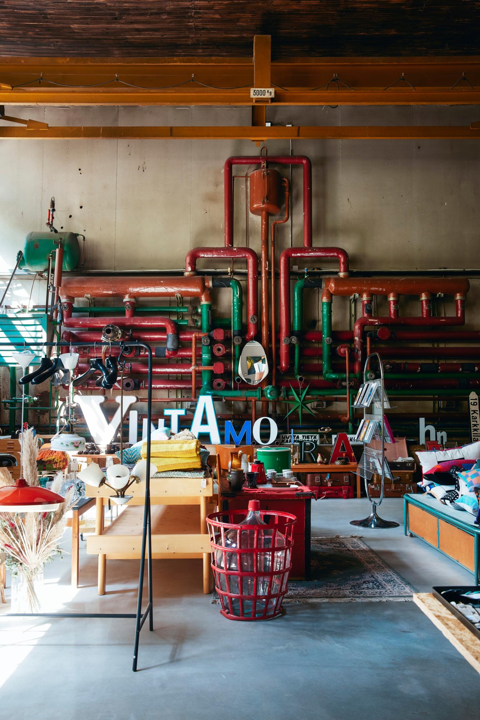 Vintagemyymälä Vintamon seinässä risteilee emalointilaitokseen kuuluneita komeita putkia. Samassa tilassa toimivat myös muun muassa luonnonkosmetiikkaa ja suomalaista taidelasia myyvät liikkeet.