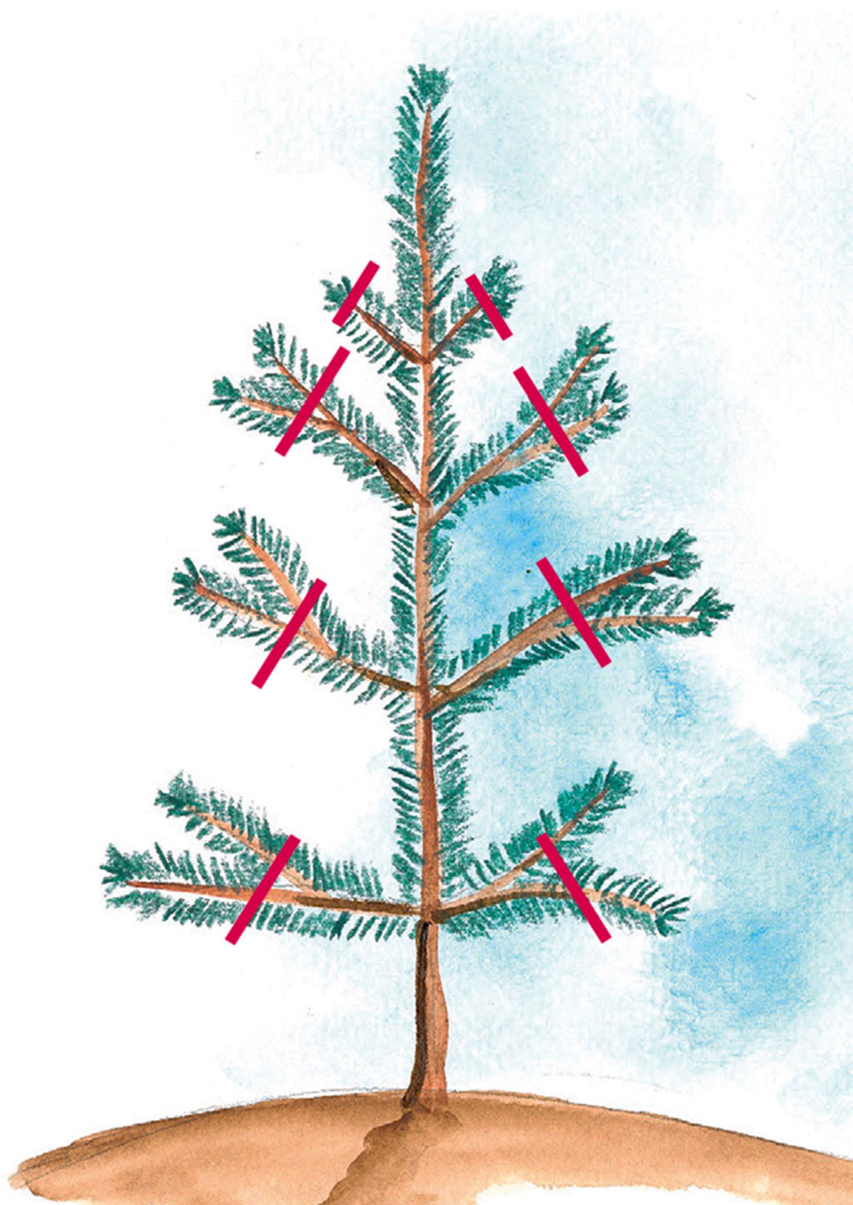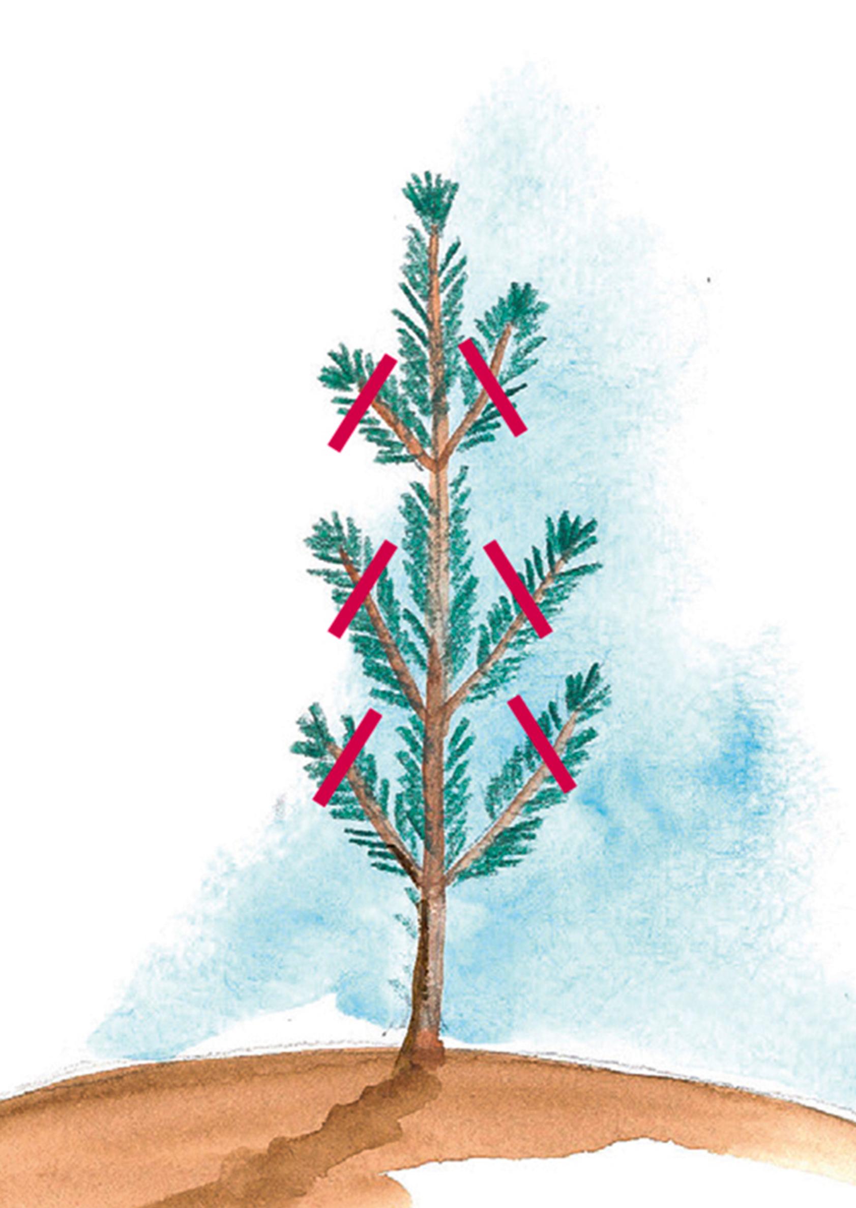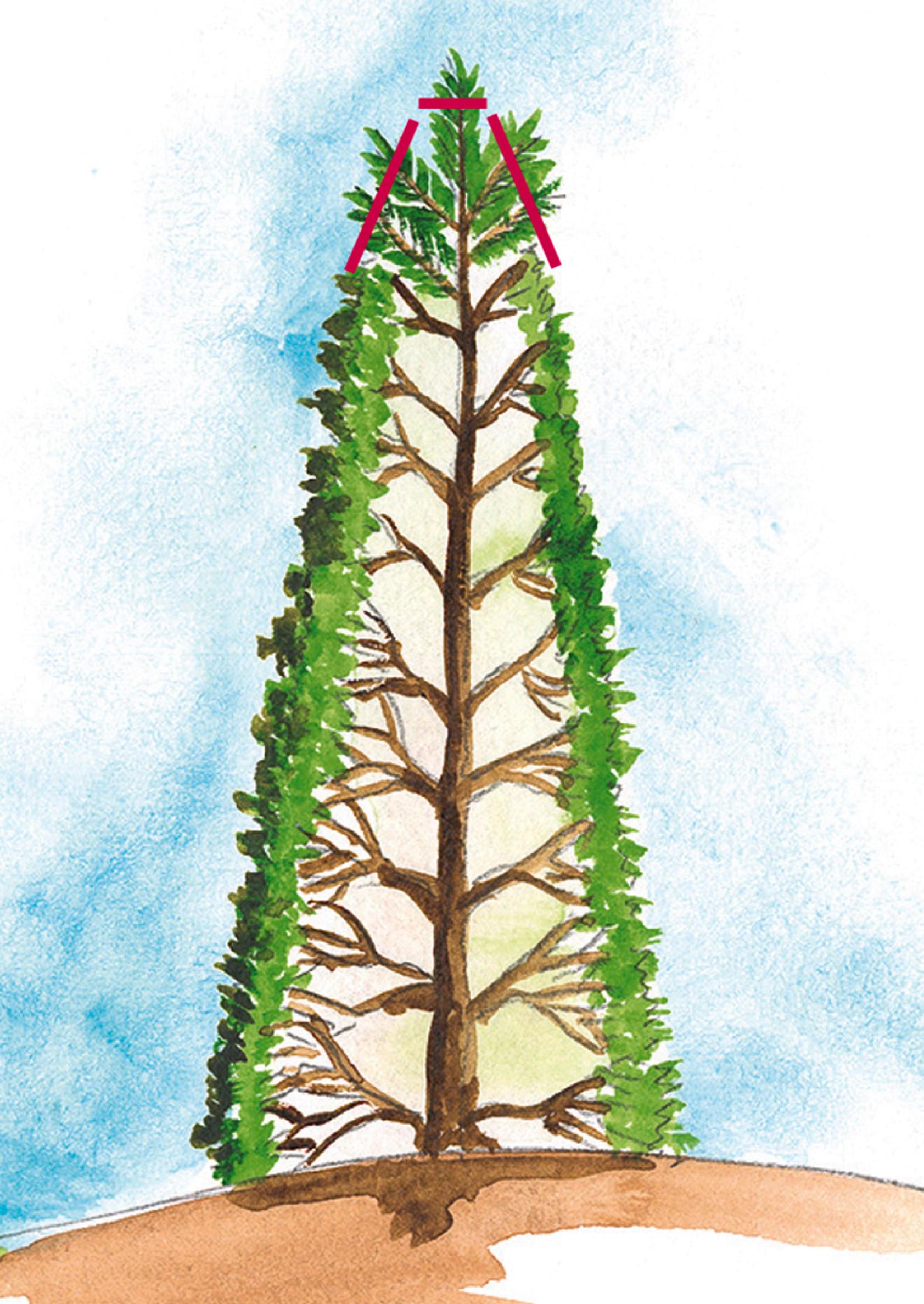 1. Pensasaidan leikkaus kannattaa tehdä ensimmäisen kerran istutuksen jälkeisenä vuonna kevättalvella. Typistä runkoon saakka vihreäneulaiset versot läheltä runkoa. Näin ne haaroittuvat ja aidasta tulee mahdollisimman tiheä ja kapea. Jätä latvaverso rauhaan. Suunnittele profiilista A-muotoinen, jotta alaosan neulaset saavat valoa eivätkä varise. Tasoita saman kevään kasvua juhannuksen jälkeen tai seuraavana kevättalvena suojasäällä.