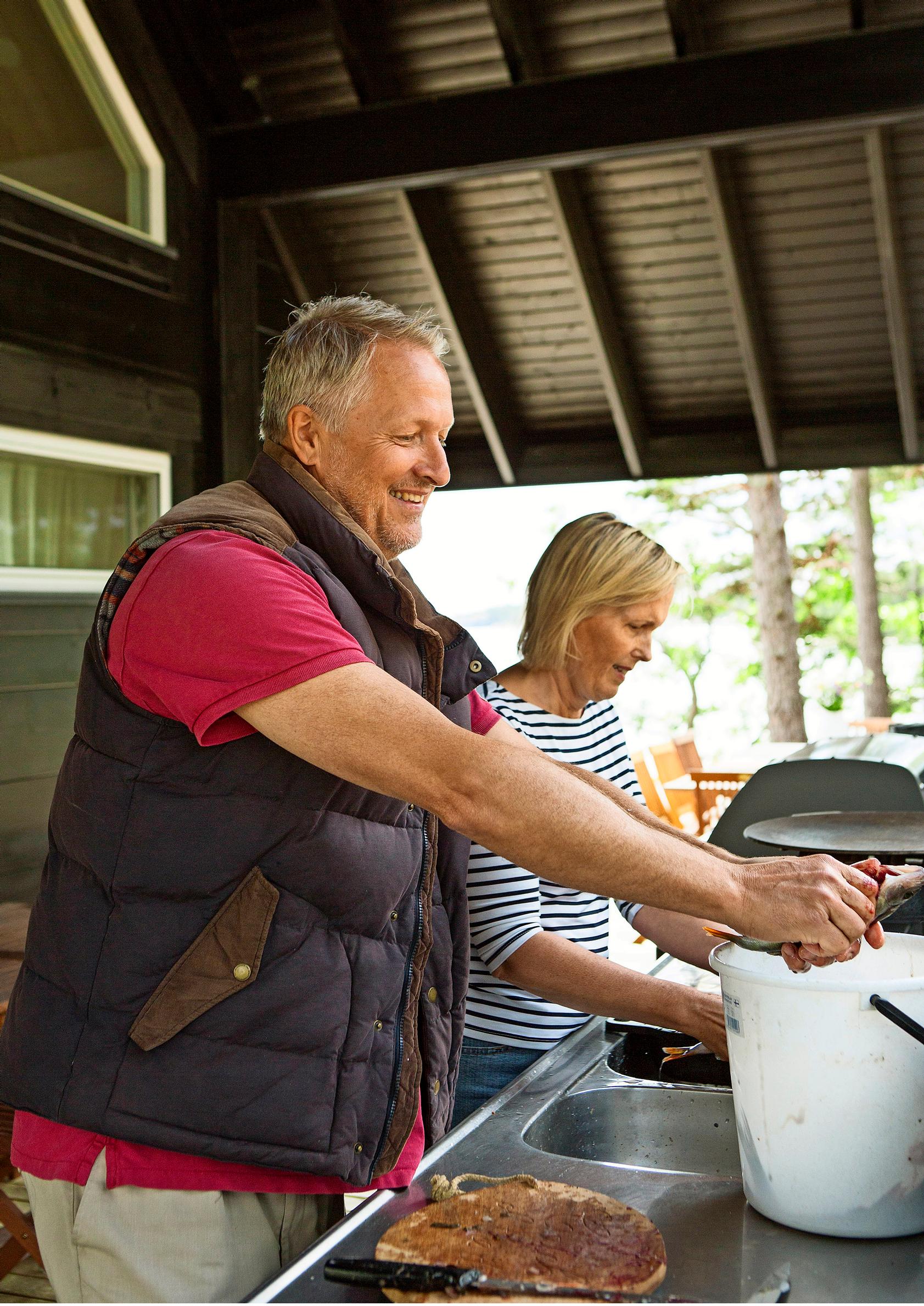 Terassin pitkien räystäiden alla on hyvä tarkkailla kiikareilla meren lintuliikennettä. Meren huomaan juurtunut pariskunta rakastaa näkymää yli katajien ja käkkyräisten mäntyjen. Verkkokalastusharrastus on saanut molemmat pauloihinsa, ja he pyytävät lähivesiltä ruokapöydän täytteeksi kampelaa, ahventa, siikaa ja haukea. Kalat valmistetaan avotulella tai virolaisella savustimella, joka on vankien valmistama.