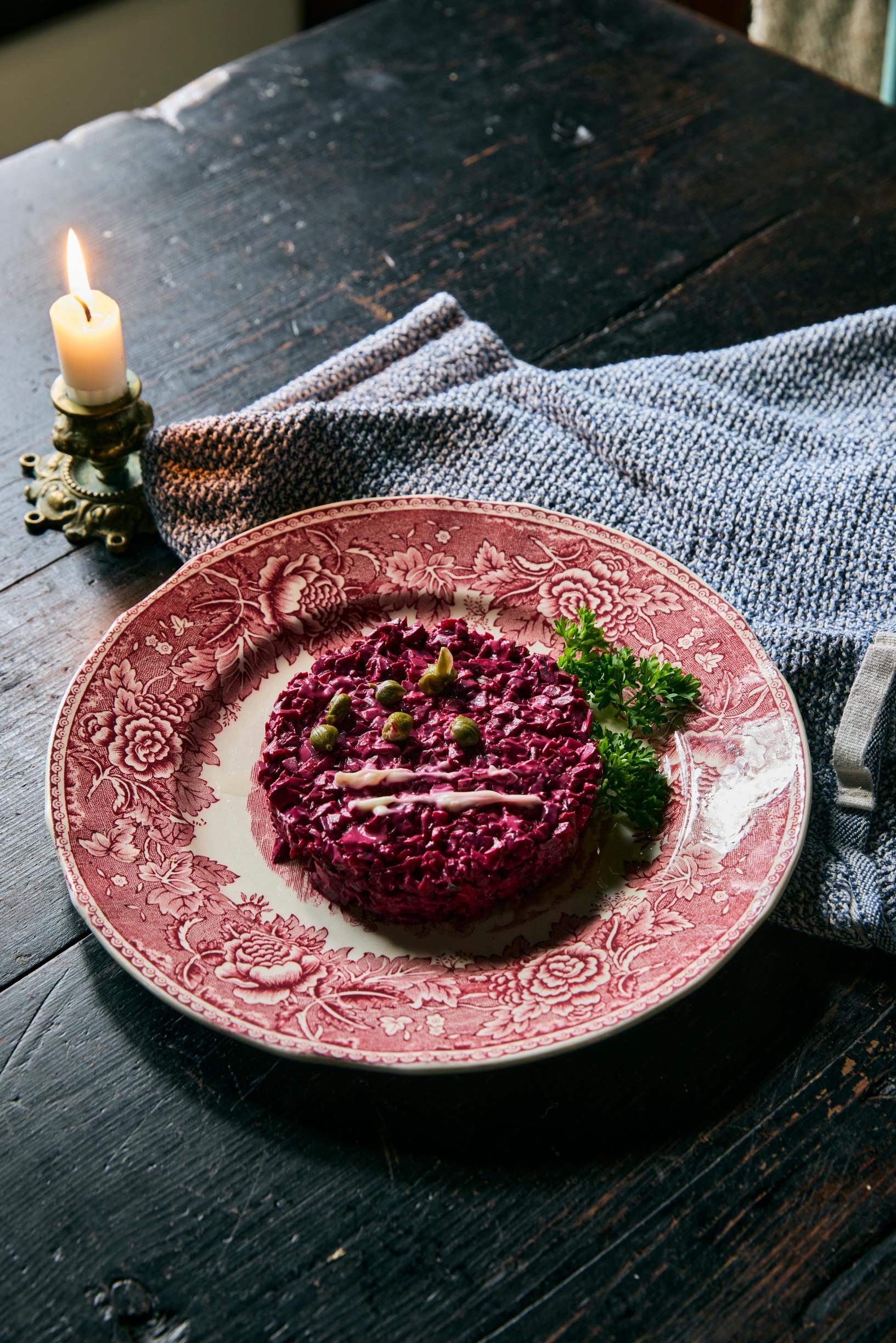 Punajuuritartar tehdään paahdetuista punajuurista, punasipulista ja kapriksista ja viimeistellään piparjuurimajoneesilla. Herkullinen punajuuritartar taipuu helposti vegaaniseksi, kun maustat sen hunajan sijaan vaahterasiirapilla ja käytät kasvipohjaista majoneesia. ”Vegetartar maistuu mainiolta mallasleivän päällä tai alkuruokana ihan sellaisenaan”, Perhot vinkaavat.