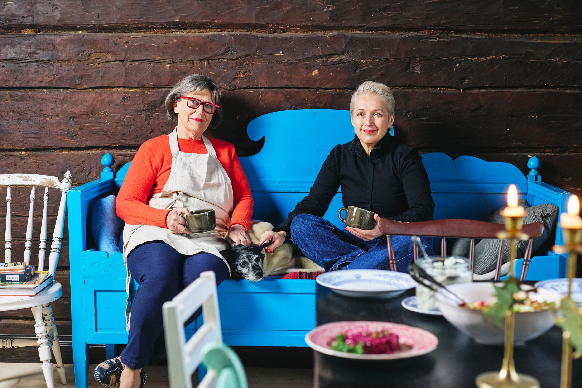 Leena ja Anna Perho loihtivat pöydän täyteen jouluherkkuja. Annan tuvassa vietetään joulupuurobrunssia 20 hengen voimin villasukat jalassa.