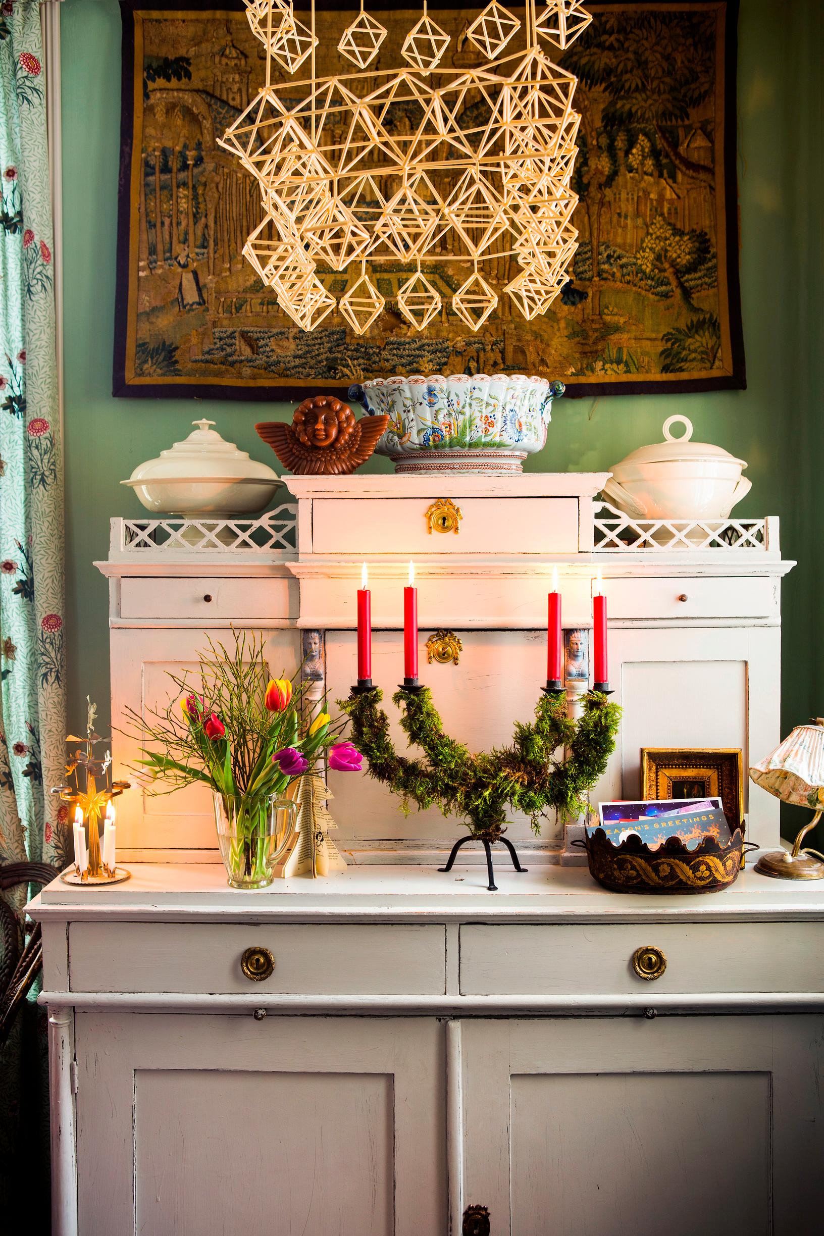 Enemmän kuin joulukoristeita, kaikkialla on kynttilöitä ja tuikkuja. Erityisen hauskoja ovat tuikut, jotka on askarreltu kovertamalla lämpökynttilän mentävä syvennys isoon, punaiseen jouluomenaan. Tärkeitä jouluntuojia ovat myös enkelikello, jollainen oli Annan lapsuudenkodissa, ja Aarikan puinen pompulakynttelikkö 1970-luvulta. Se nostetaan kaapista ruokapöydän keskelle valaisemaan jouluaamun puurotuokiota.