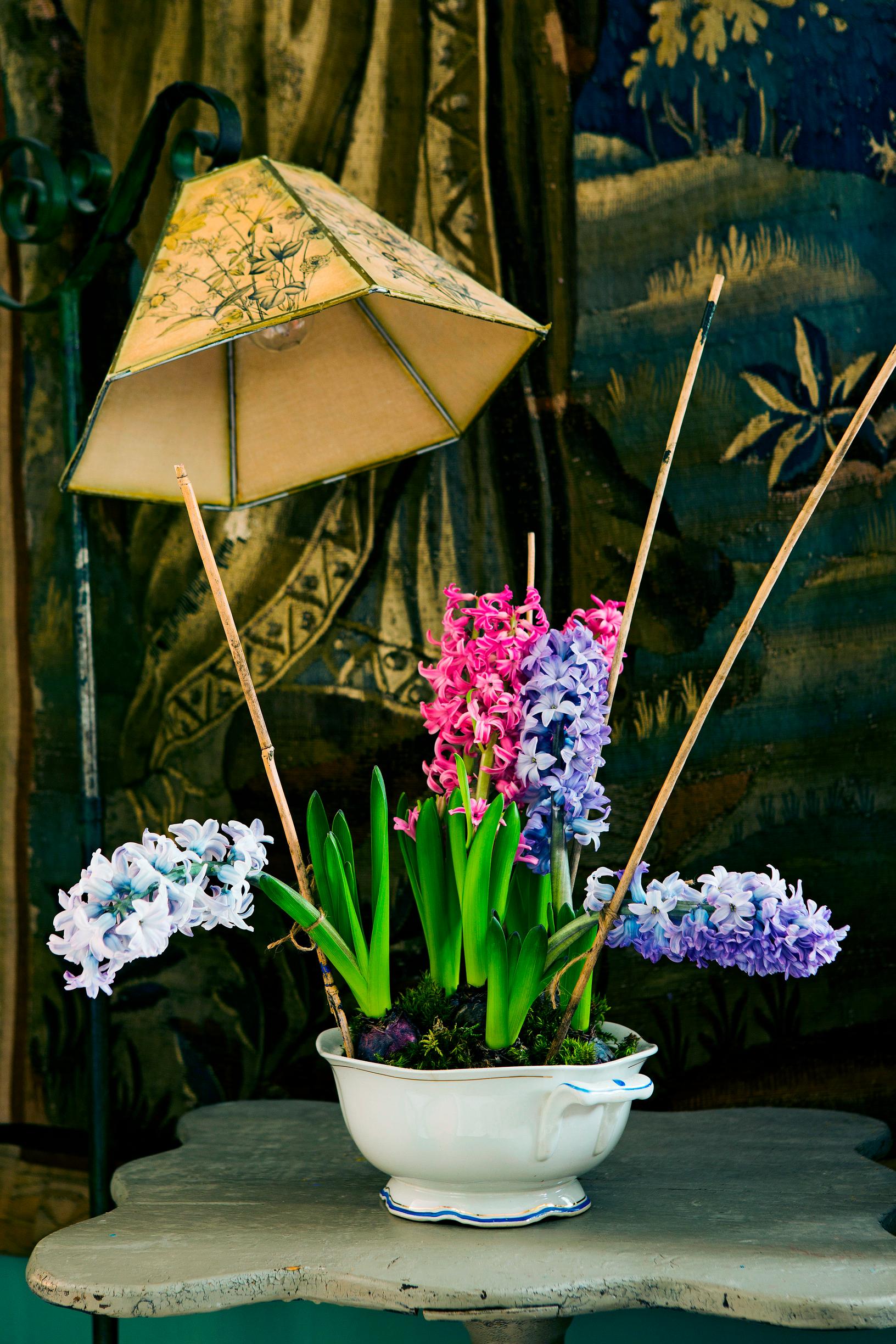 Hyasintit ovat lempikukista rakkaimpia, mutta Kimmo ei siedä niistä erittyviä eteerisiä öljyjä. Siksi ne saavat yleensä ilahduttaa lasikuistin puolella, jossa säilytetään oliivia, kiinanruusua, rahapuuta ja muita talvella viileässä viihtyviä viherkasveja. Joinakin jouluina asetelmissa on ollut myös kieloja. Ne ovat myrkyllisiä, mutta lapset oppivat heti varomaan niitä.