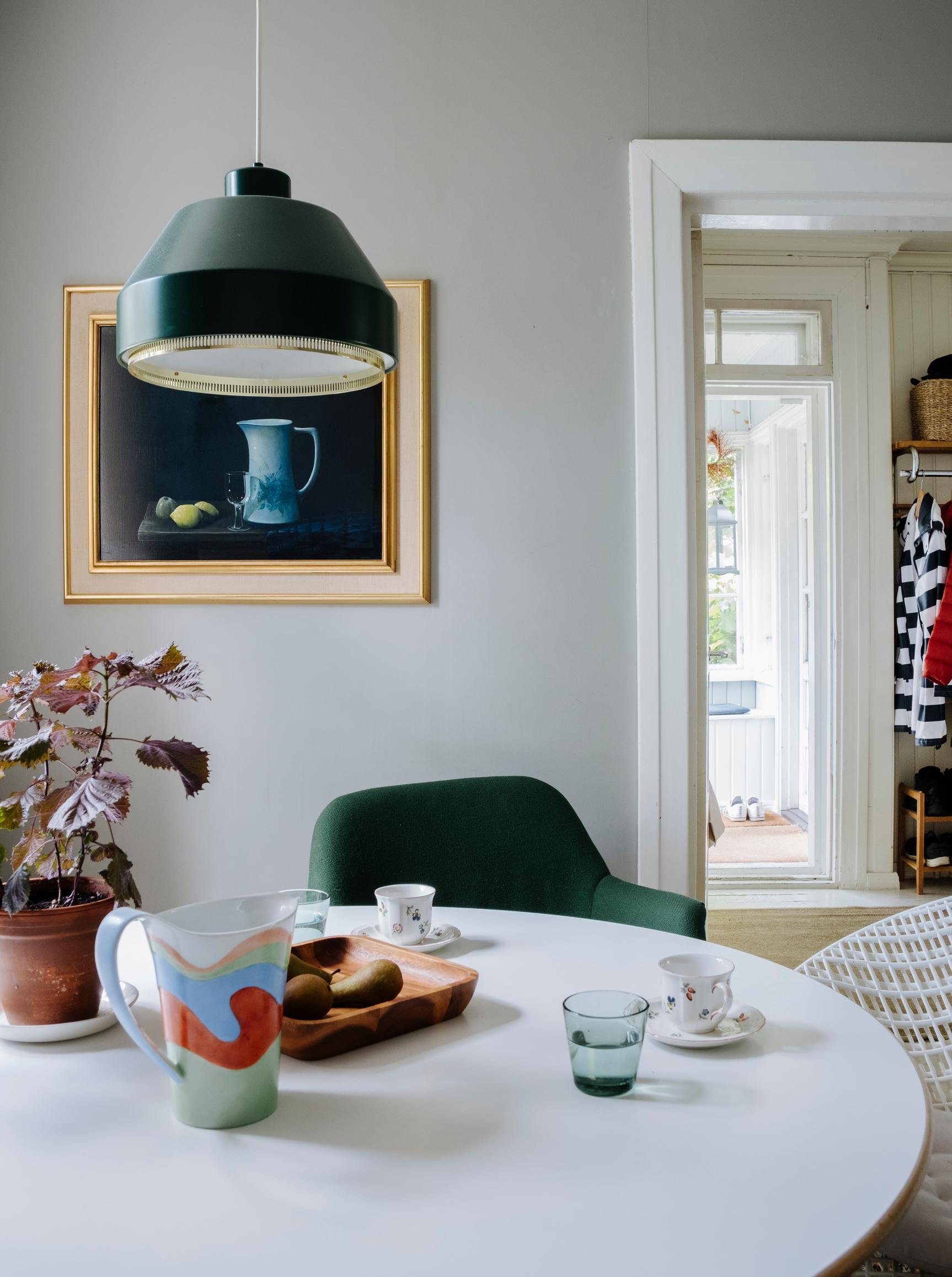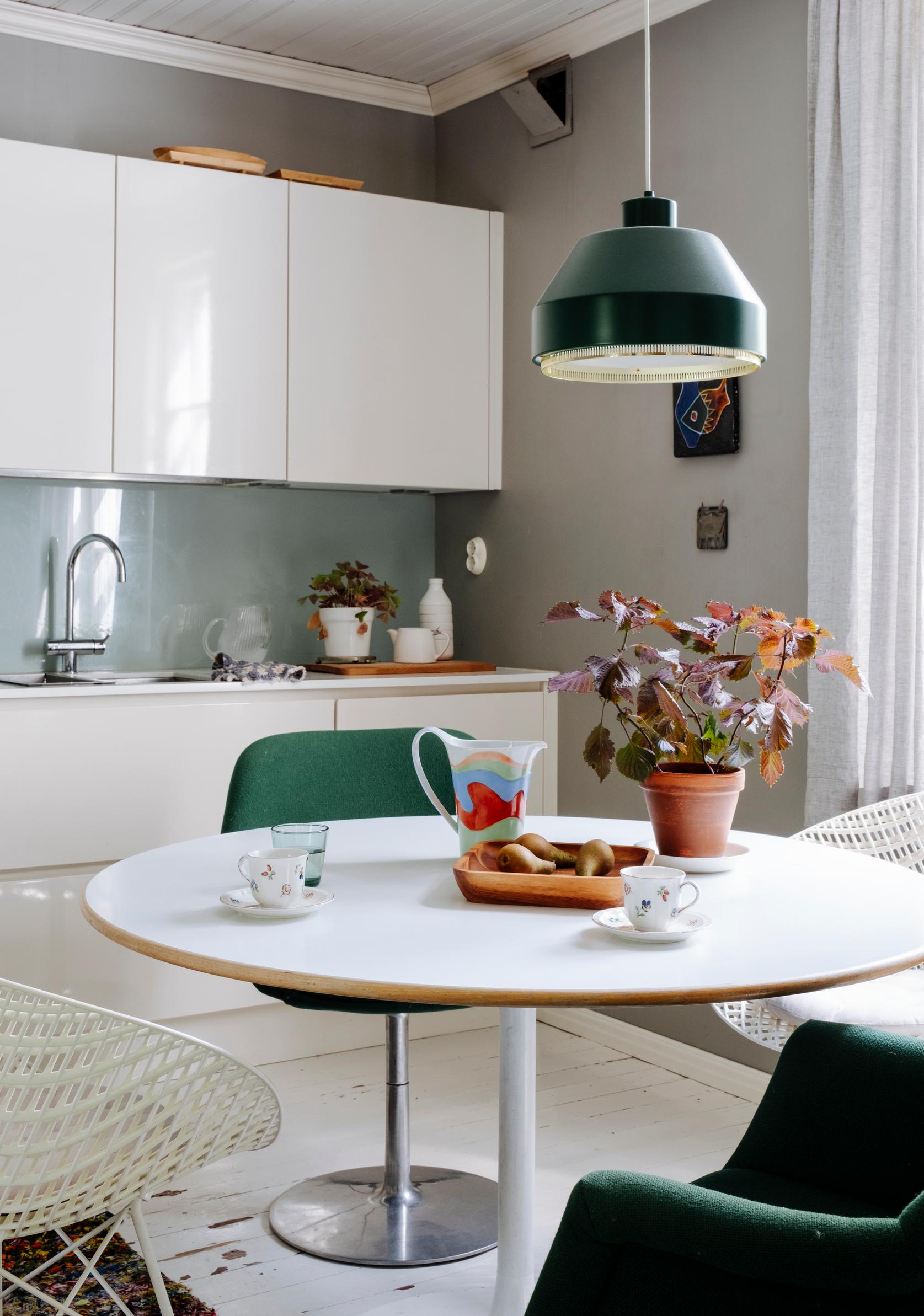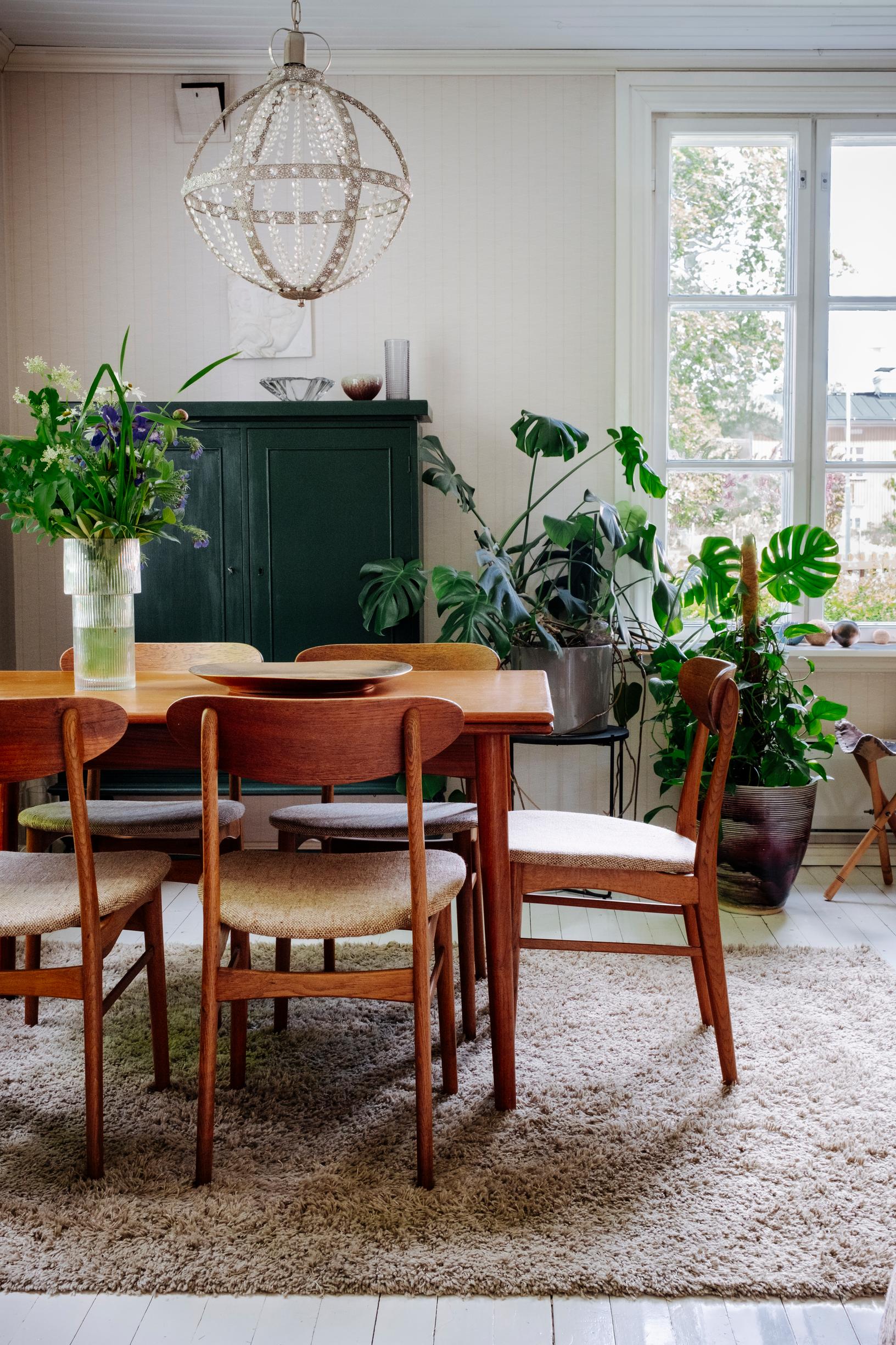 Pasi: Tykkään kovasti 60-luvun tanskalaisesta ruokailuryhmästä. Siinä on hyvät mittasuhteet ja muodot. Pyörivät Kilta-tuolit ovat sopivan modernit, ja niissä on todella mukava istua. Nämä kalusteet ovat tyyliltään täysin erilaisia kuin lapsuudenkodissani, jossa oli Askon, Iskun ja Sotkan huonekaluja.