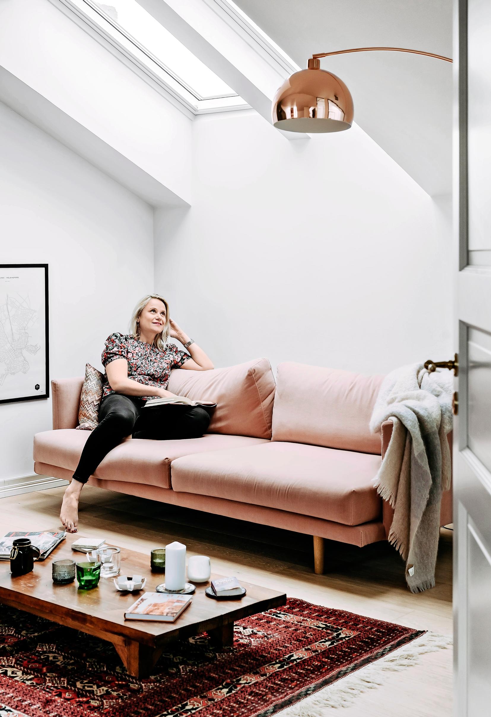 Anna rakastui heti ensi kerrasta ullakkoasuntoonsa, joka sijaitsee Mikaelinkirkon vieressä, Turun keskustan kattojen yllä. Isojen ikkunoiden ja lukuisien kattoikkunoiden kautta kotiin virtaa valoa. Kotoa pyöräilee minuuteissa niin Aurajoen rantaan, kauppahalliin, Kauppatorille kuin kaupungin parhaisiin ravintoloihin.