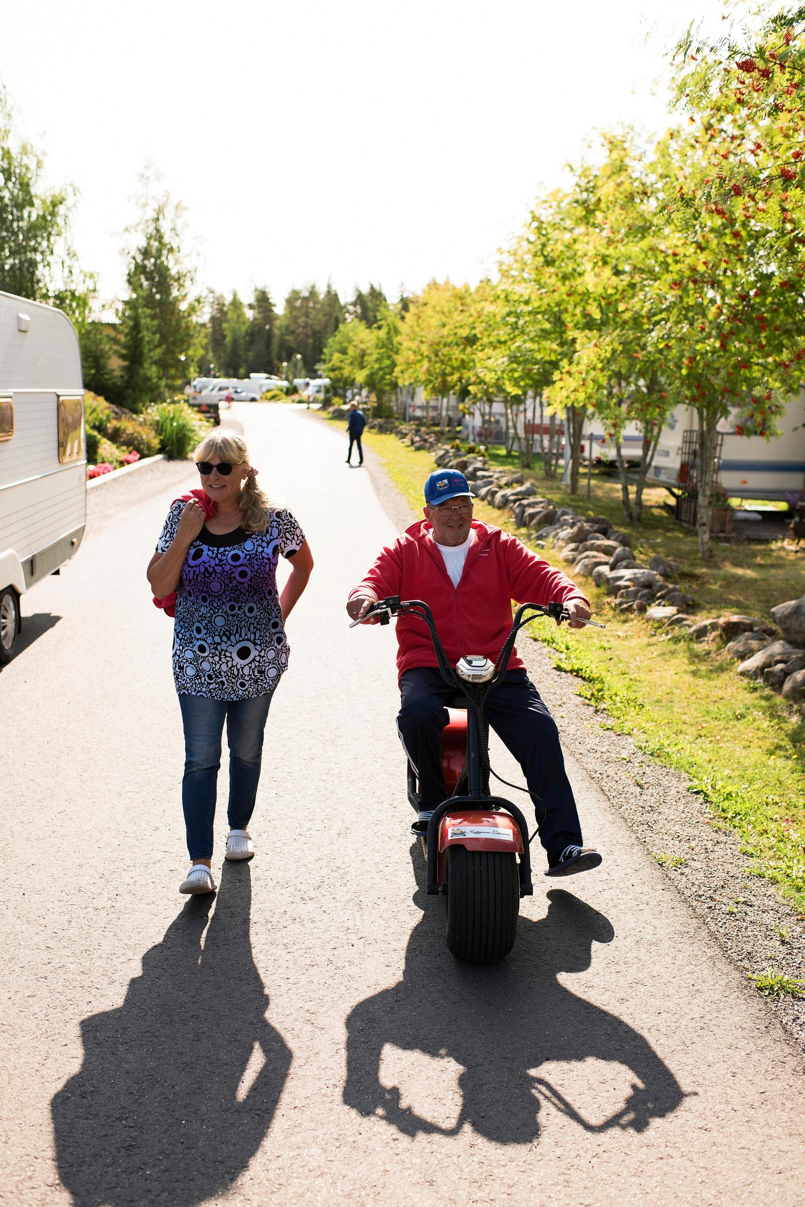 Syksyisin riittää haravoitavaa. Kesäisin puuhaa on oman pienen pihamaan rapsuttamisessa ja leirintäalueen nurkkien siistimisessä. Metsästä pariskunta poimii ämpärikaupalla mustikoita, sieniä ja puolukoita. Muutaman kilometrin kauppareissut hoituvat kätevästi polkupyörällä.