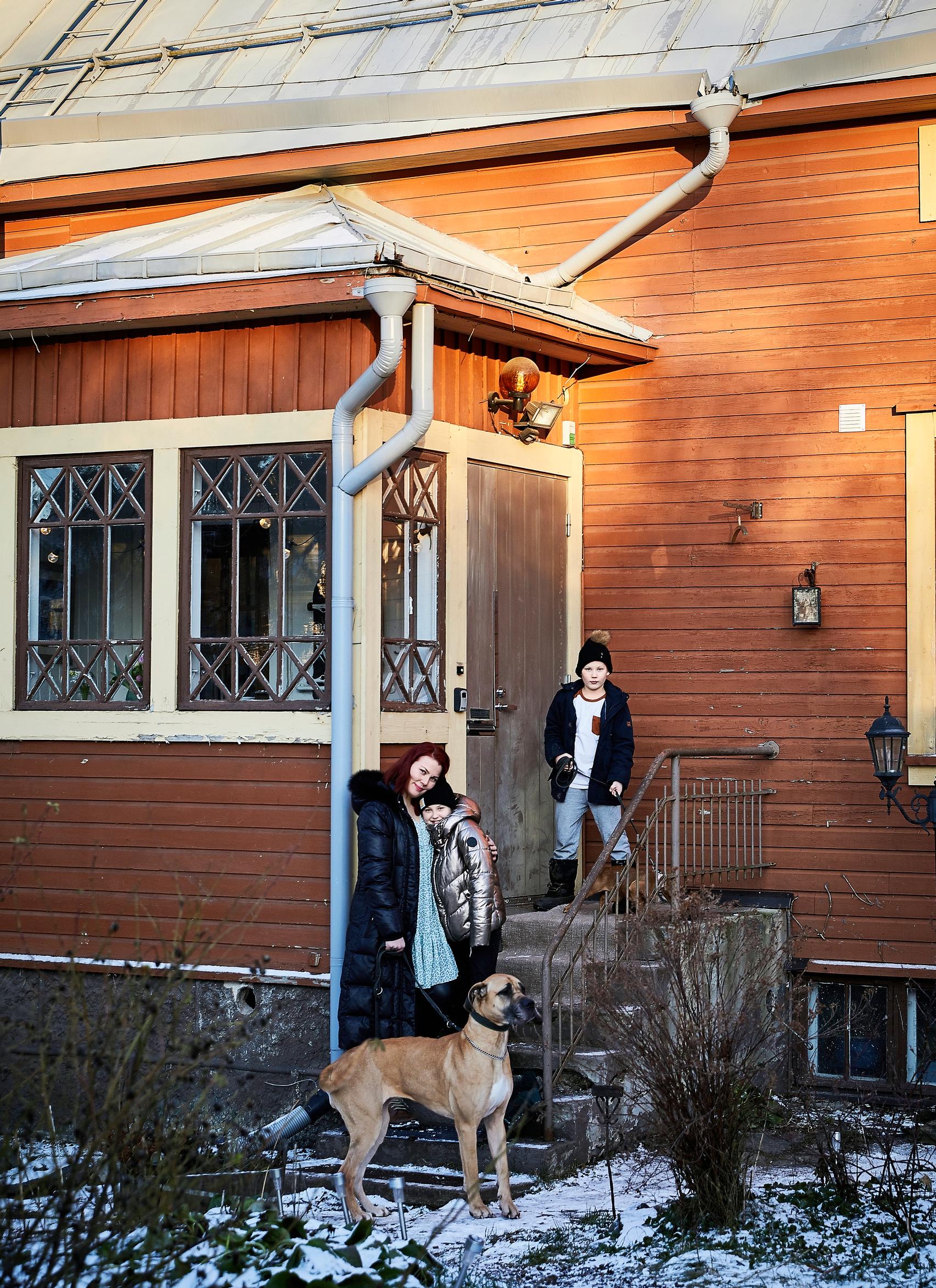 Julia ja lapset Hilda ja Wäino sekä Lyyli-koira sisäänkäyntinä toimivan lasiverannan edessä. Keskikerroksessa on asuintilat ja alakerrassa sauna, pesu- ja kodinhoitotilat, verstaat ja suuri biljardihuone. Asuineliöitä on 250 ja huoneita keittiön ja aulan lisäksi 10. Ullakkokerrosta remontoidaan, ja siellä on jo vintagemyymälä. Julia vierastaa talon ruskeaa väriä, joten se on saamassa kauniin harmaan maalisävyn.