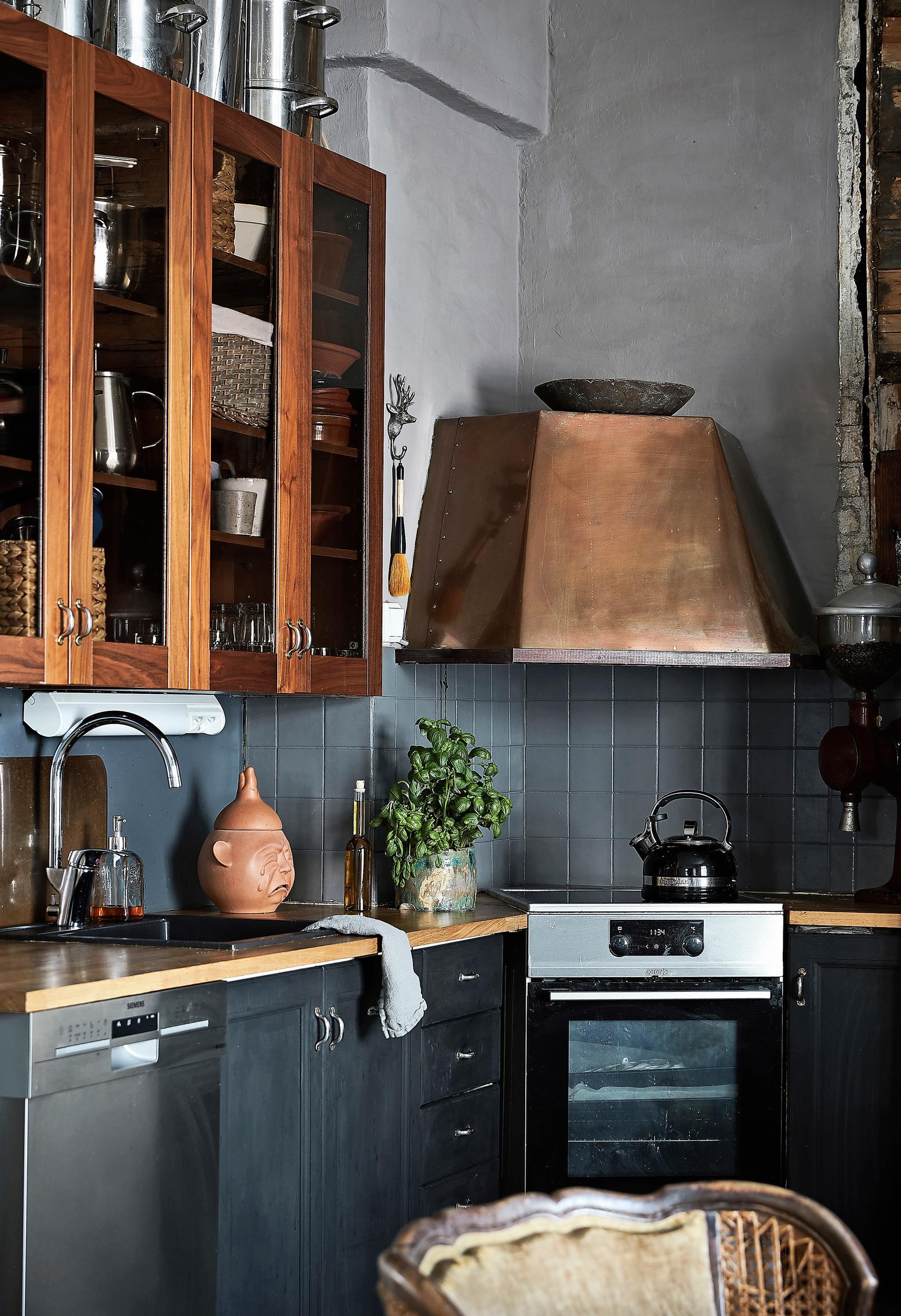 Julia maalasi keittiön alakaapit mattamustiksi luonnonmaalilla. Lattiaan vaihdettiin mustavalkoinen ruutukuosi, kun vanha lattia kastui pesukoneen rikkoonnuttua. Teppo on teräsmies eli tekee metallimiehen töitä ja on valmistanut kaikki kodin metalliset detaljit, kuten tiskialtaan kuparisen taustalevyn sointumaan talon alkuperäiseen huuvaan.