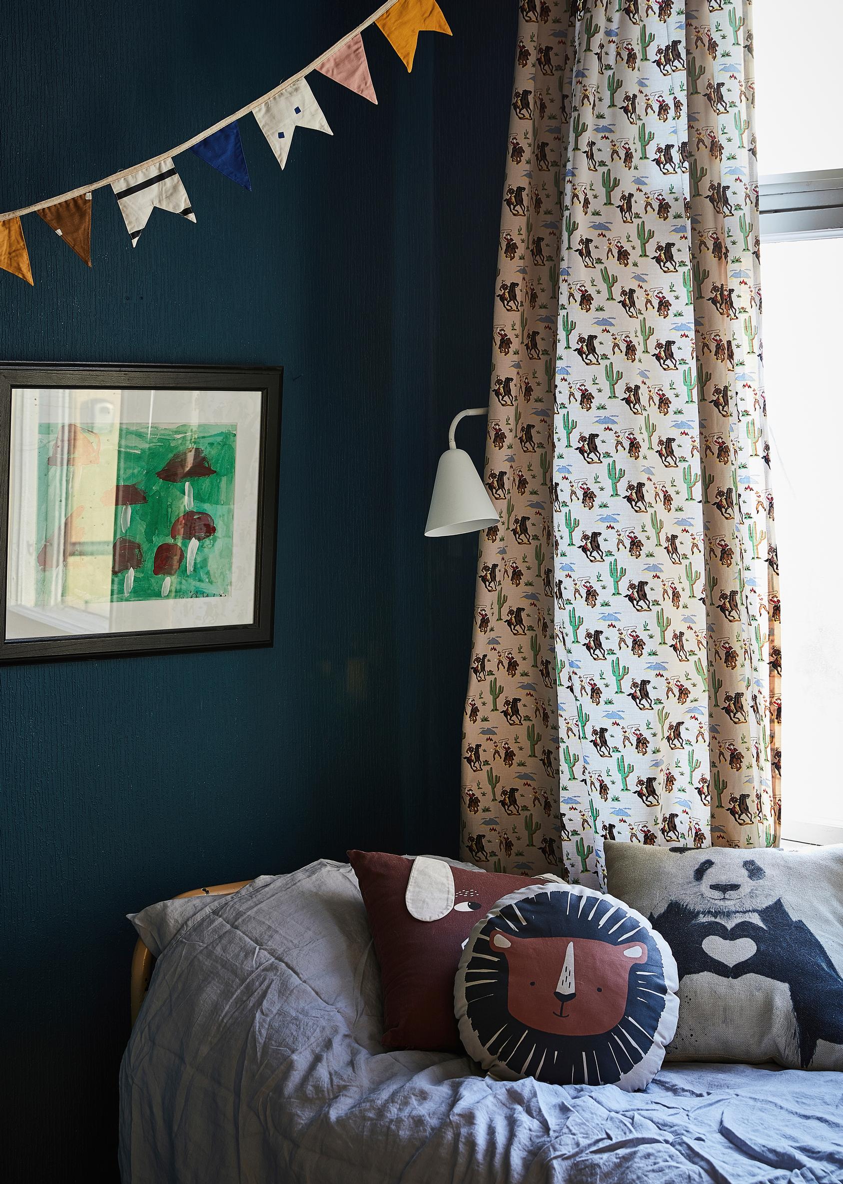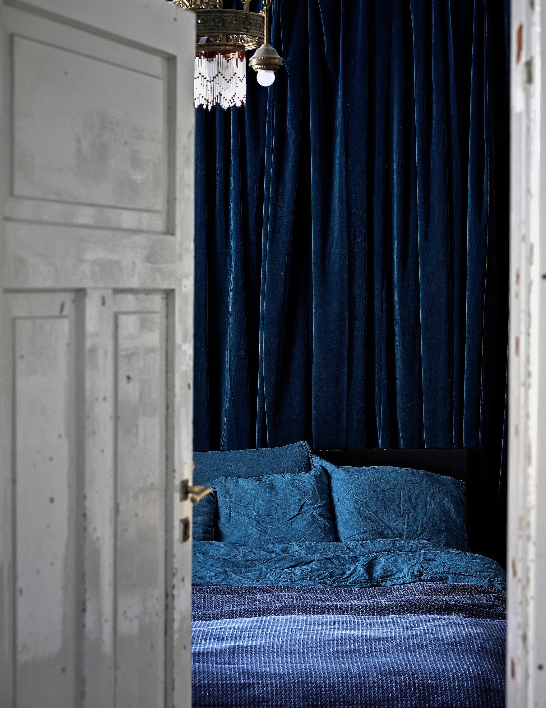 Voimakkaat siniset ja punaiset viehättivät perhettä jo edellisessä vanhassa talossaan. Julian ja Tepon makuuhuoneen sävymaailma on syvänsininen. Julia peitti taustaseinän muhkeilla samettiverhoilla. Antiikkivalaisin on saatu lahjaksi ystävältä.