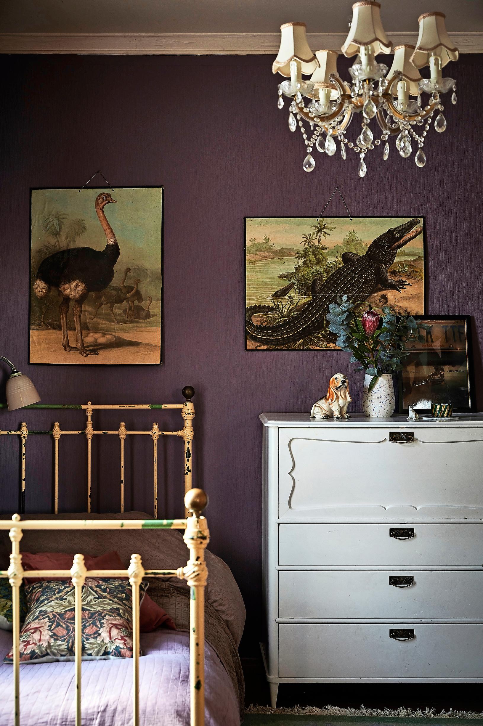 Hilman huone sai seiniin violetin sävyn, kun Julia etsi ratkaisua, kuinka raikastaisi tummanruskeaksi maalatun puulattian. Maalisävy on Vintron Wild Heather Värisilmästä. Nyt sävyt toimivat yhdessä ja lattia näyttää ihan erilaiselta. Vanha sänky ja taulut ovat Parolan aseman antiikkimarkkinoilta. Myös lipasto on ostettu käytettynä.