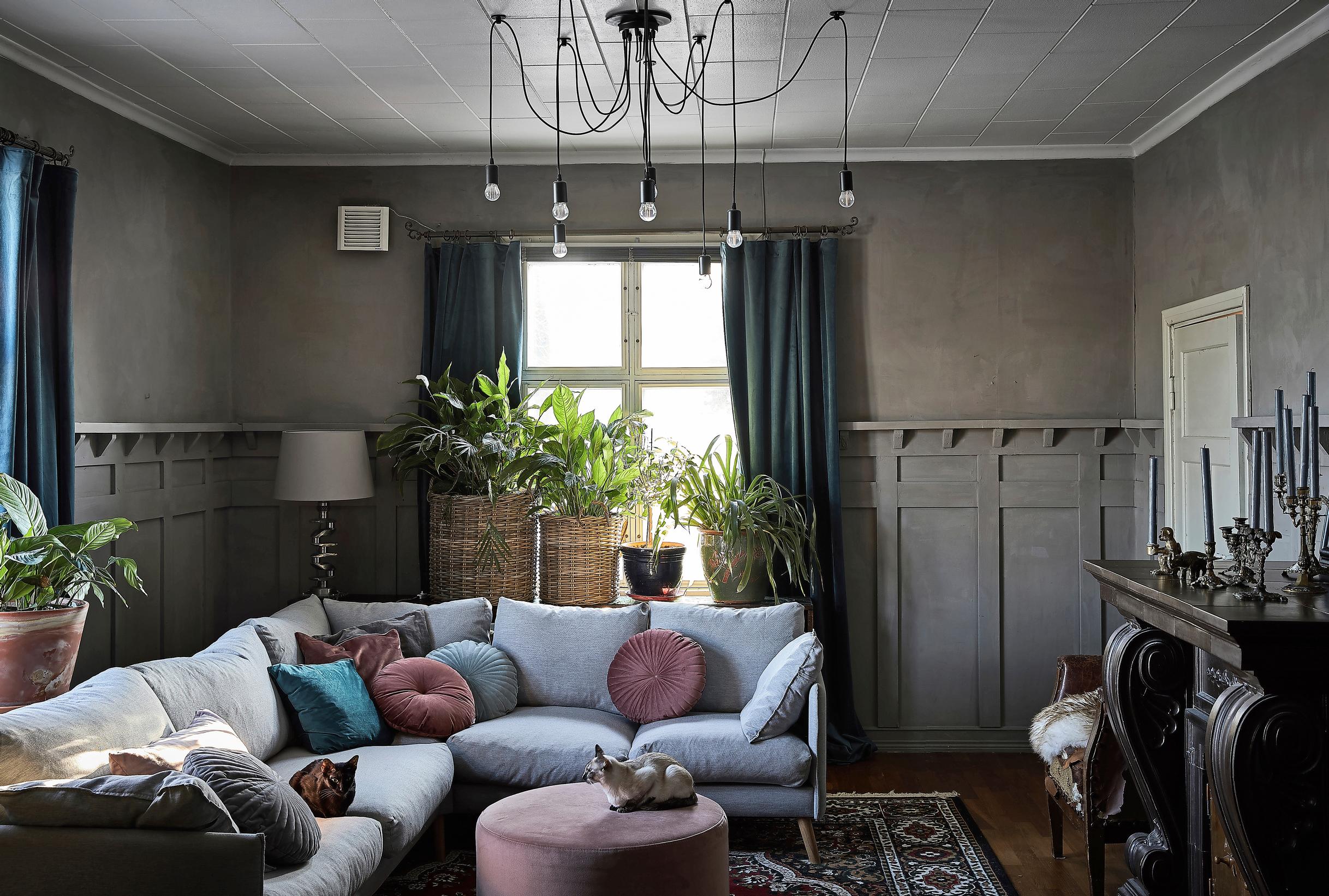 Museomaisuutta välttääkseen Julia yhdistää uutta vanhaan. Moderni Belluksen sohva sopii hyvin kontrastiksi vanhoille seinäpaneeleille ja alkuperäiselle manttelitakalle. Sohva ja rahi ovat Maskusta ja ainoat kotiin uutena hankitut kalusteet. Niillä pötköttelevät Batman ja Kuittinen. Valtava matto on paikalliselta kirpputorilta. Paneelit Julia löysi ja purki vanhasta kartanosta. Tapetti ja paneelit saivat uuden sävyn Julian sekoittamalla Domus Naturan harmaalla savimaalilla. Kattovalaisin on American Vintage Industrialin.