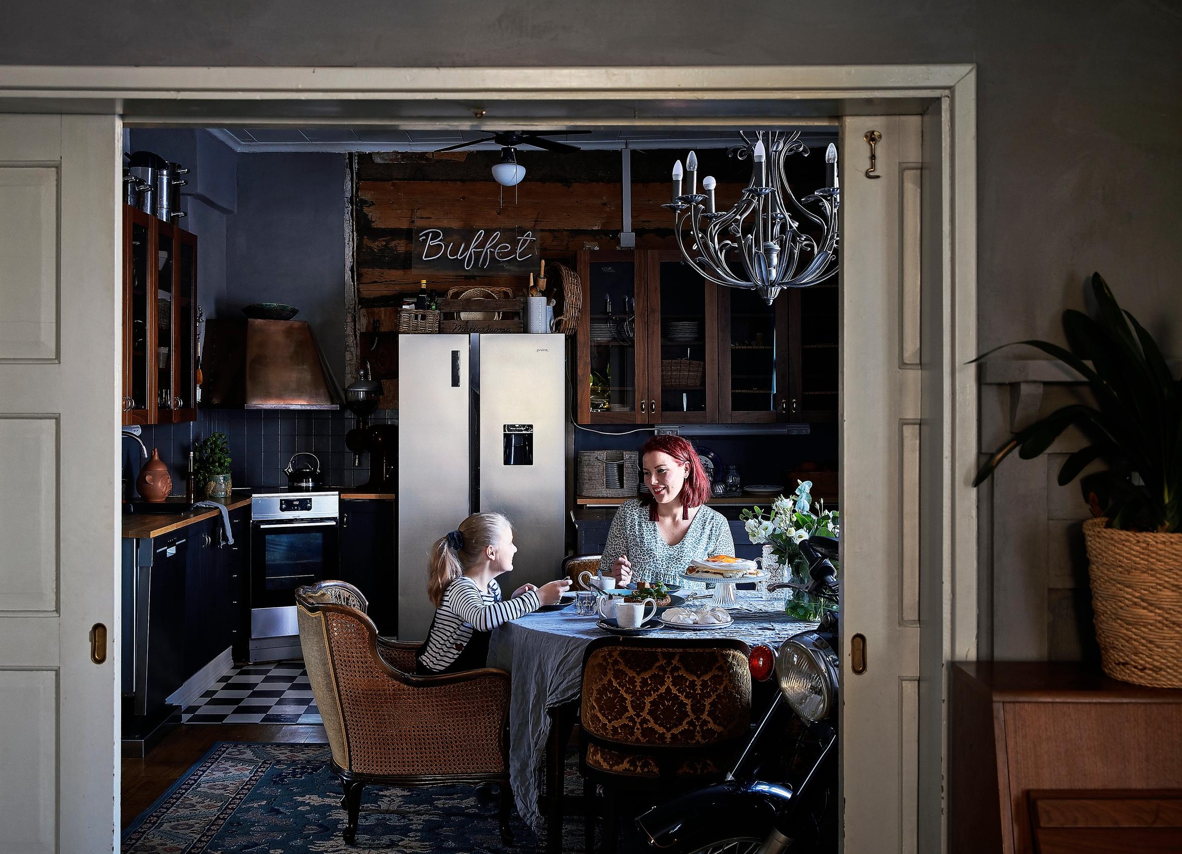 Keittiön ja olohuoneen välissä on suuri oviaukko, jonka upeat liukuovet perhe huomasi vasta taloon muuttaessaan. Ovet piiloutuvat seinien sisään. Ruokapöydän päässä olevan tuolin Julia löysi edullisesti Suomen kasarmin aarteet -kirpputorilta. Keittiön seinät ystävä Katja sävytti tupaantuliaislahjana Domus Naturan savimaalilla, joka on sivelty vanhan tapetin päälle.