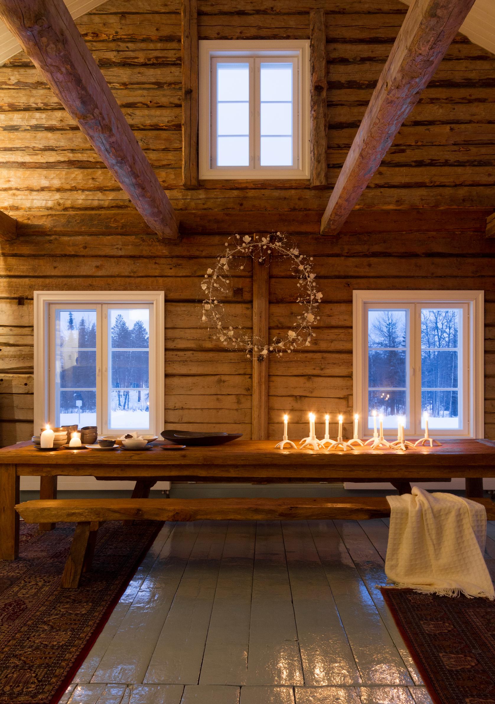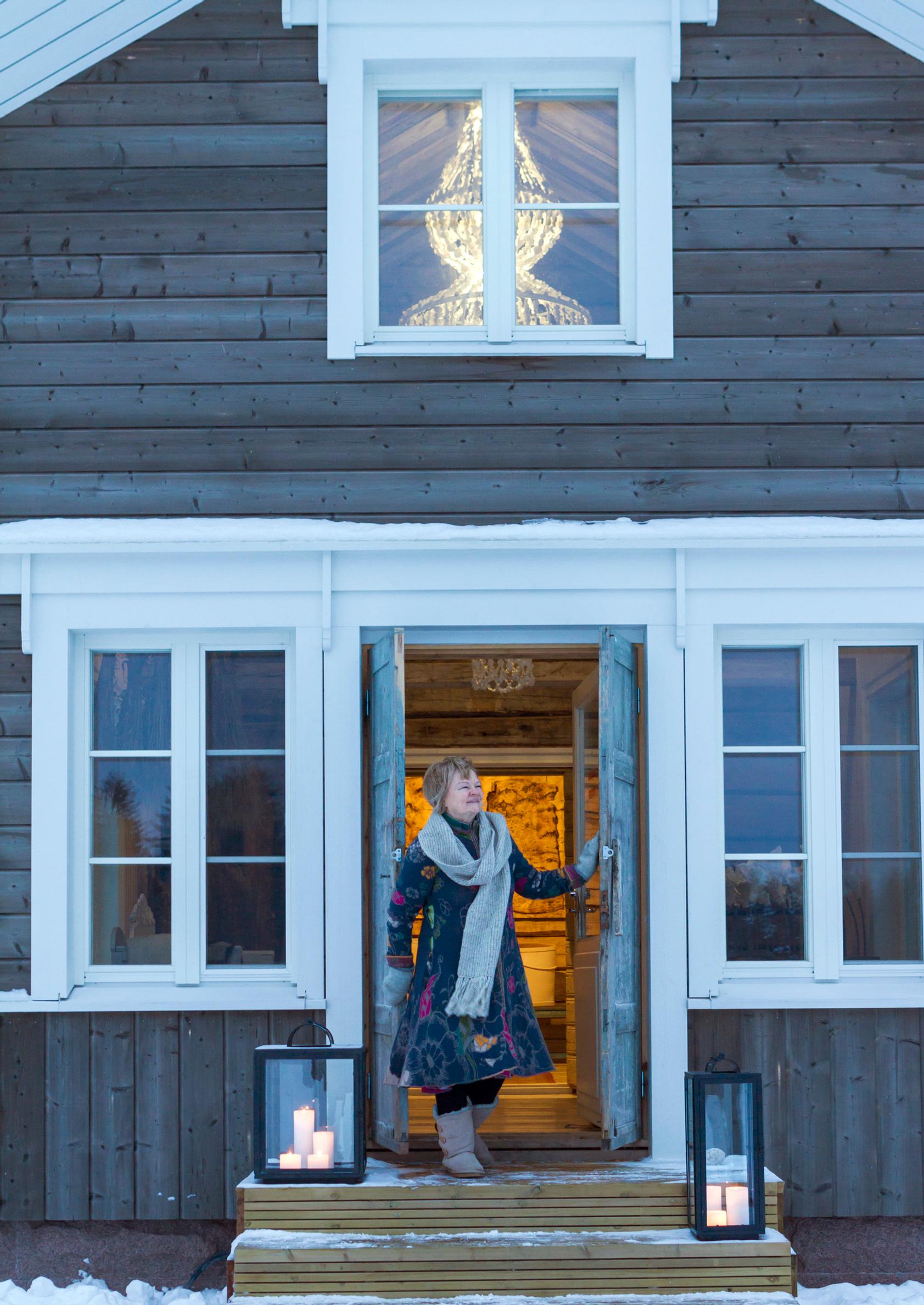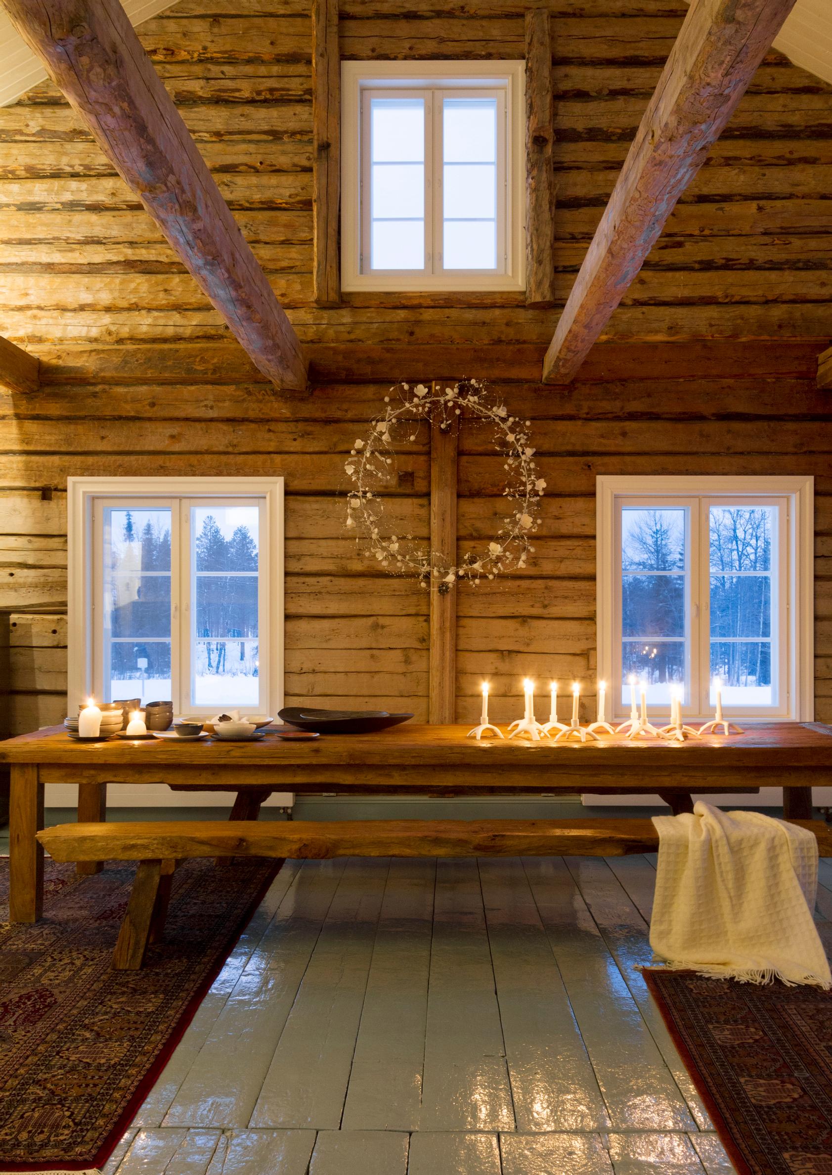 Taloa ympäröi sinertävä, satumainen valo. Jos hyvin käy, Timisjärven yllä viihtyvät revontulet näyttäytyvät pian täydessä loistossaan. Sisällä Anu sytyttää kynttilöitä jokaiseen huoneeseen. Ne heijastuvat kauniisti patinoituneista, himmeistä hirsiseinistä ja kiiltäväksi maalatuista lattialankuista.