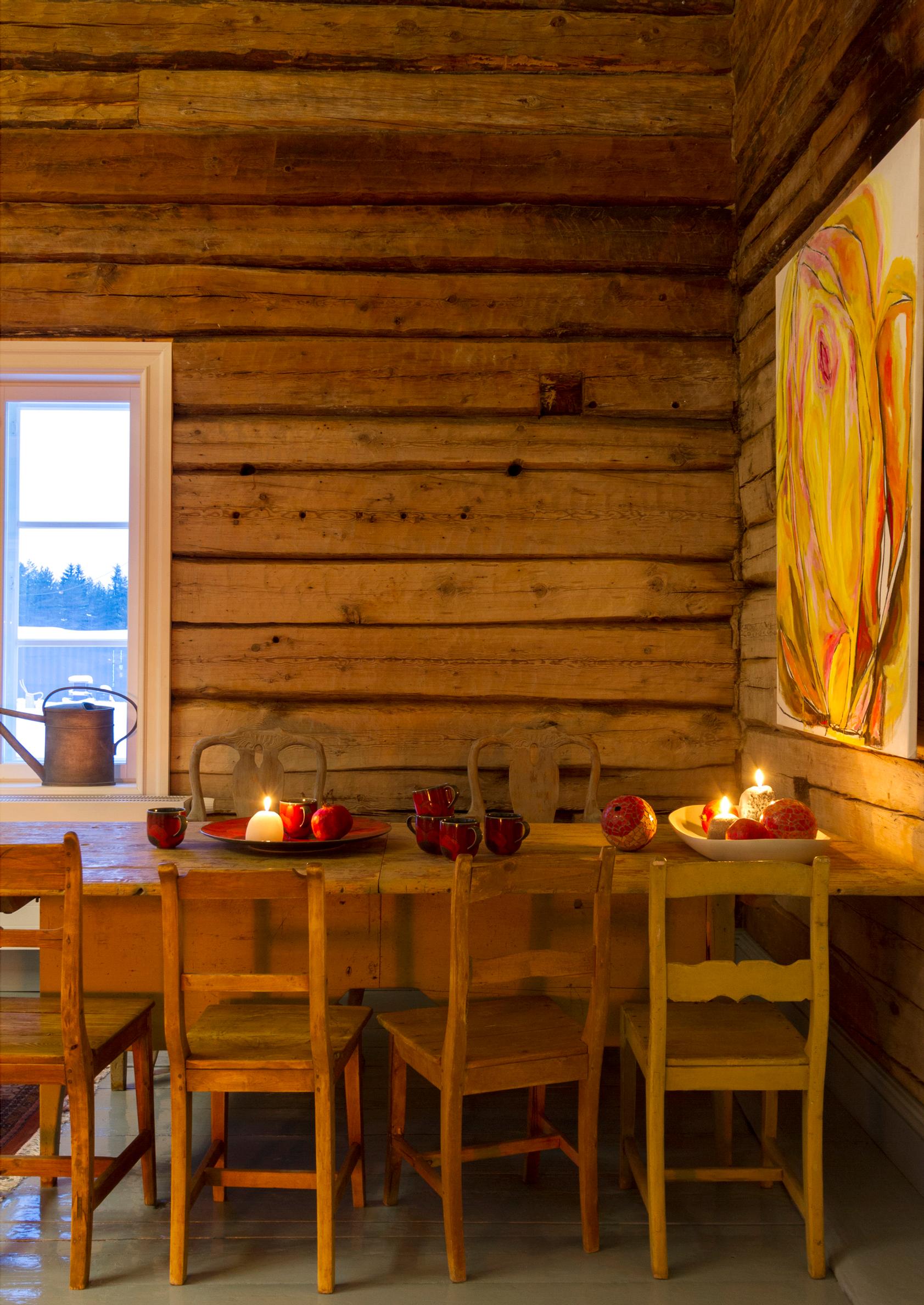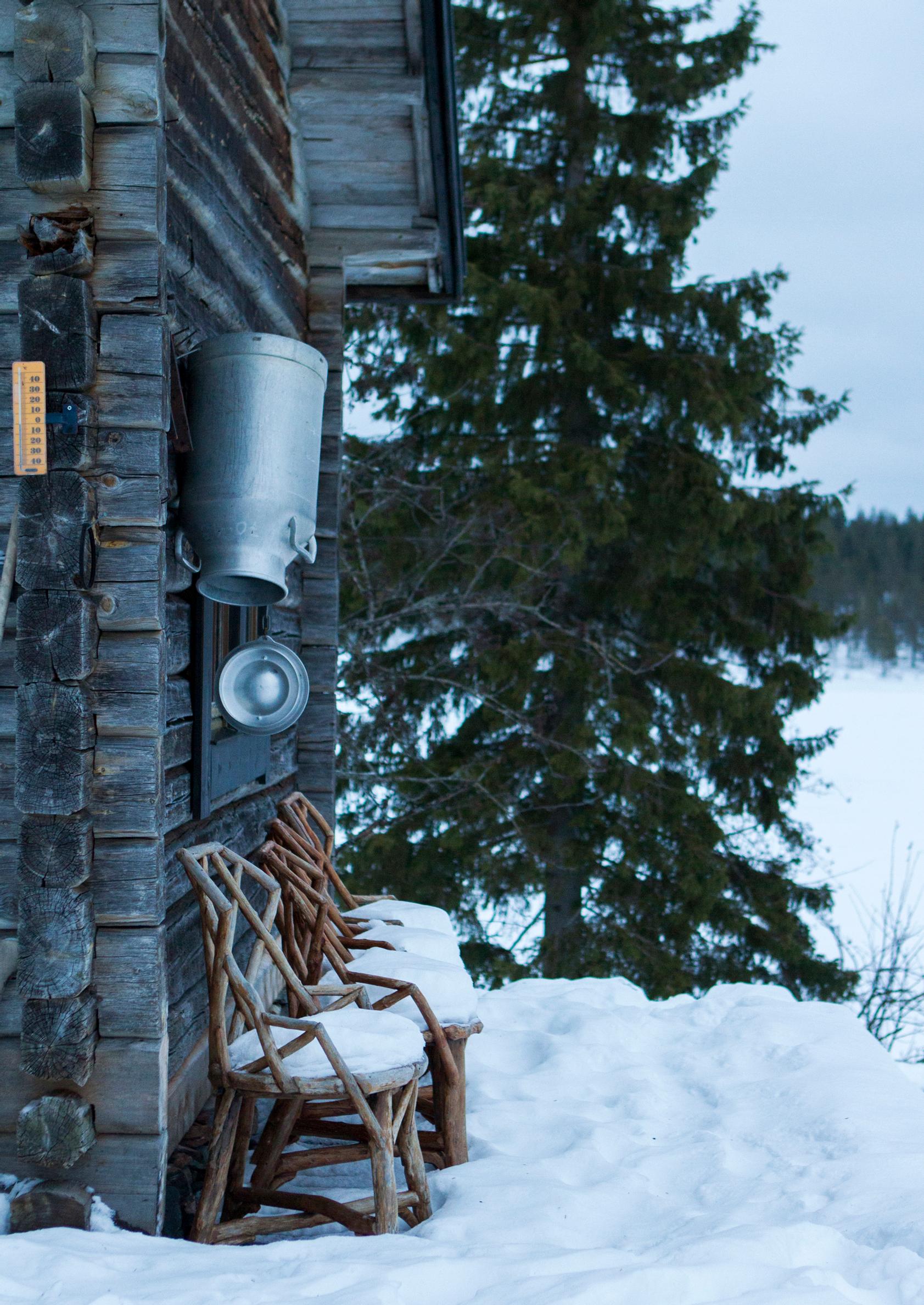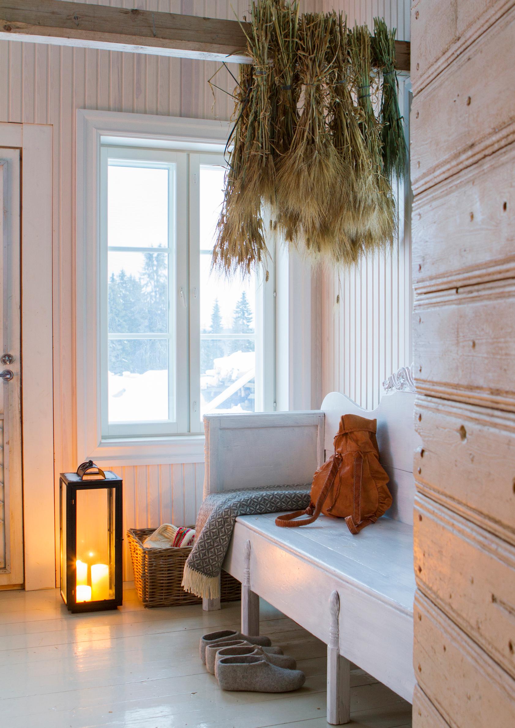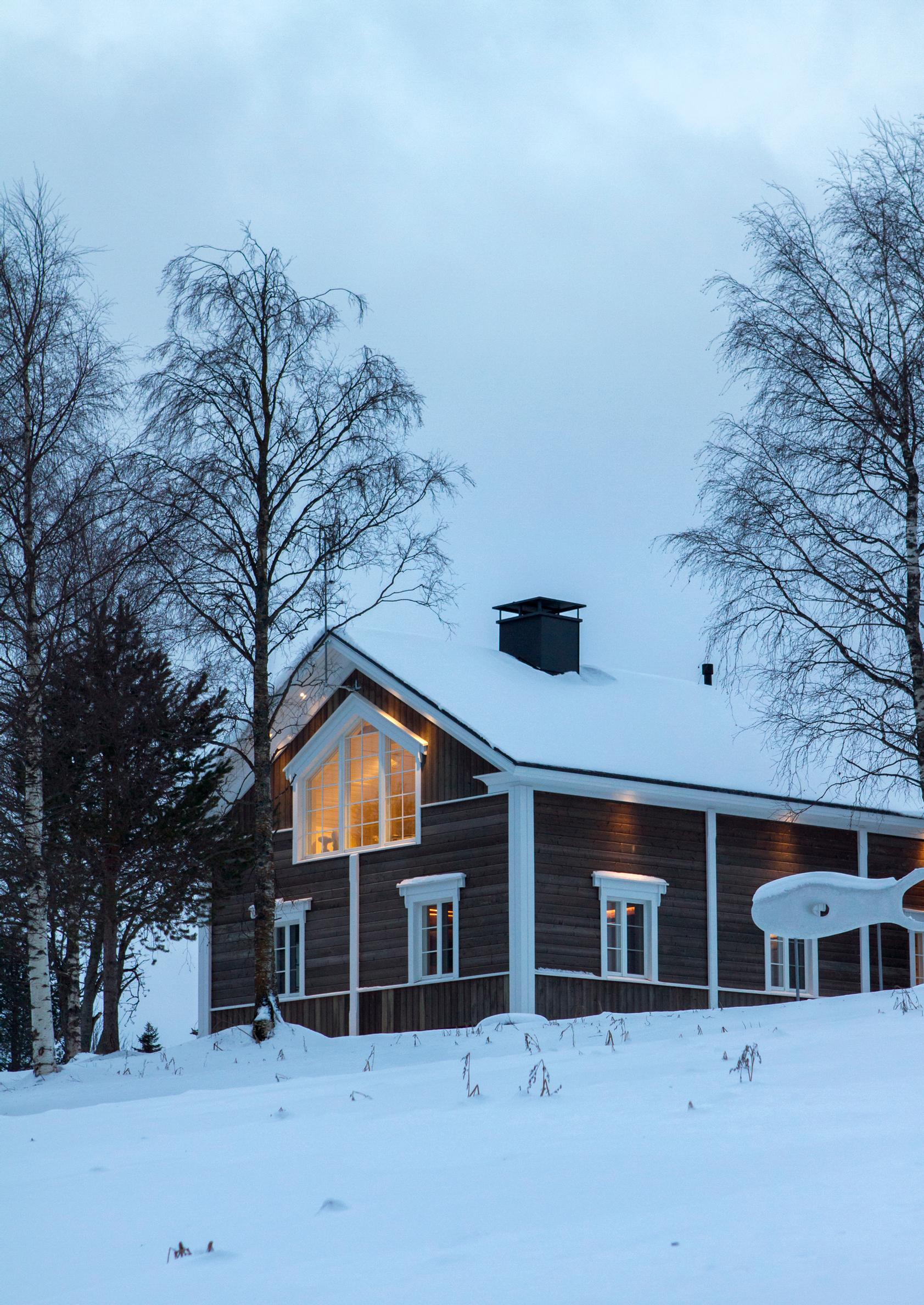 Taloa ympäröi sinertävä, satumainen valo. Jos hyvin käy, Timisjärven yllä viihtyvät revontulet näyttäytyvät pian täydessä loistossaan. Sisällä Anu sytyttää kynttilöitä jokaiseen huoneeseen. Ne heijastuvat kauniisti patinoituneista, himmeistä hirsiseinistä ja kiiltäväksi maalatuista lattialankuista.