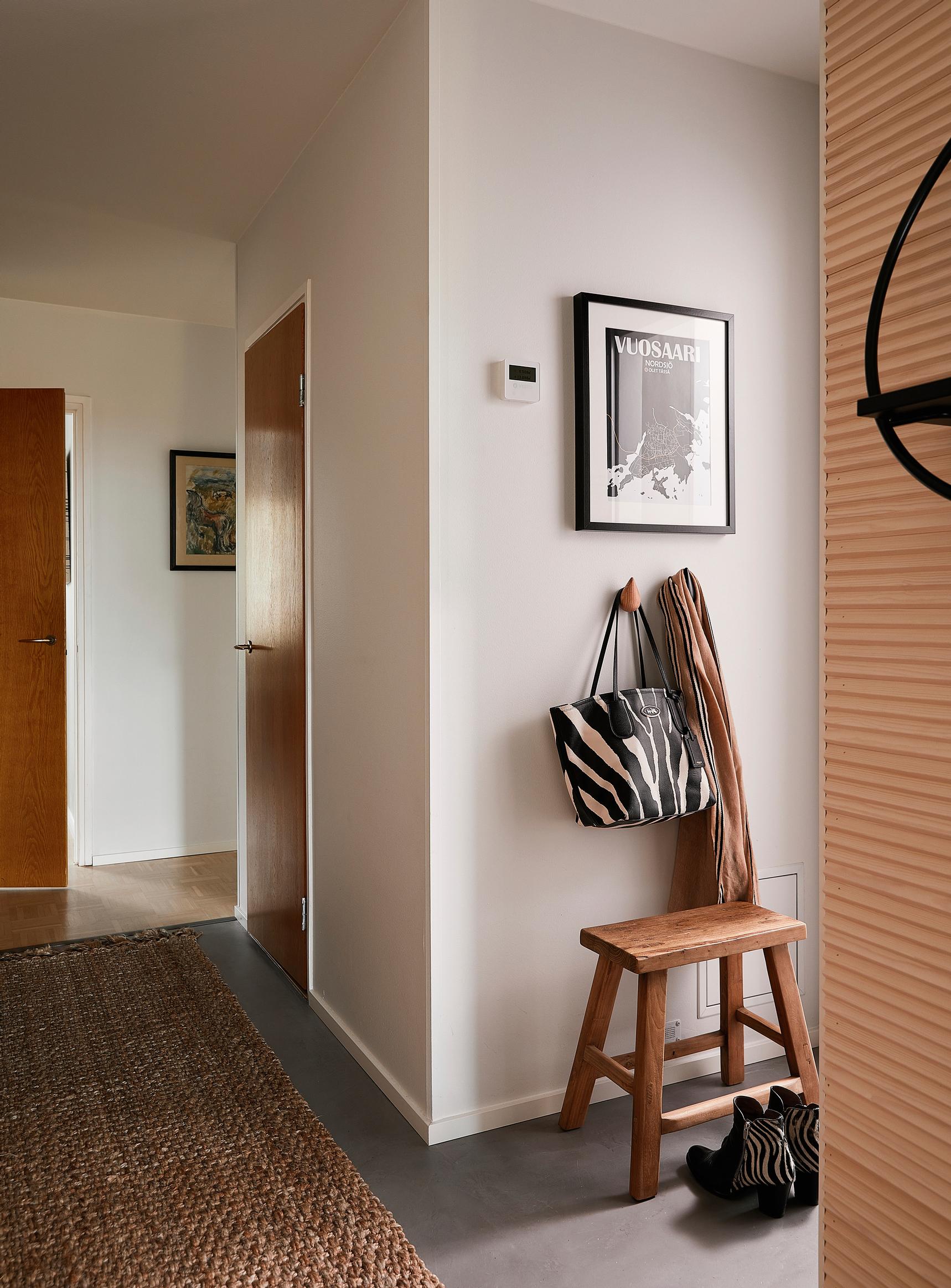 Oli kätevää muuttaa samassa talossa asunnosta toiseen. Sisustaminen oli vaivatonta: siirsimme edellisen kodin huonekalut vain uuteen mittakaavaan. Jouduimme luopumaan muutossa vain muutamista liian suurista kalusteista. Vaikka neliöitä on nyt 50 vähemmän, niitä on yhä toistasataa ja kaikille on oma huone. Tämä asunto sopii elämäntilanteeseemme paremmin.