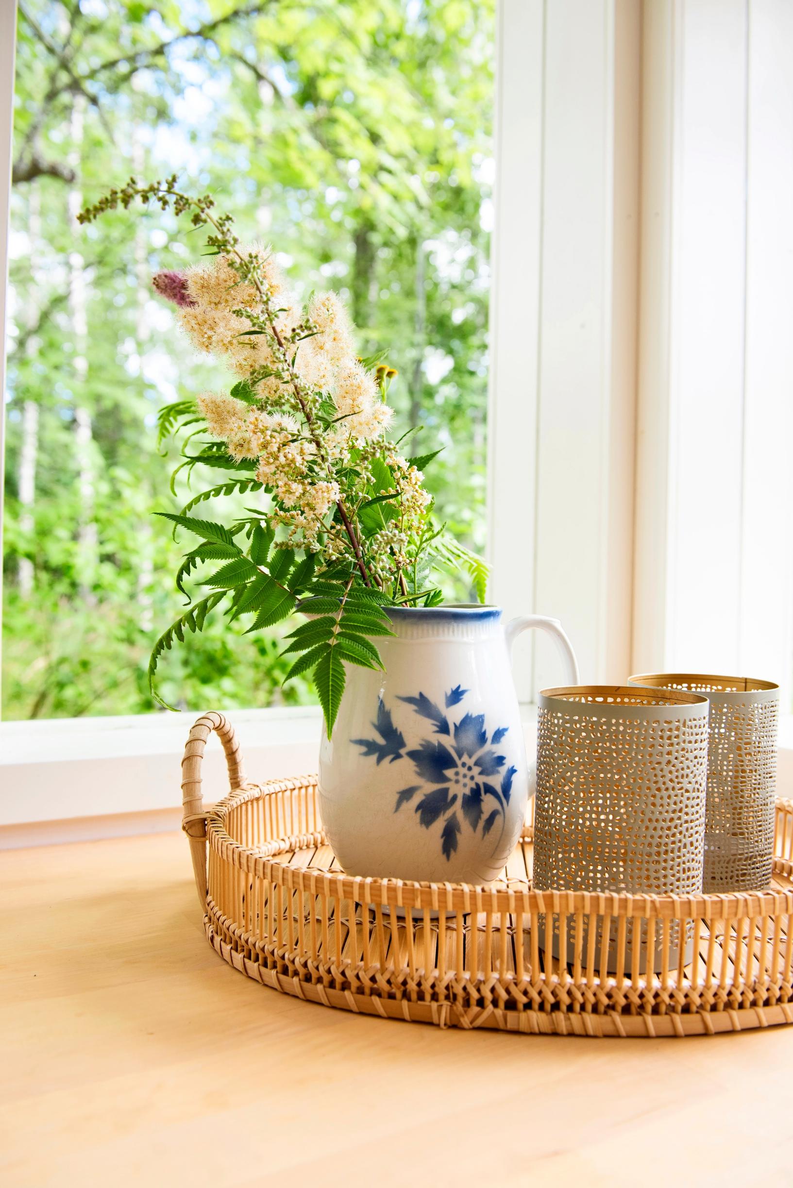 Onko sinulla tapana kerätä luonnonkukkia? Keräämällä kimpun vieraslajeista, kuten lupiinista, autat luontoa ja saat näyttävän kukka-asetelman. Vanha maitokannu istuu kesäisen rentoon tyyliin.
