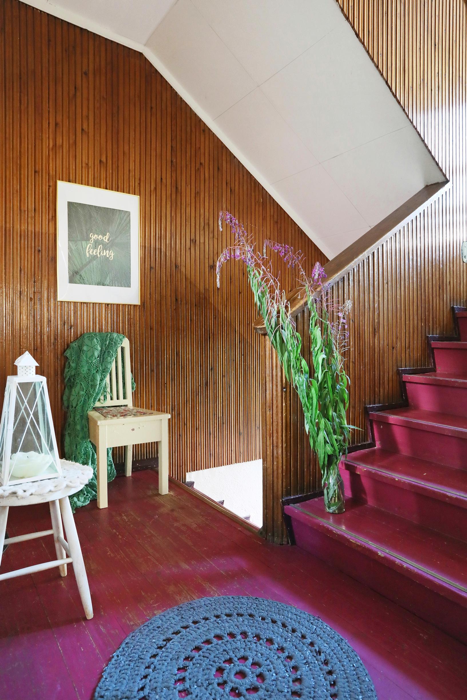 Kun muutimme taloon, se oli alkuperäisessä kunnossa, eikä sitä ollut korjattu pilalle. Vanhempani halusivat palauttaa 1940-luvun tunnelman ja loiston. Taloa on remontoitu vuosien saatossa koko perheen voimin: on poistettu turhia väliseiniä, uusittu pinkopahveja ja tapetoitu seiniä paperitapeteilla. Muovia rakenteista ei löytynyt silloin, eikä löydy nytkään.