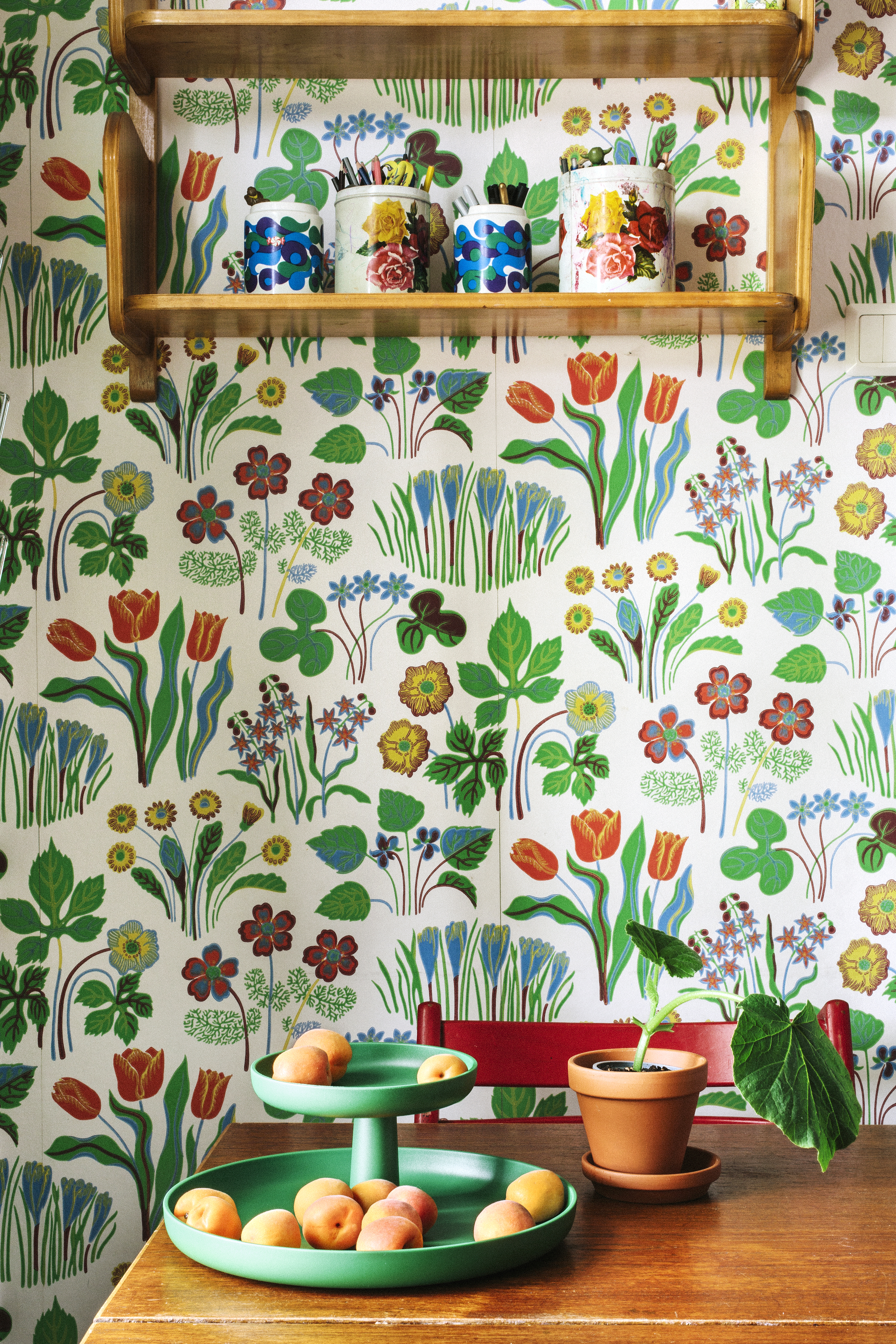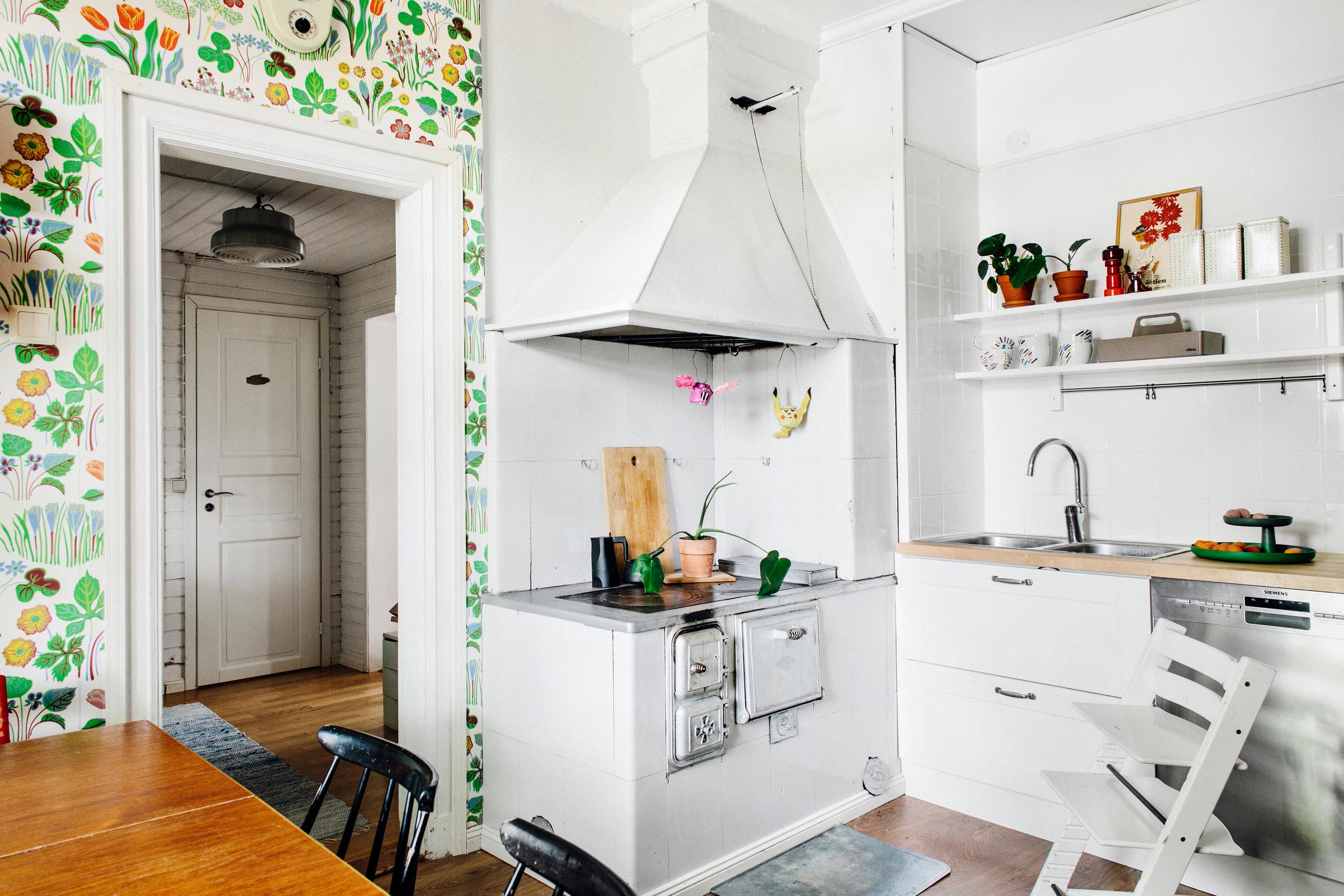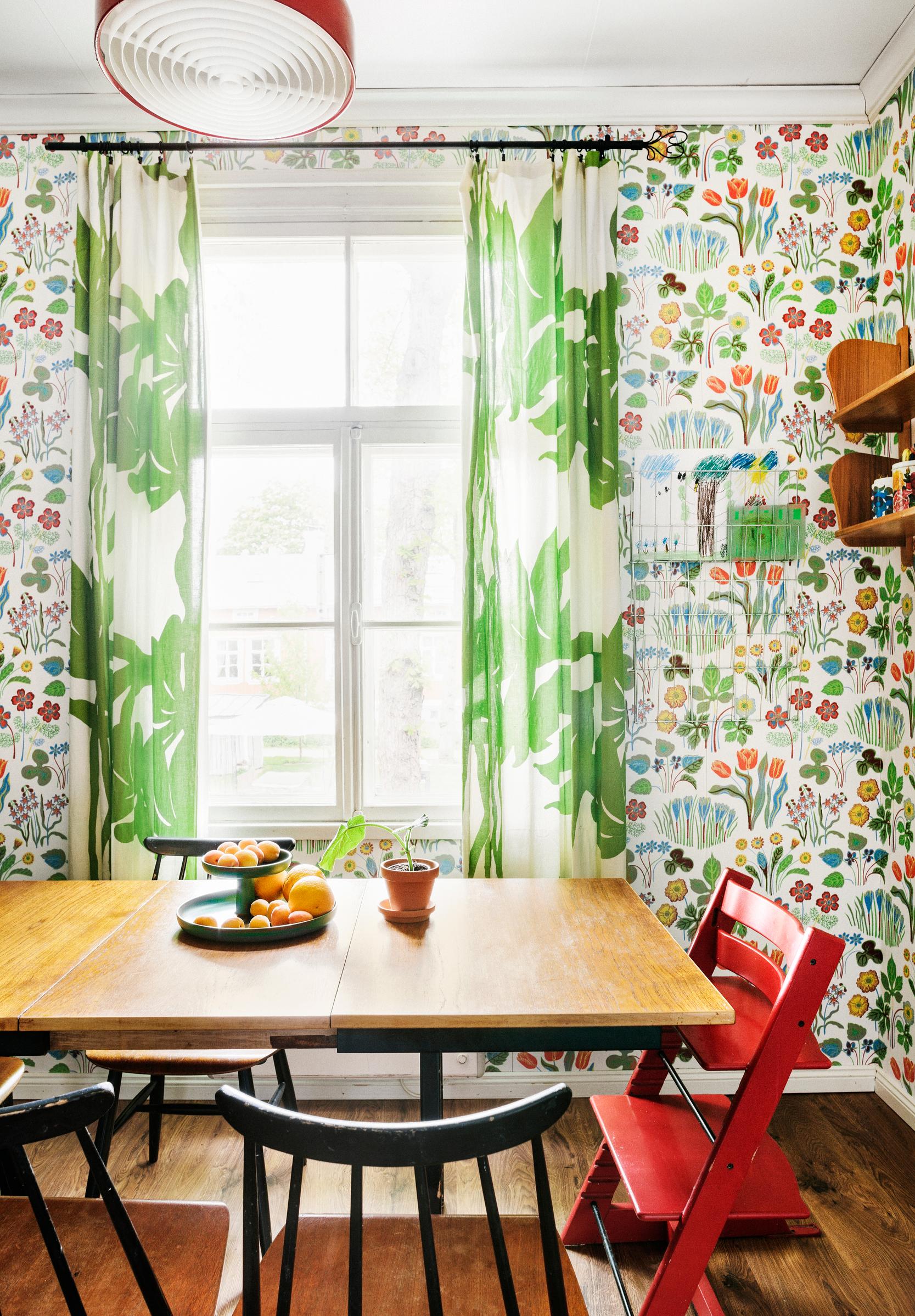 Erican ja Tuomon puutaloasunnossa ei sisusteta tyylipuhtaasti yhden aikakauden mukaan: riittää, että tavarat ovat perheelle sopivia ja kauniita katsella. Fillaripuutarhurin kotiin istuvat riemukkaat kukkatapetit ja viherkasvit.