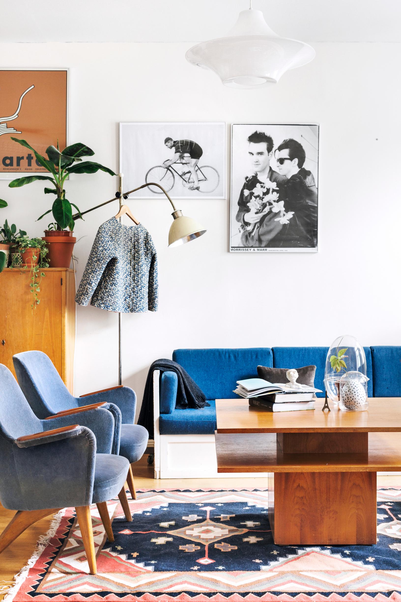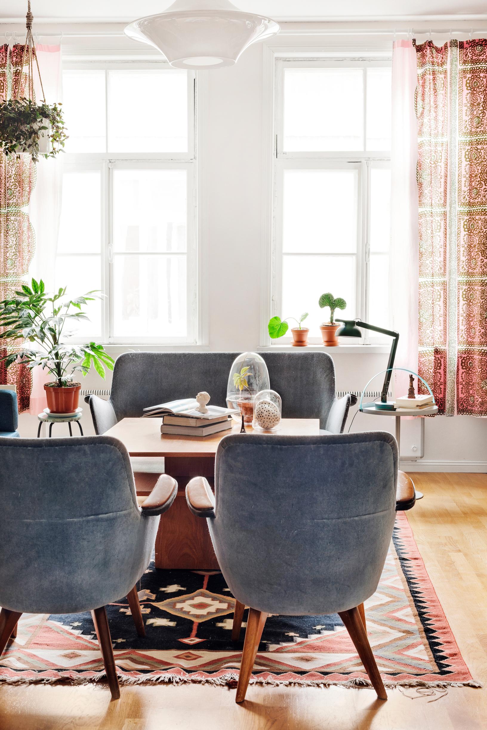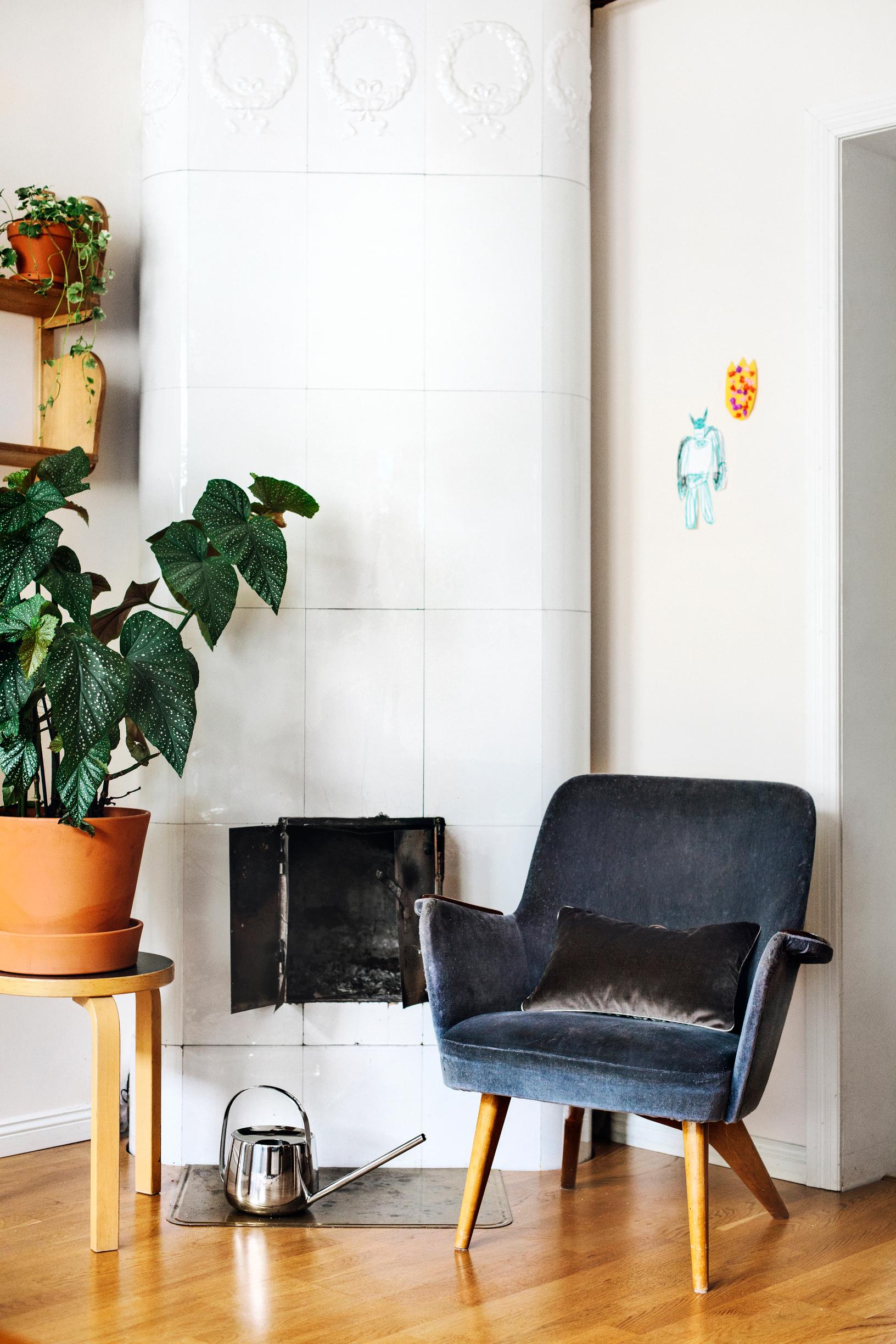 Erican ja Tuomon puutaloasunnossa ei sisusteta tyylipuhtaasti yhden aikakauden mukaan: riittää, että tavarat ovat perheelle sopivia ja kauniita katsella. Fillaripuutarhurin kotiin istuvat riemukkaat kukkatapetit ja viherkasvit.