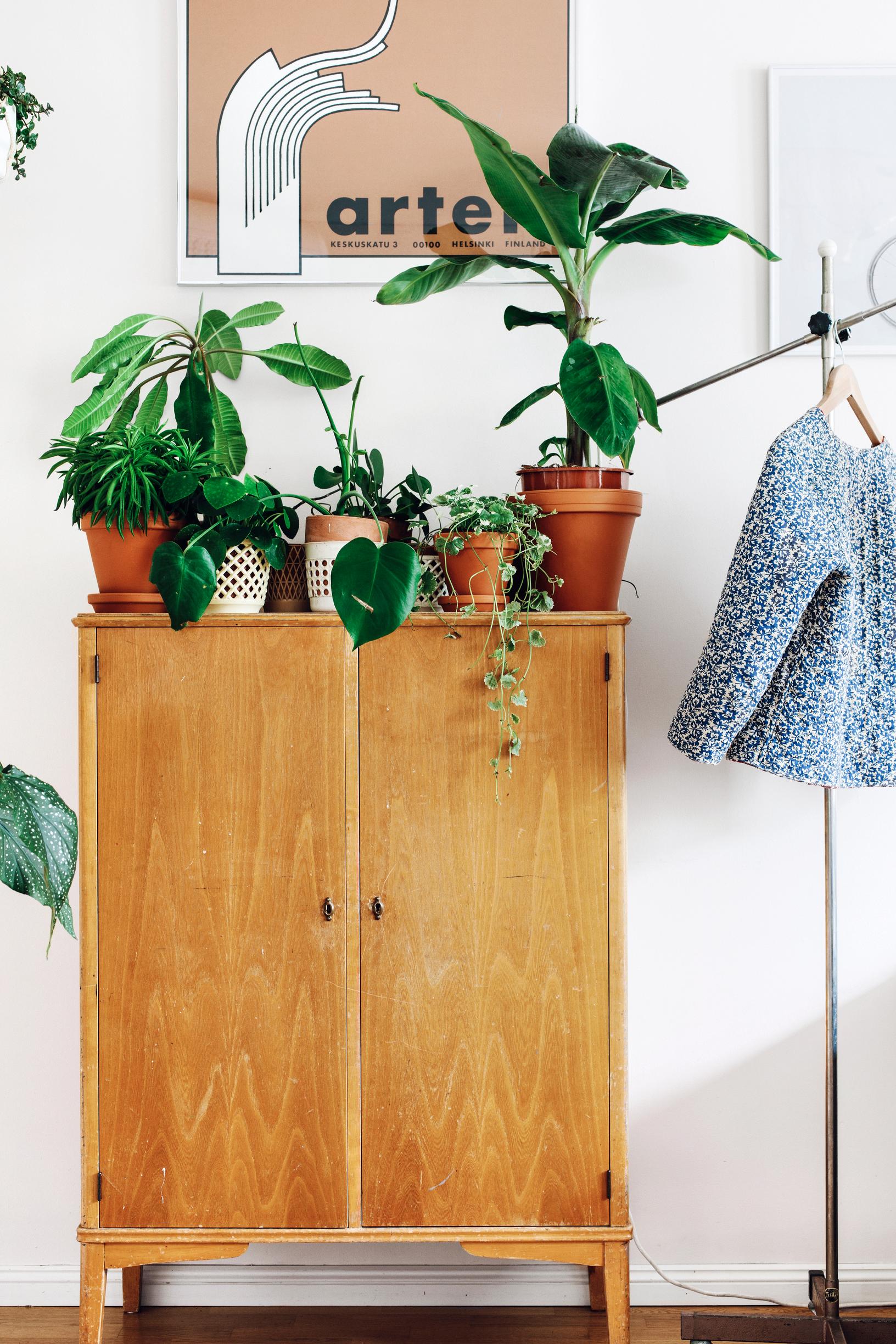 Sisustan kukilla edullisesti. Huoneet näyttävät heti freesimmiltä, kun siellä täällä on vihreää. Uusia pistokkaita saan kierrätysryhmistä.