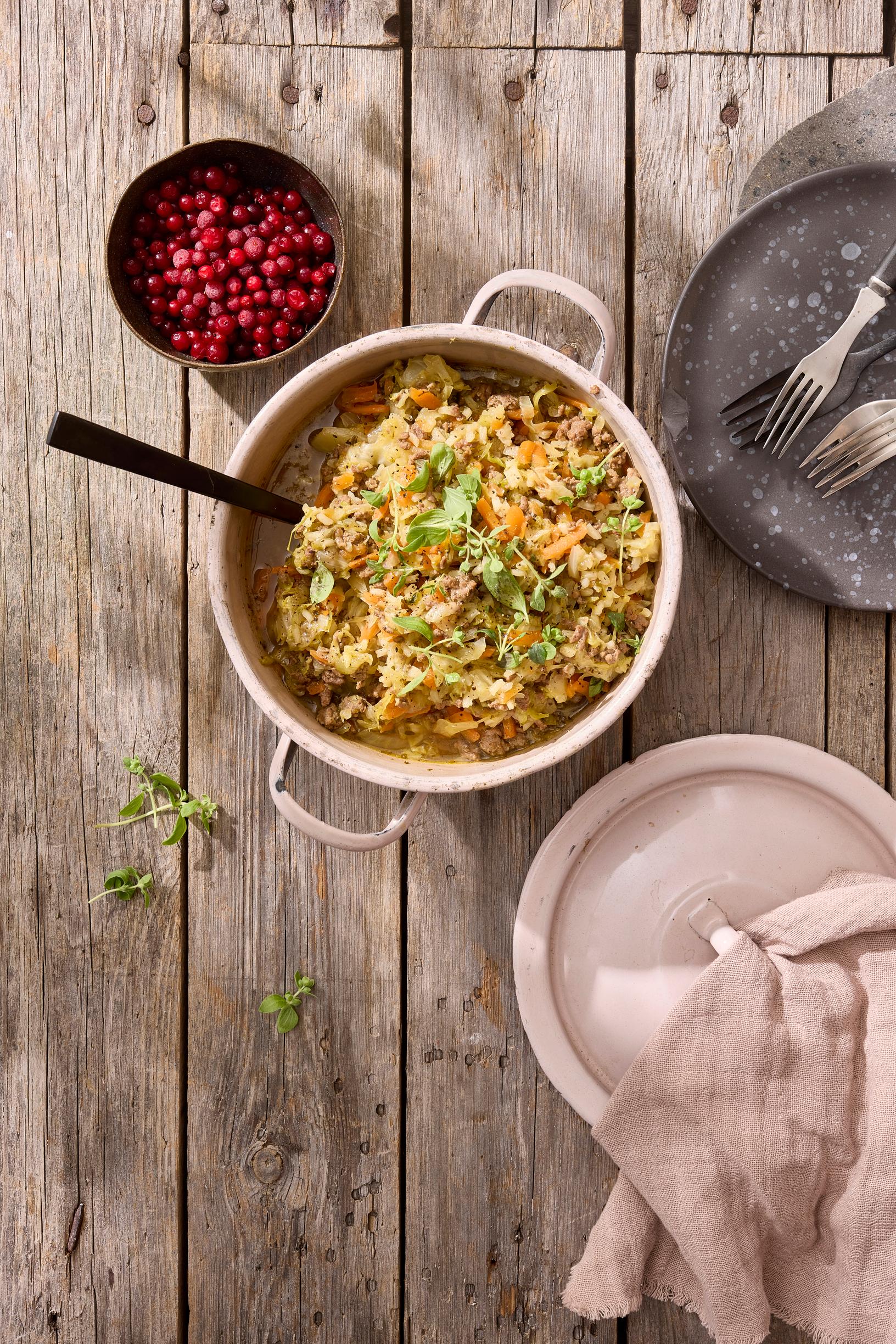 Klassikkolaatikko tehdään nyt hellalla! Kaalilaatikon tutut maut kypsennetään haudutellen hellalla kaalipadaksi. Tässä ruoassa on oikeastaan kaikki yhdessä: proteiini, kasvikset ja hiilarit. Lisukkeeksi tarvitset vain puolukoita!