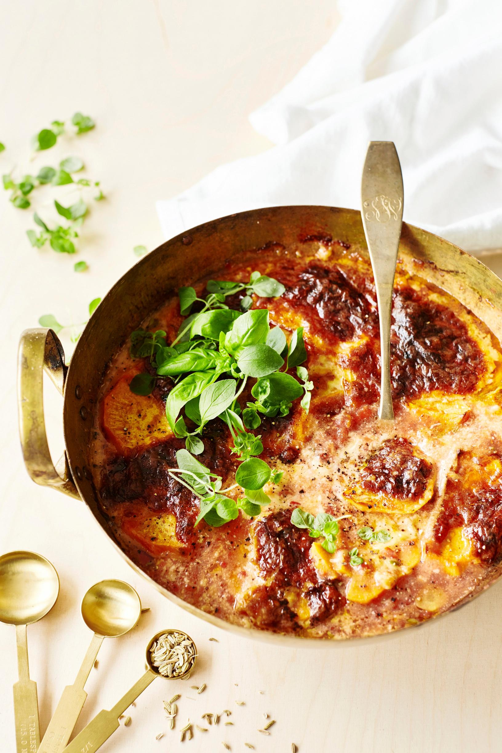 Sekoitusta vaille valmiista kastikkeista ja bataattiviipaleista rakentuu vuokaan mitä mainioin arjen uuniruoka. Bataattilasagnen ohjeen saat täältä.