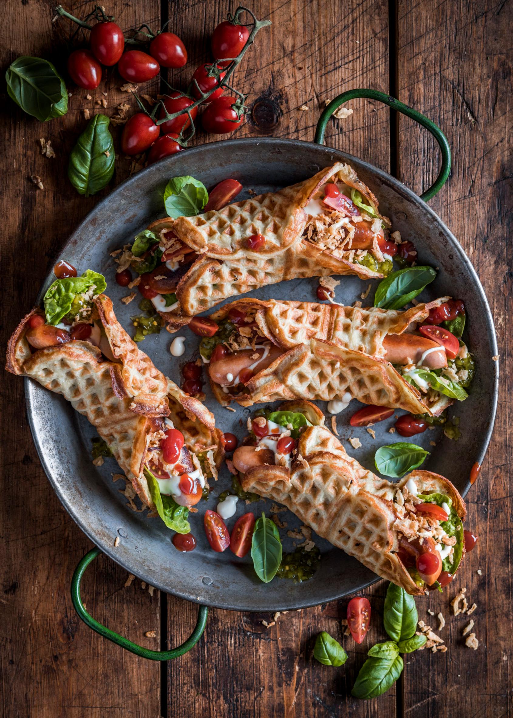 Suolaiset täytteet sopivat vohveleiden kanssa yhtä hyvin kuin makeatkin! Kokeile täyttää vohveli hot dogin tapaan. Kurkista vohvelihodarien ohje täältä.