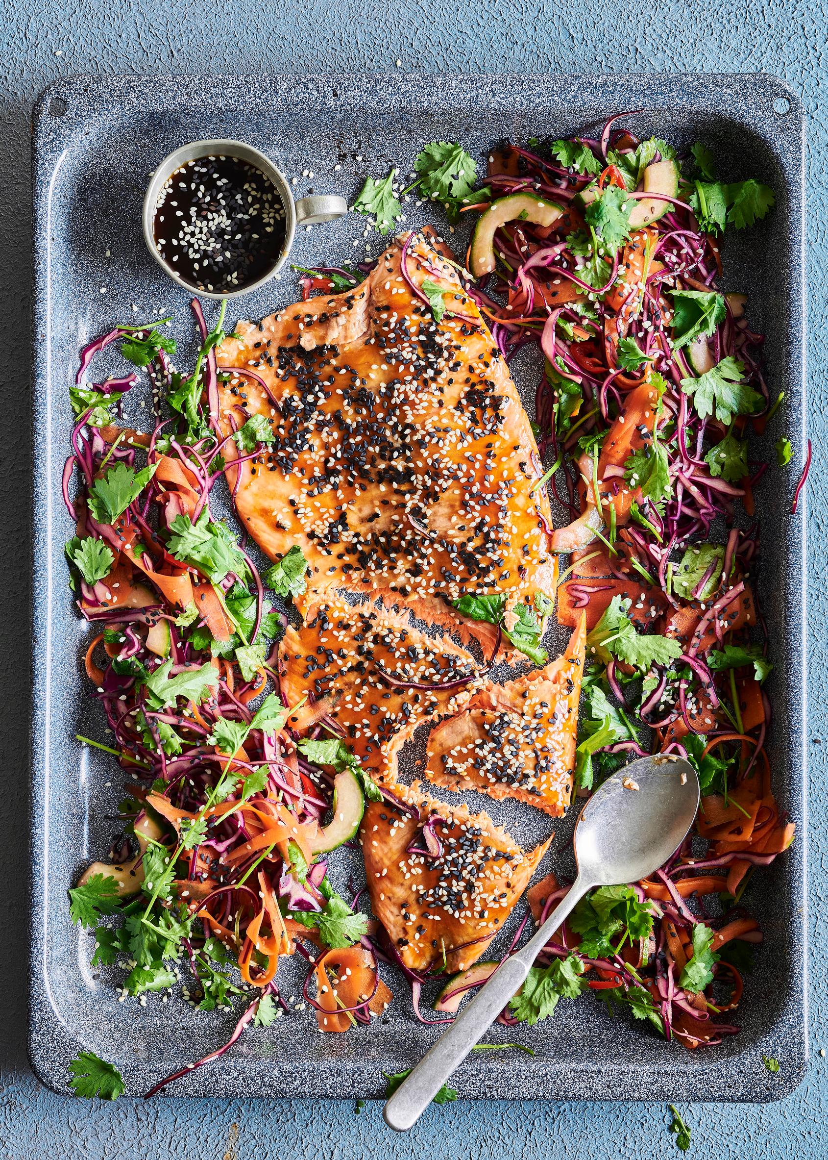 Teriyakikastikeella maustettu uunilohi ja raikas salaatti tekevät arjesta juhlaa. Mikä parasta, tämä ruoka toimii yhtä hyvin niin lämpimänä kuin viileänä. Teriyakilohen resepti löytyy täältä.
